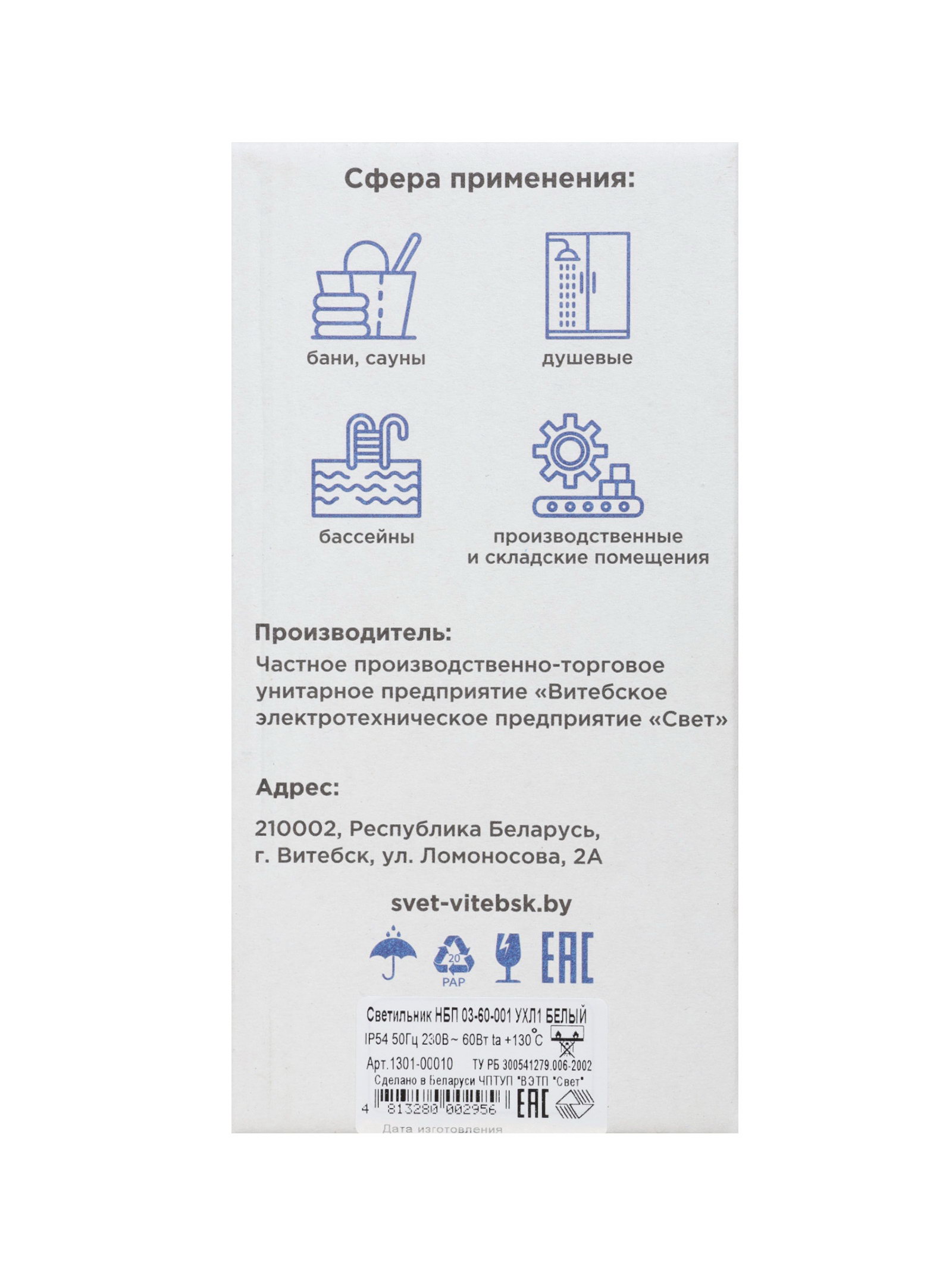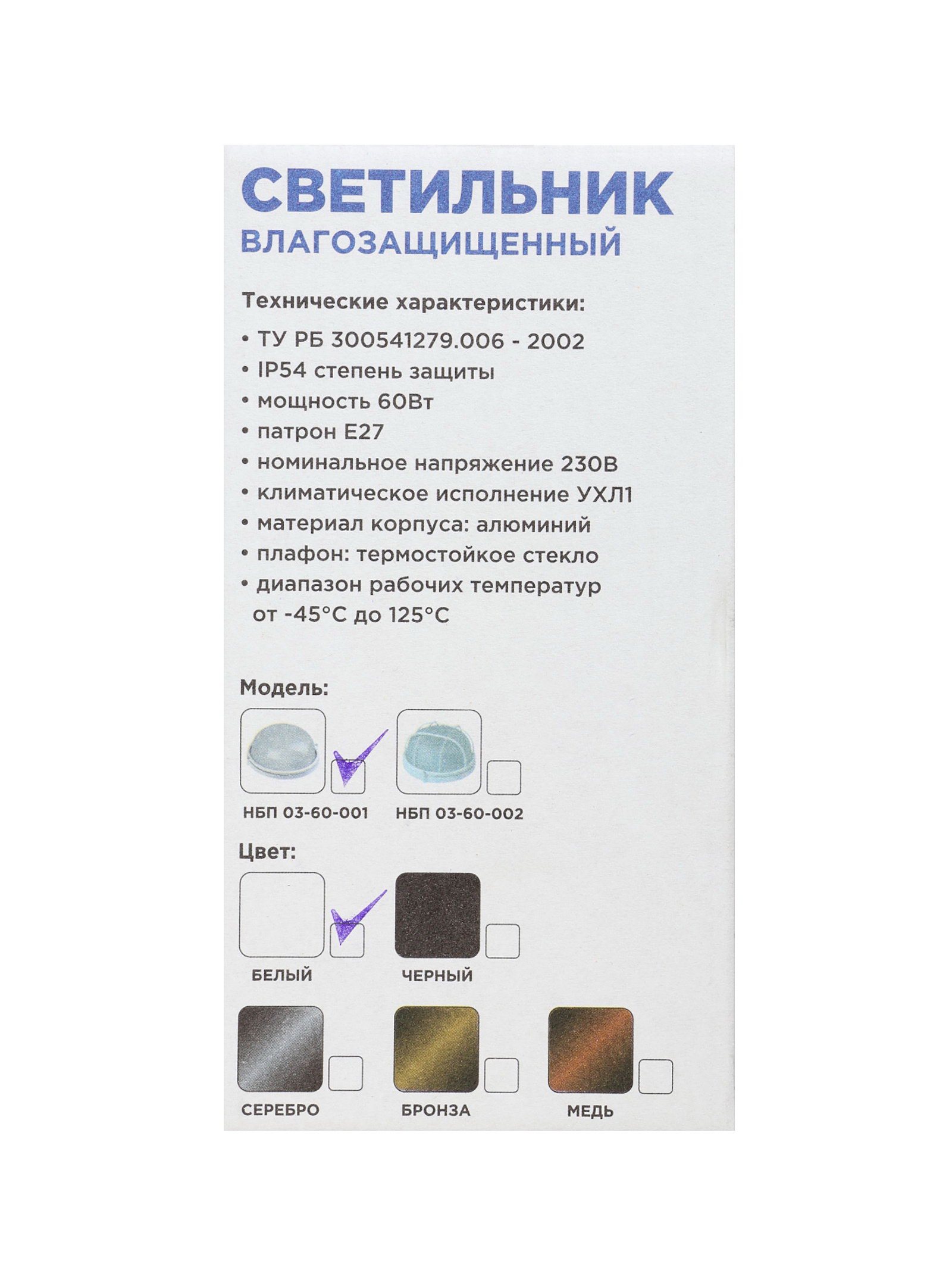 Светильник НБП 03-60-001 УХЛ1, Е27, 60 Вт, 220 В, IP54, до +130°, белый, БелТИЗ, Беларусь