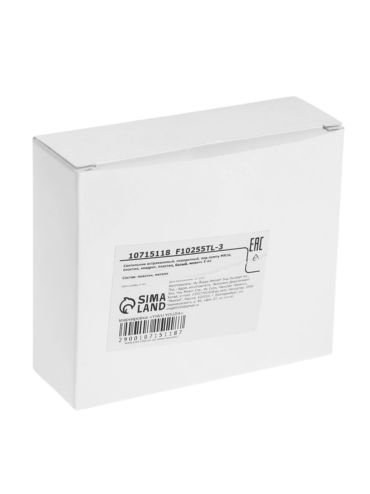 Размер упаковки: 9.2 x 3.5 x 10.5 см. Тип: Встраиваемый Цоколь: GU5.3 (G5.3) Цвет основания: Белый Тип источника освещения: Лампа не в комплекте tnved: 9405920000 tnved: 9405920000 Гарантийный срок, мес.: 6 Встраиваемый светильник под лампу MR-16 с поворотным механизмом позволяет направить свет туда, где это необходимо, обеспечивая гибкость и удобство в использовании. Квадратная форма и белый цвет основания делают этот светильник стильным и незаметным, идеально вписываясь в любой дизайн. Пластиковый корпус обеспечивает легкость, а цоколь GU5.3 (G5.3) позволяет использовать современные лампы, которые не входят в комплект, но легко подбираются под ваши нужды.