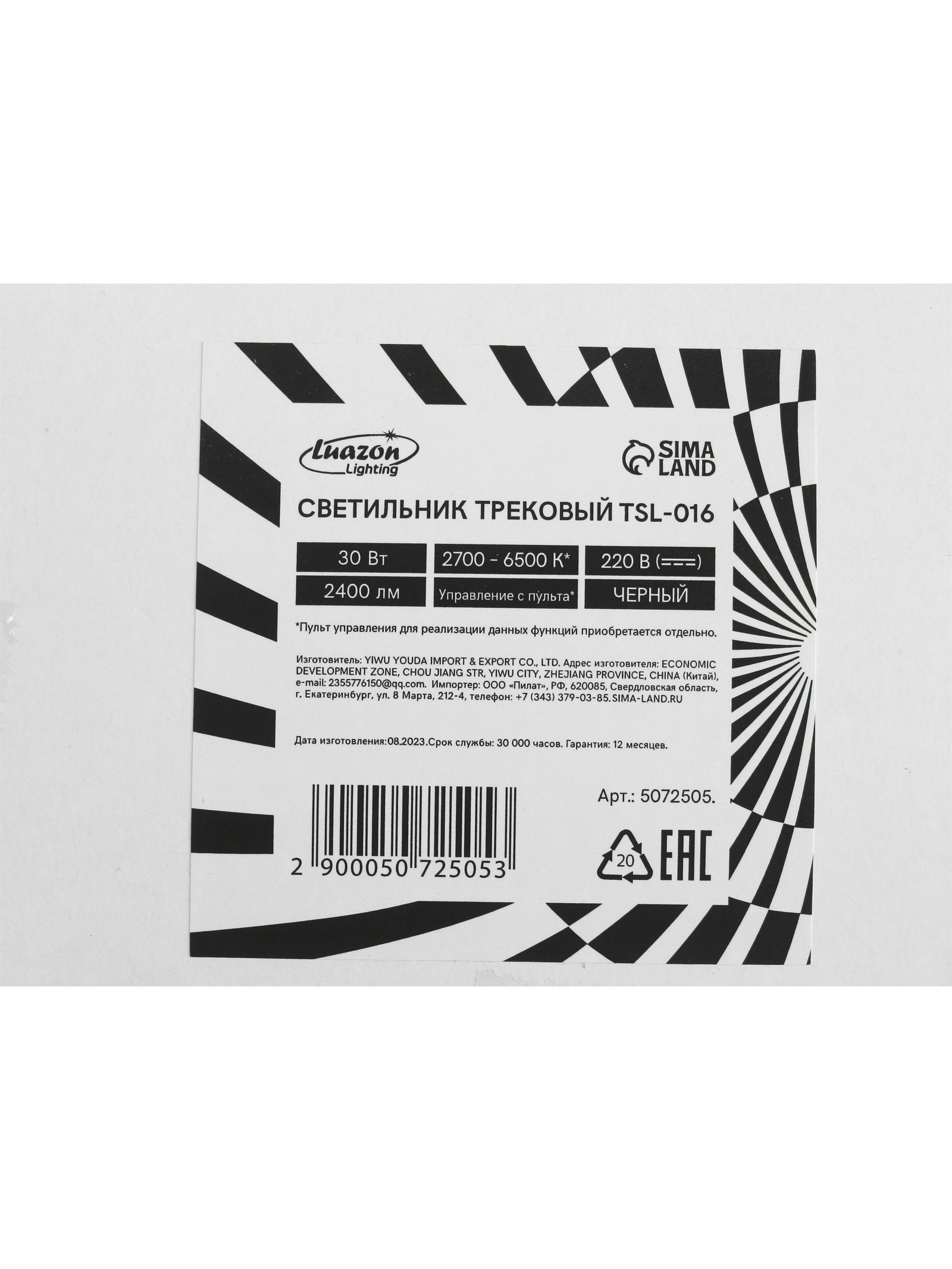 Трековый светильник Luazon TSL-016, 30 Вт, 2400 Лм, 2700-6500К, управление с пульта, чёрный, 3 режима свечения, 9.9x14.9x17.3 см., Luazon Lighting, Китай
