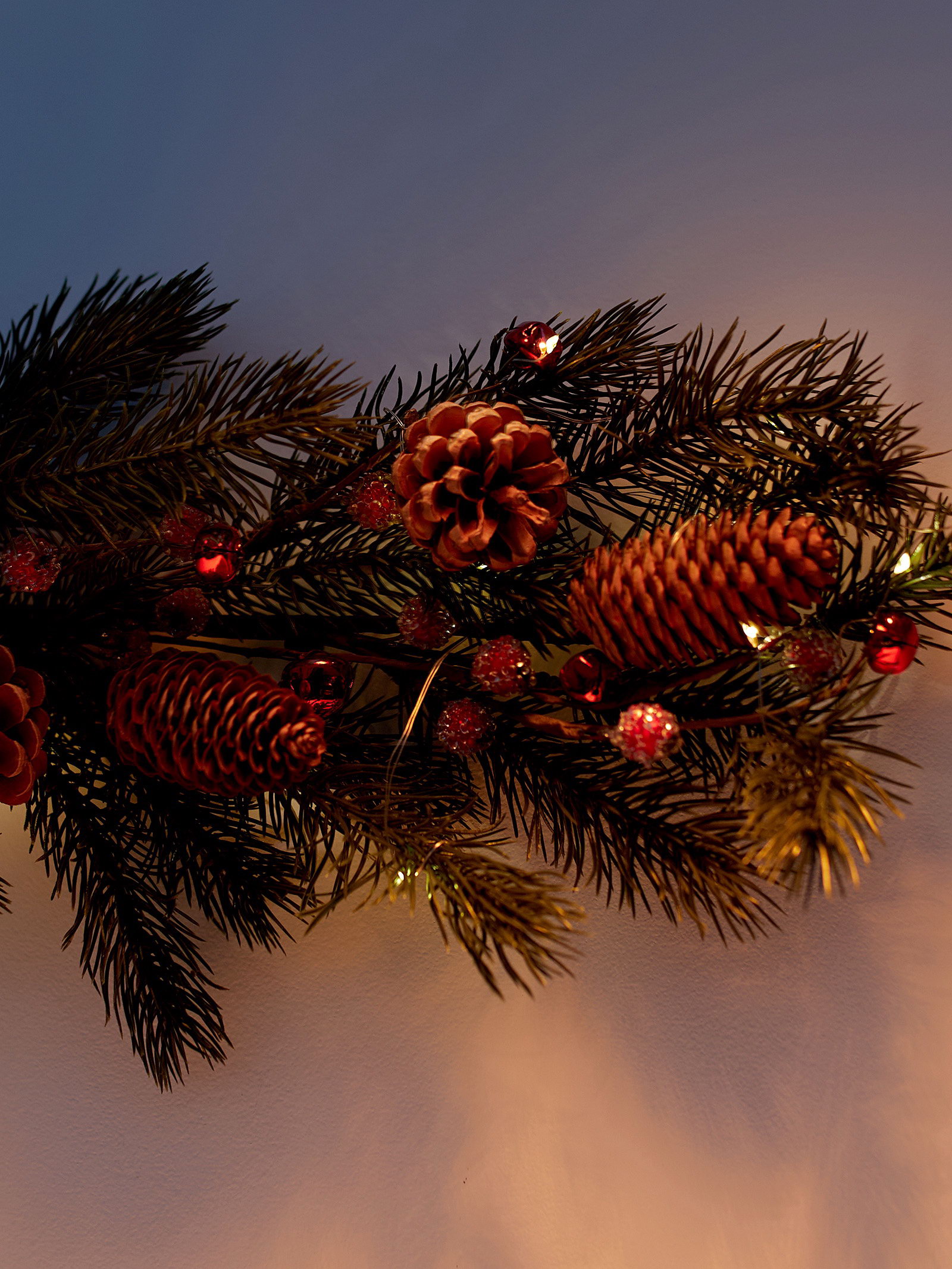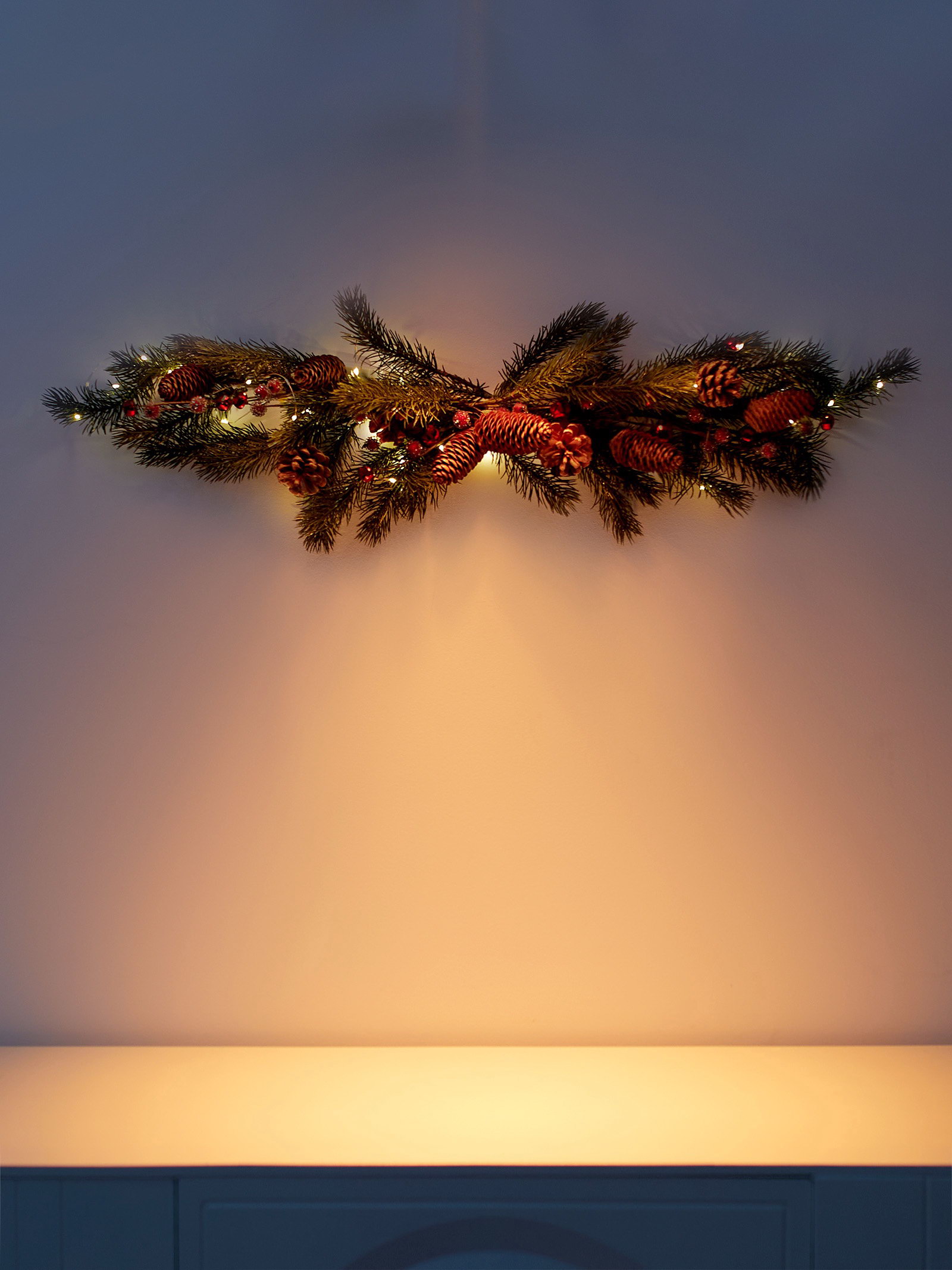 Декор настенный "Еловая ветвь с шишками", 70x27 см, 30LED, от батареек CR2032x2, свечение тёплое белое, 20x75x6 см., Luazon Lighting, Китай