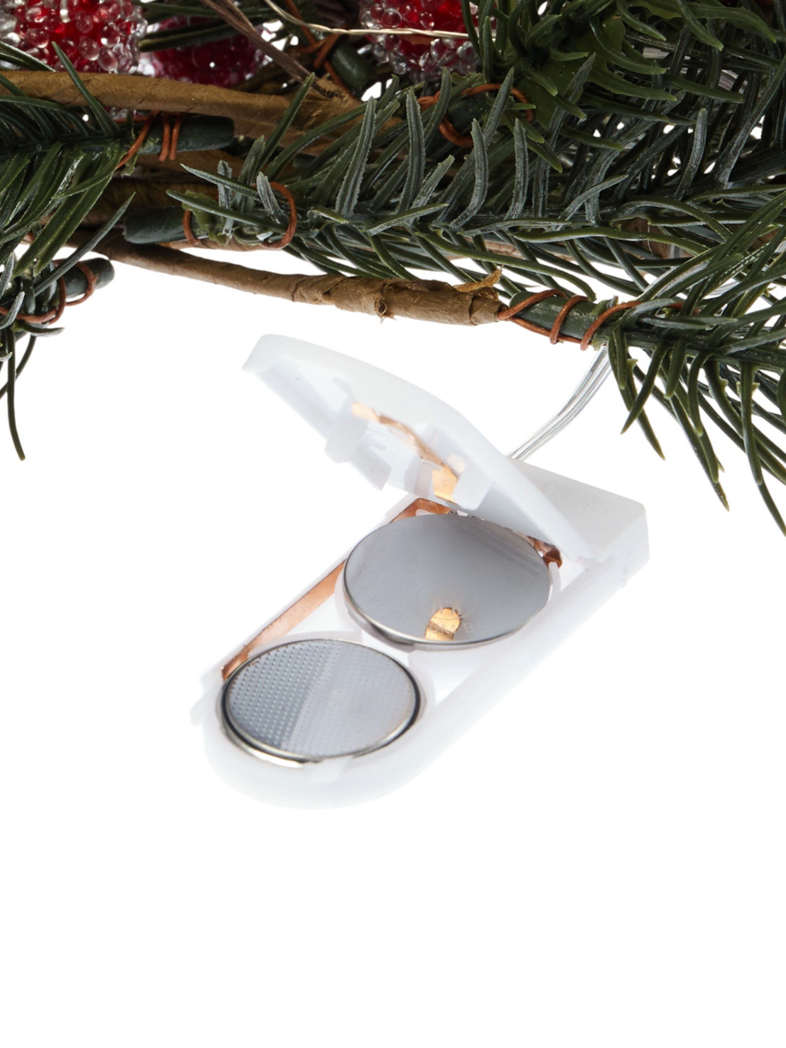 Вид установки: Надверный, Настенный (навесной), Универсальный Размер упаковки: 17 x 8 x 75 см. tnved: 6702900000 Гарантийный срок, мес.: 6 Цвет свечения: Тёплый белый Режим работы: Постоянное свечение Количество светодиодов: 30 Музыка: Нет Тип питания: От батареек Форма фигуры: Ёлка Эффект снежного вихря: Нет Настенный декор в виде еловой ветви с шишками длиной 70 см и шириной 27 см станет изысканным украшением вашего интерьера в праздничный сезон. Композиция из дерева и пластика отличается натуральной текстурой и аккуратной детализацией, создавая атмосферу зимней природы прямо у вас дома. 30 светодиодов с тёплым белым свечением равномерно освещают фигуру, наполняя пространство мягким и уютным светом. Универсальный настенный крепёж позволяет легко разместить декор на стене, двери или в любом удобном месте, а питание от двух батареек CR2032 обеспечивает автономную работу без лишних проводов. Постоянный режим свечения гарантирует стабильность и комфортное освещение без мерцания, что особенно важно для создания праздничного настроения.