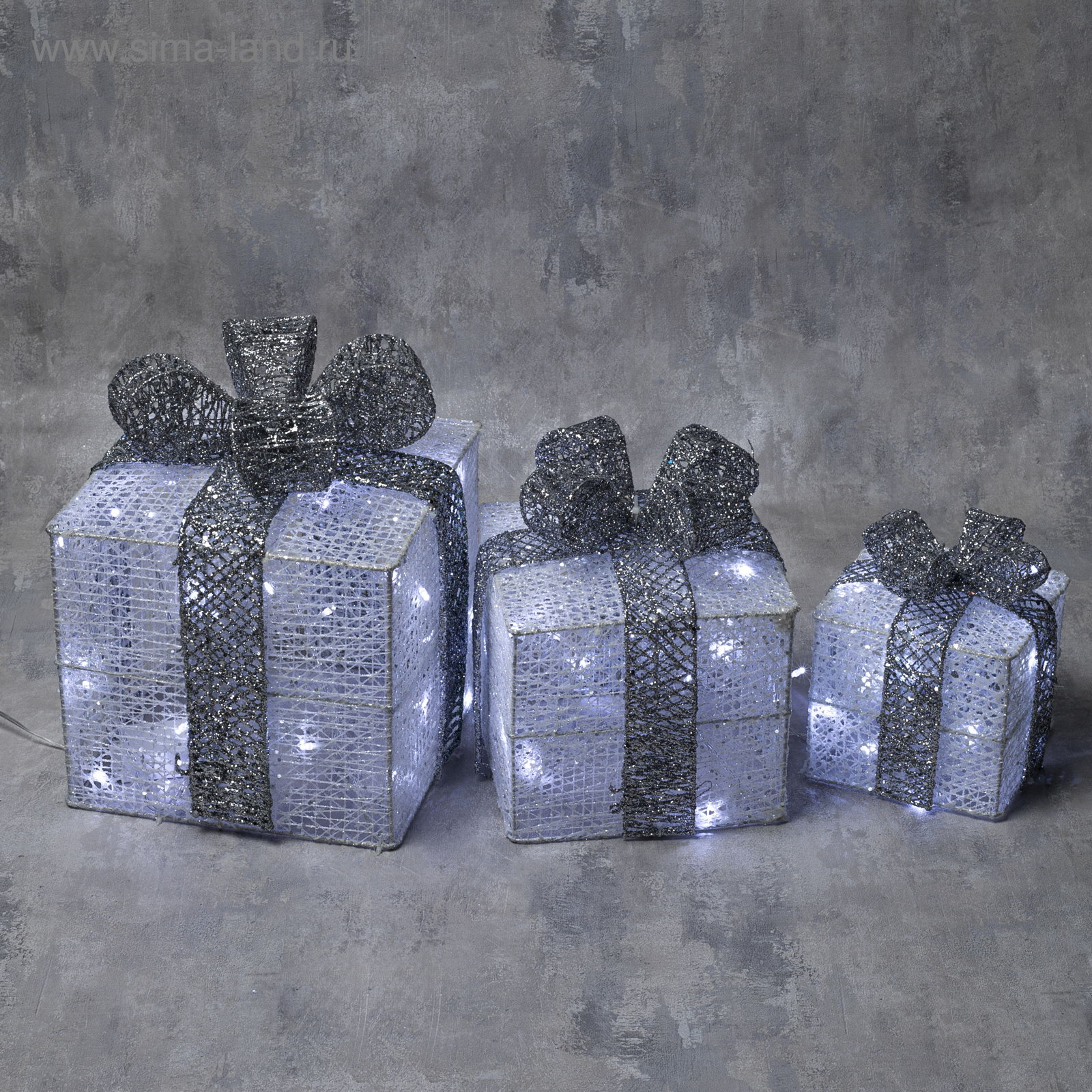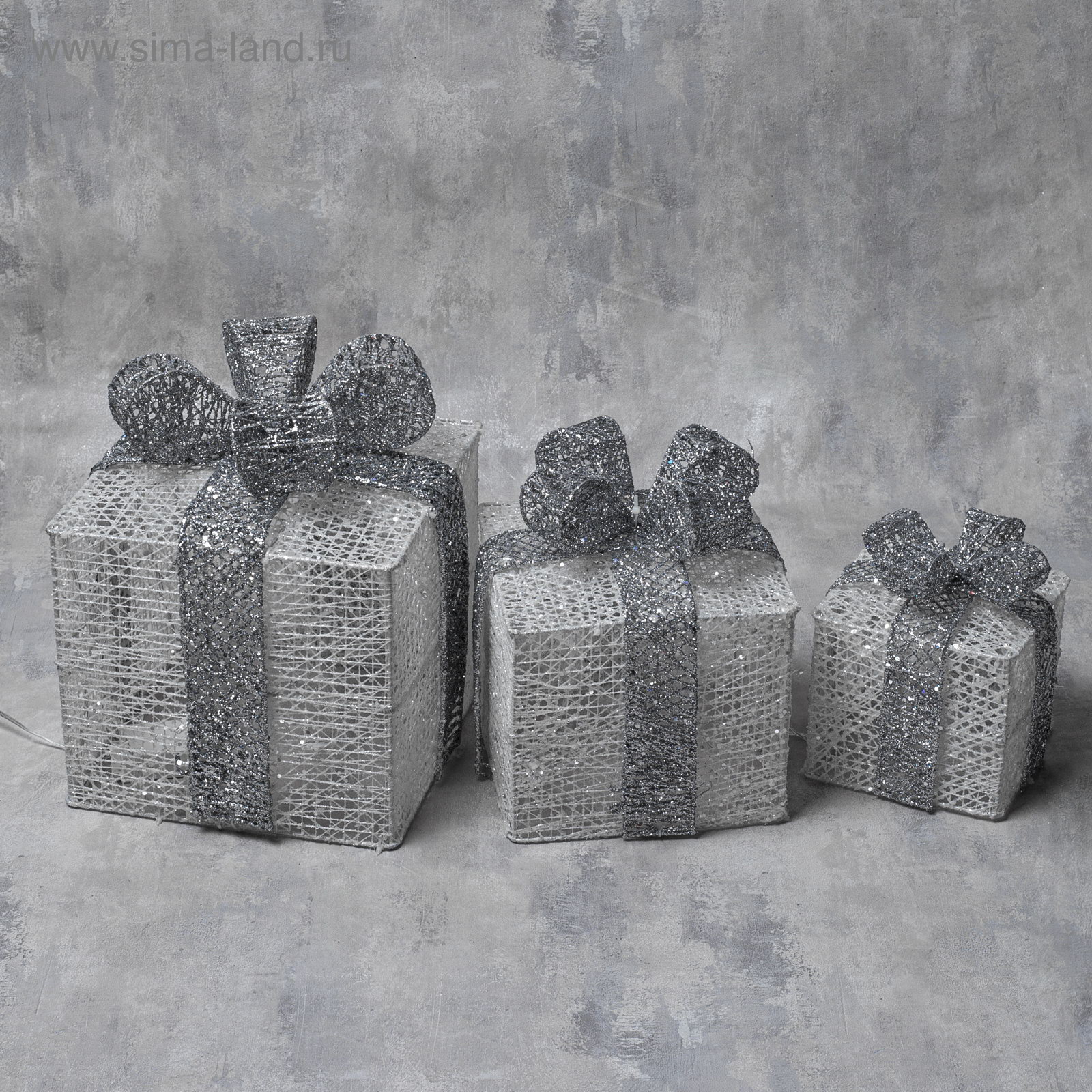 Светодиодная фигура "Подарки с серой лентой" 15, 20, 25 см, текстиль, металл, 220 В, 8 режимов, свечение белое, 25x25x25 см., Luazon Lighting, Китай