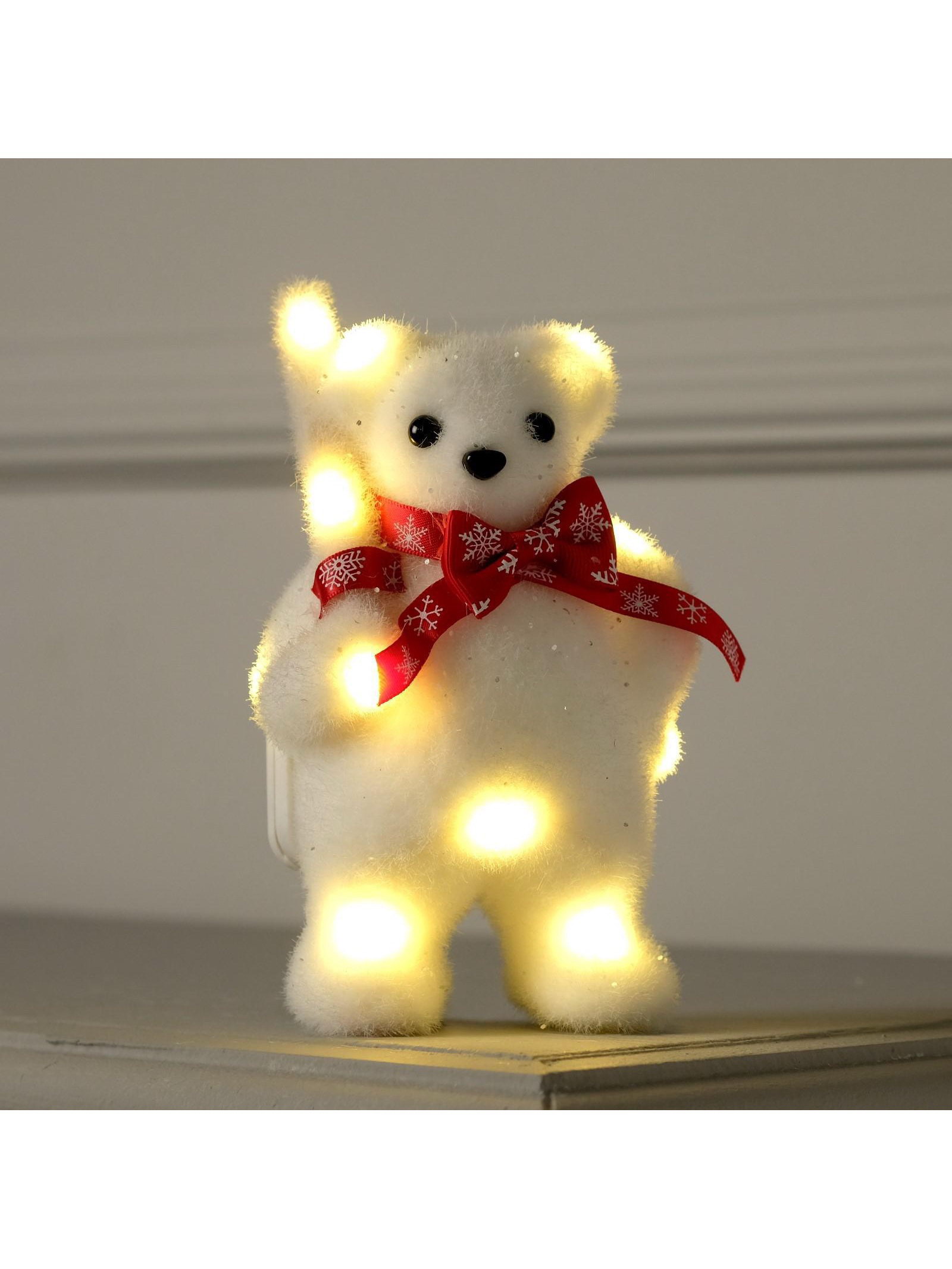 Стиль: Декоративные, Советский Размер упаковки: 6 x 15 x 10 см. tnved: 9505109000 Гарантийный срок, мес.: 6 Вид: Мишка Цоколь: Встроенные LED Вид установки: Настольный Управление светильником: С выключателем на корпусе Медиагалерея: Светильник в интерьере Цвет: Белый Цвет свечения: Тёплый белый Количество светодиодов: 11 Тематика праздника: Новый год Количество батареек: 2 Типоразмер батареек: CR2032 Форма фигуры: Медведь Режим работы: Постоянное свечение Высота, см: 15 Тип питания: От батареек Эффект снежного вихря: Нет Разнообразные новогодние световые фигуры - это прекрасный вариант оформления к Новому Году и любому другому торжеству, а также отличное дополнение интерьера. Сегодня такие фигуры довольно активно используются в качестве светового оформления различных кафе, торговых центров, магазинов и ночных клубов, равно как и для создания новогоднего оформления в доме, офисе, и даже на улице. Знакомые на первый взгляд фигурки снабжены одним или несколькими светодиодами, что превращает их из привычных в сказочные. Изделие станет эффектным дополнением к гирлянде или даже оригинальной заменой ей. Игрушка ярко светится, потребляет совсем мало энергии и не нагревается. Преимущества: