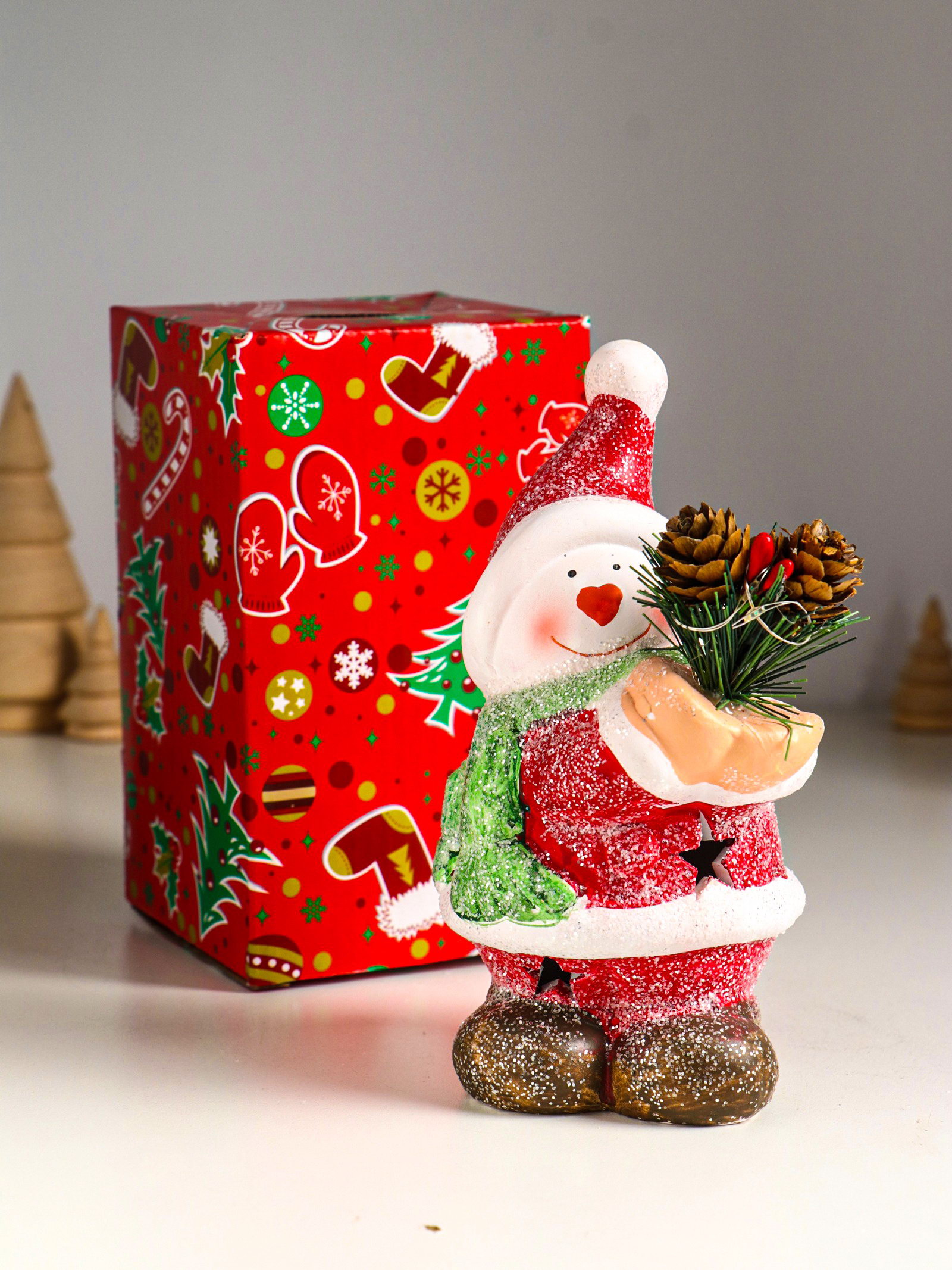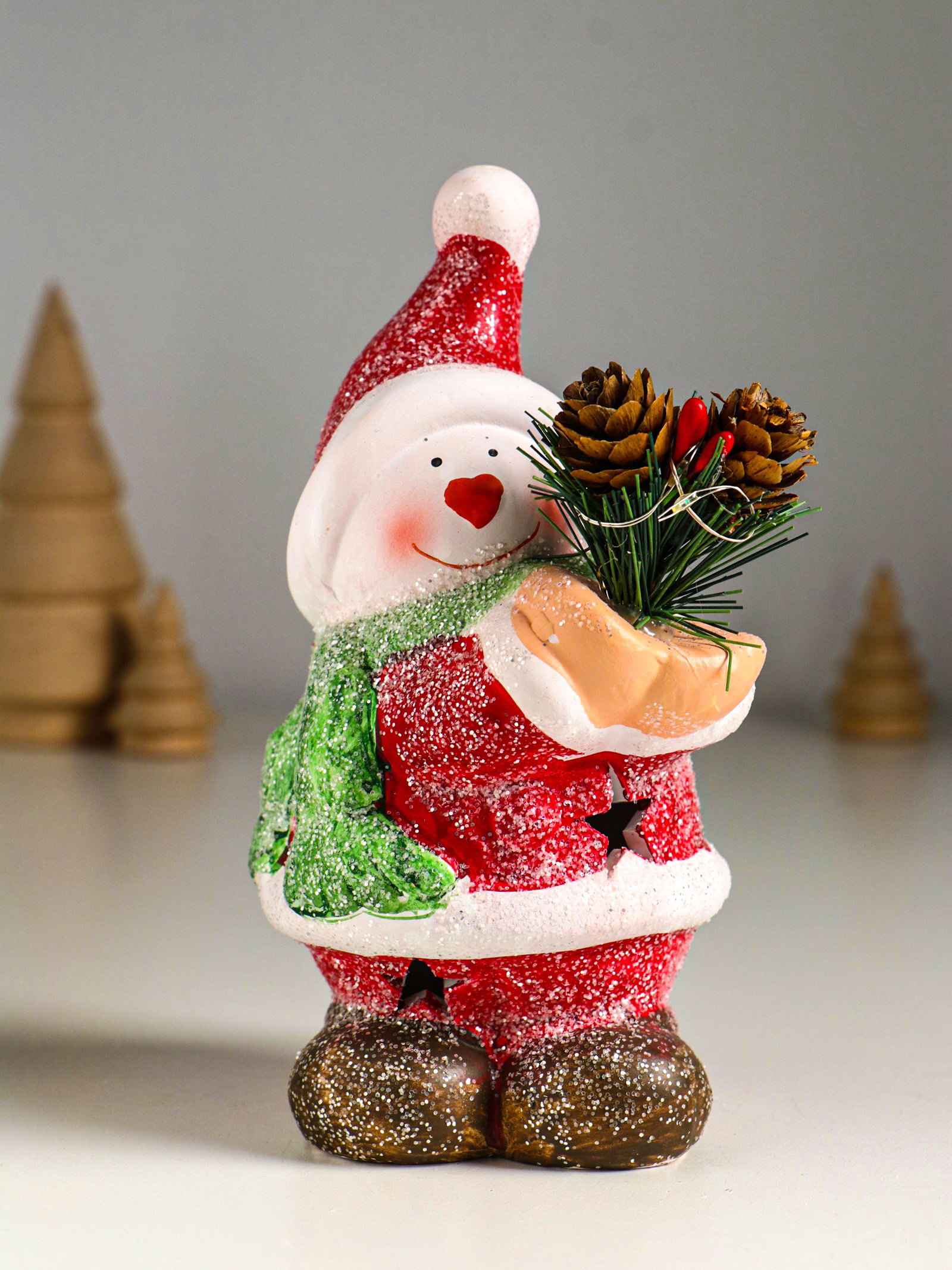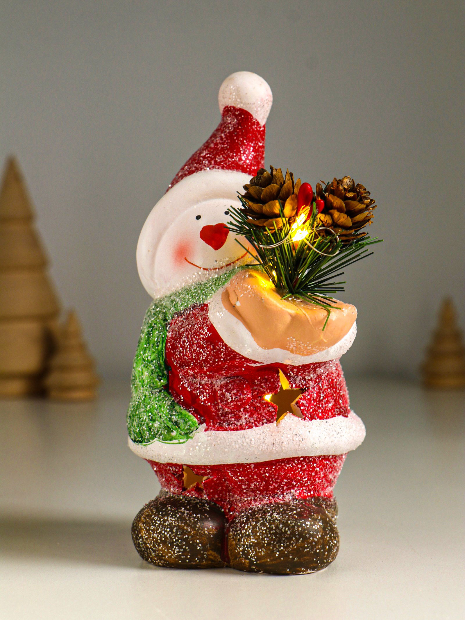 Фигурка светящаяся "Снеговик в красной шубке с еловой веточкой", керамика, 10x7.5x14.5 см, 7.5x10x14.5 см., Китай