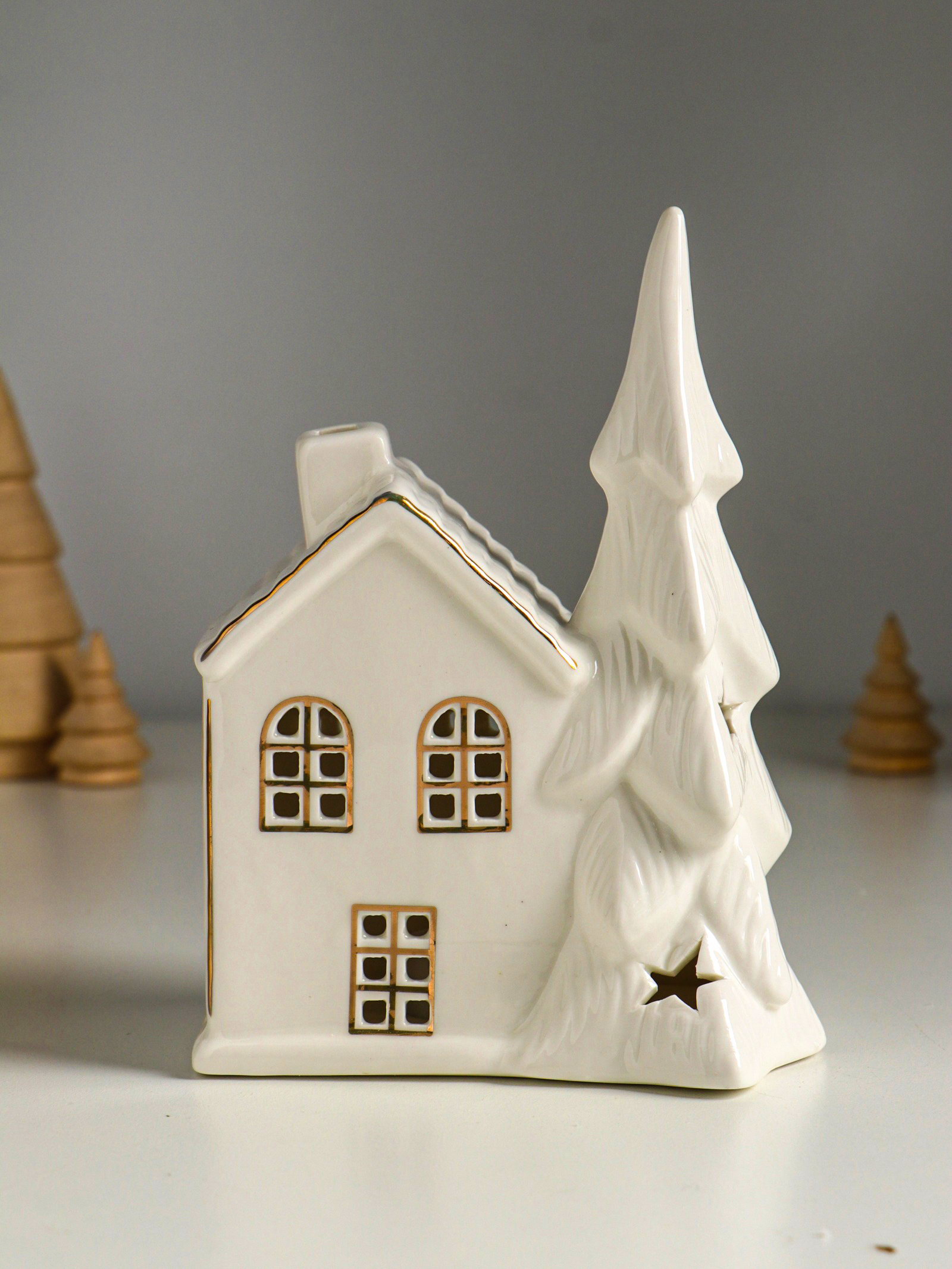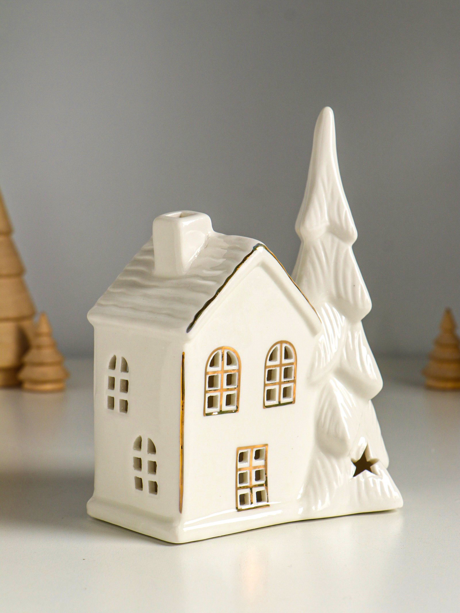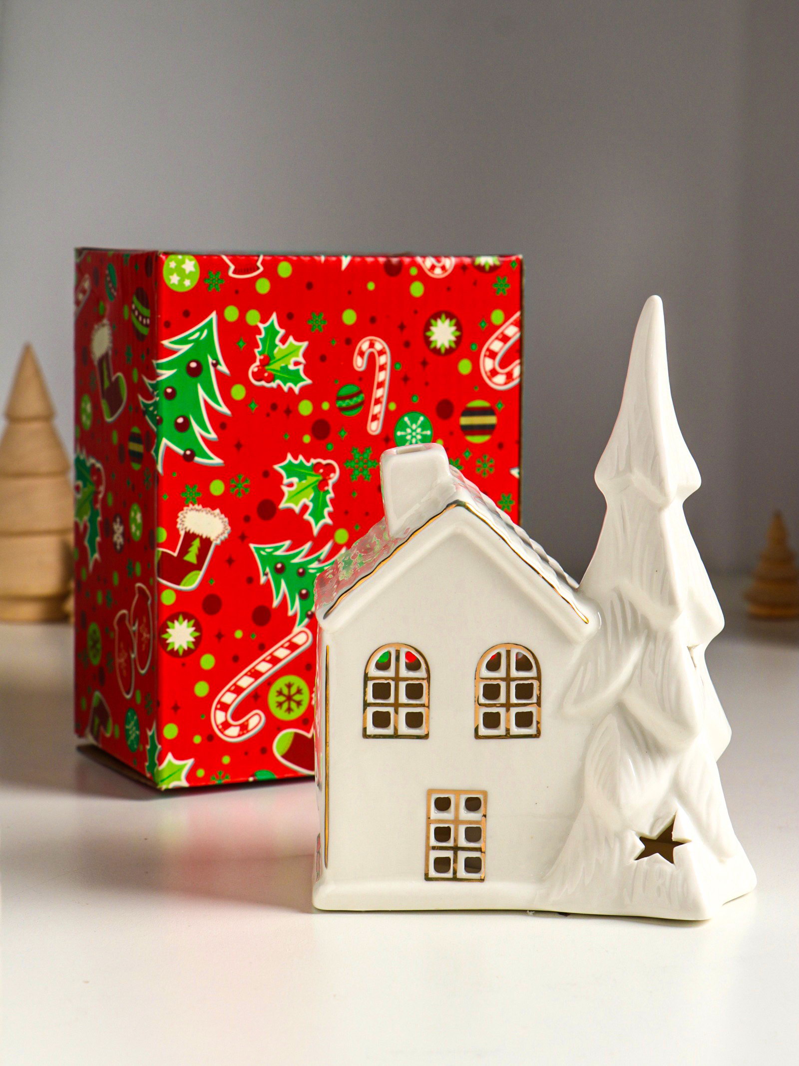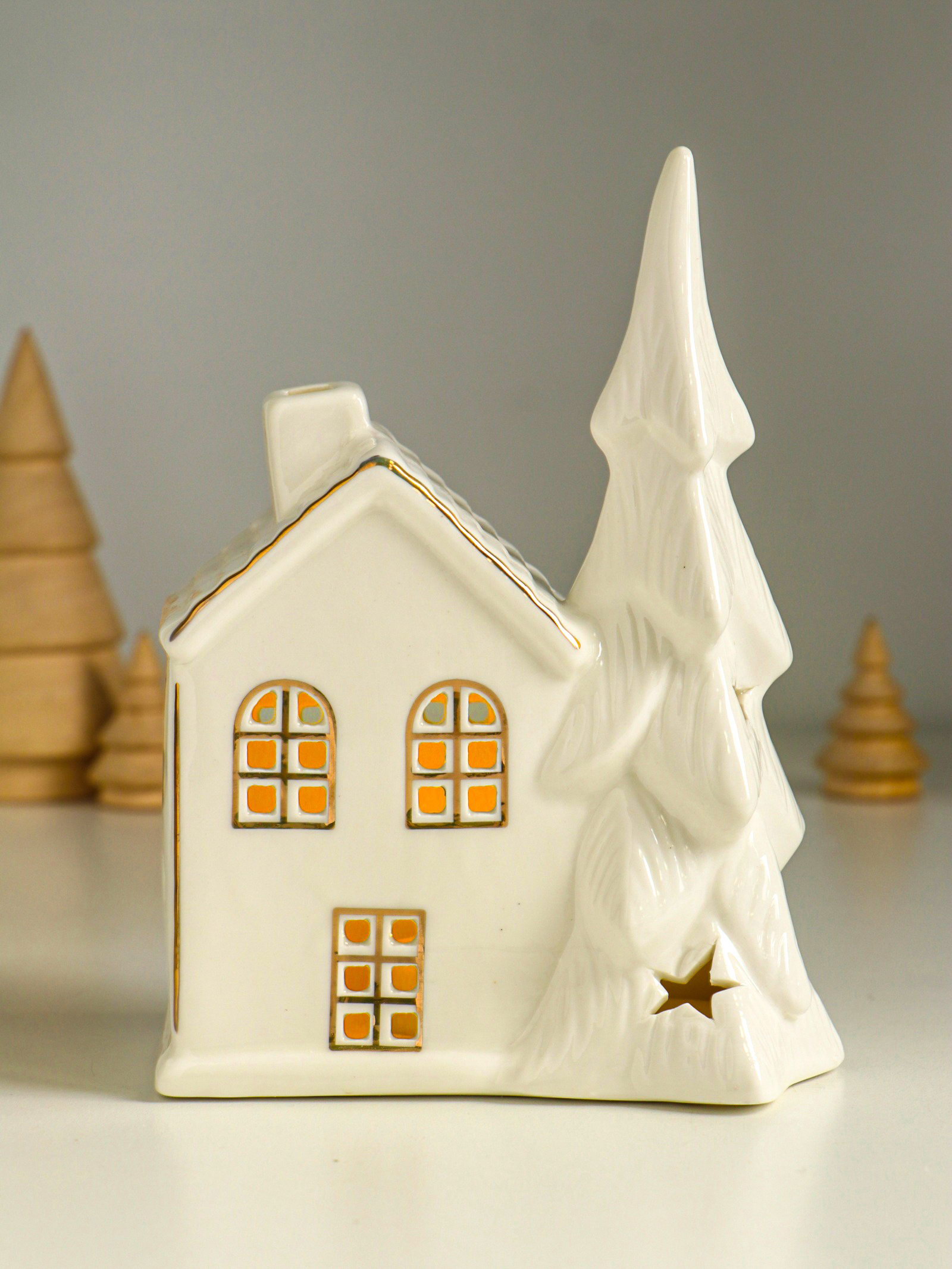 Фигурка светящаяся "Ель у домика", керамика, белый с золотом, 12x7.5x16 см, 7.5x12x16 см., Китай