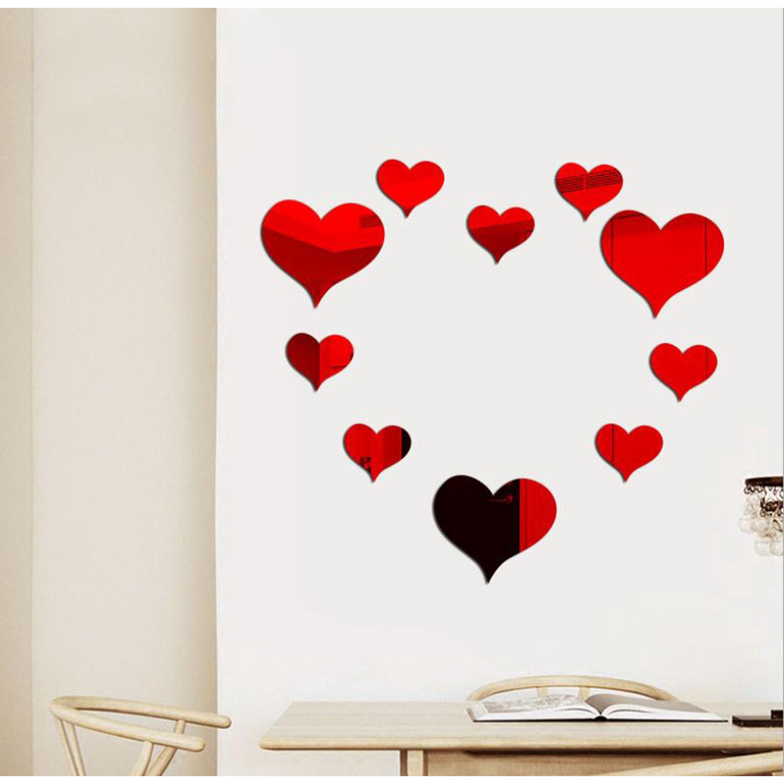 Наклейки интерьерные "Сердца", декор настенный зеркальный, набор 10 шт 9 - 15см, красные, 10x10x1 см., QF, Китай