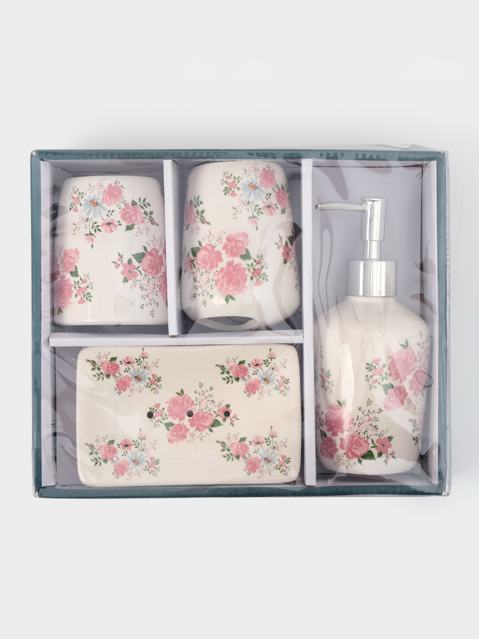 Аксессуары для ванной "Розовые розы", 4 предмета, дозатор 300 мл, мыльница, 2 стакана, белые, 21.5x26x8 см., Китай