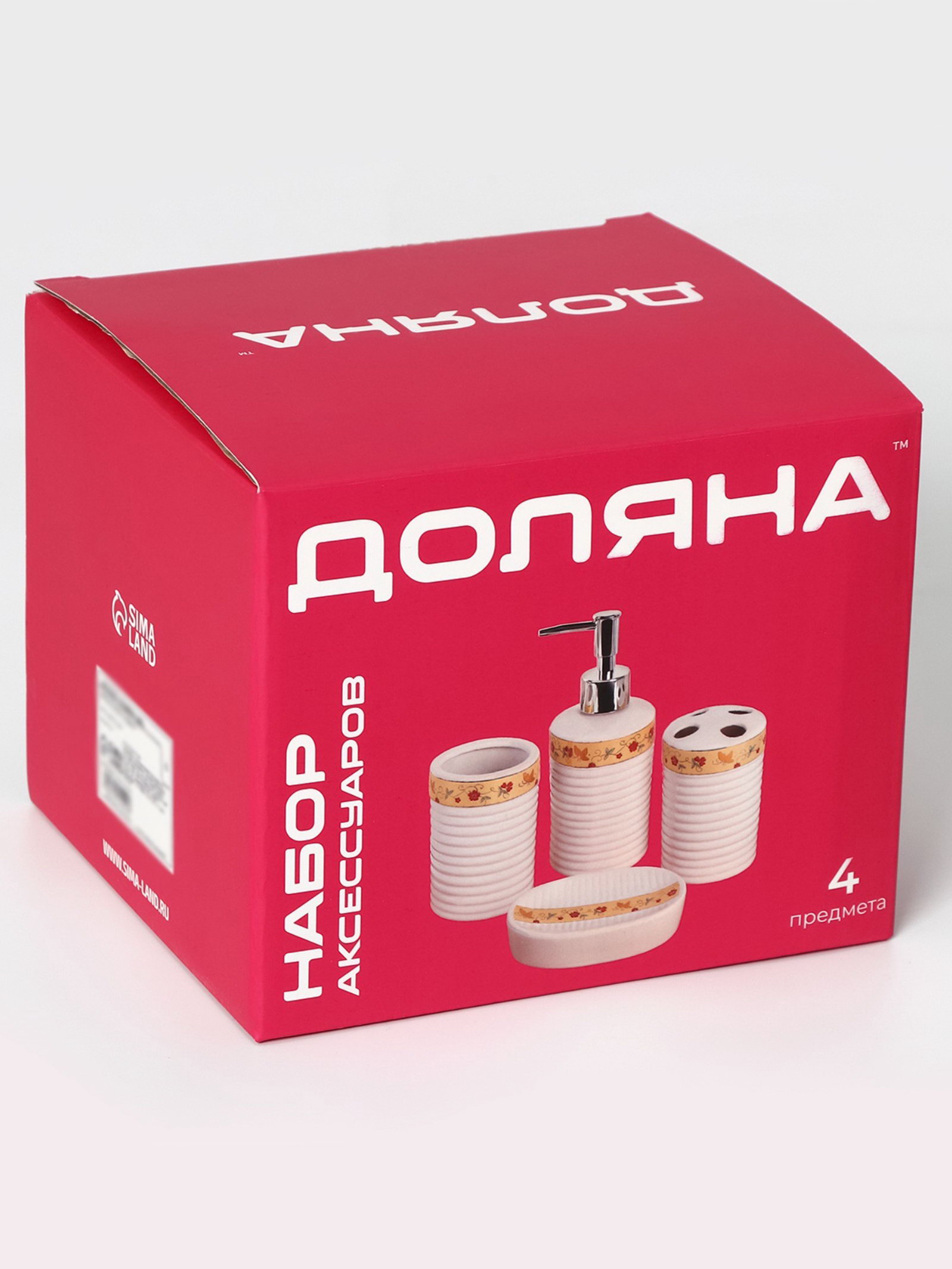 Аксессуары для ванной "Изящество", 4 предмета, дозатор 250 мл, мыльница, 2 стакана, белые, 14.5x16x13 см., Доляна, Китай