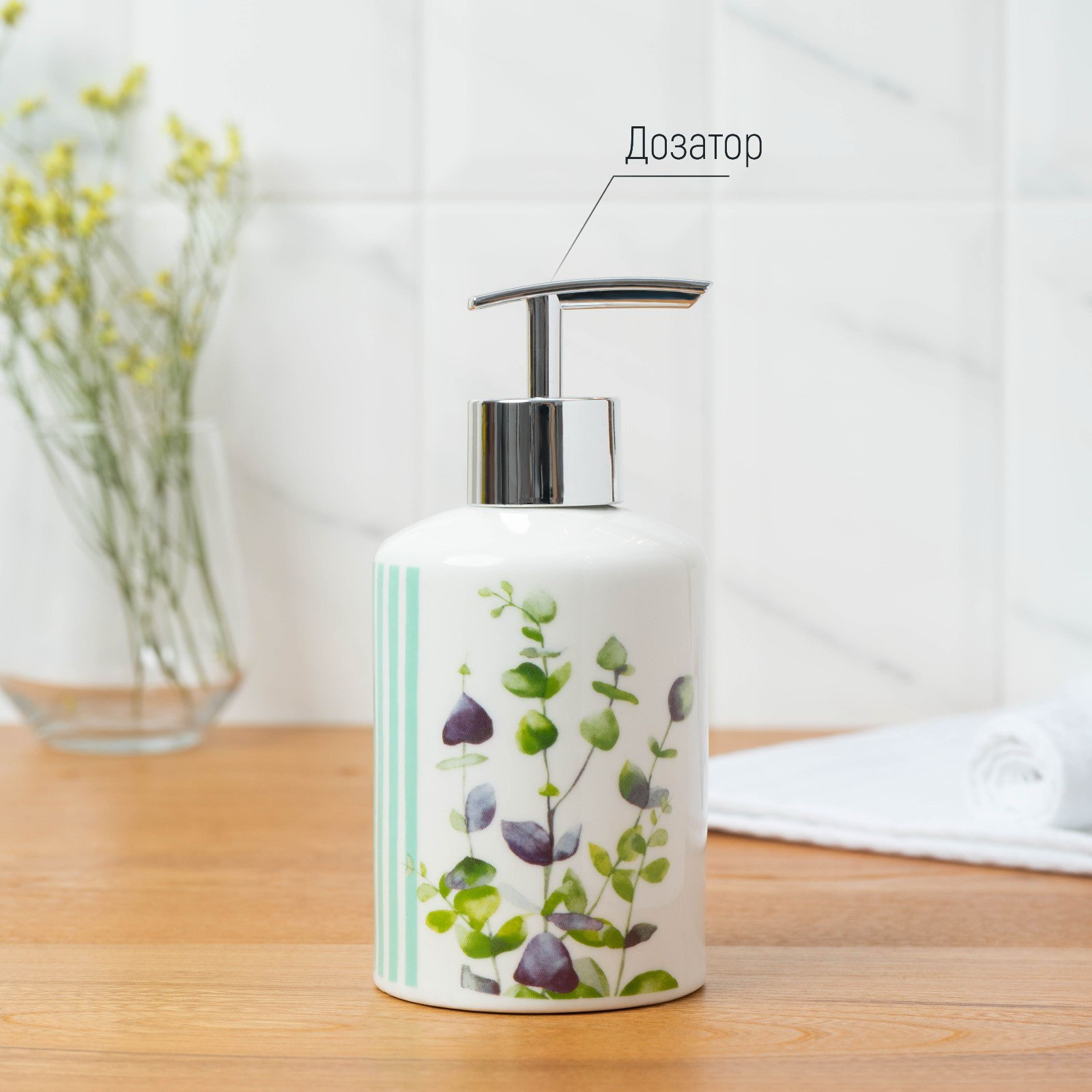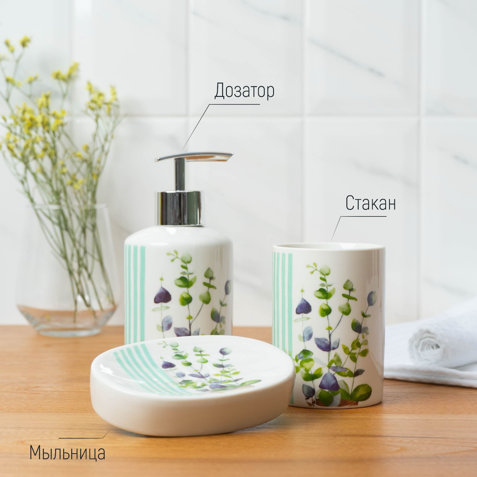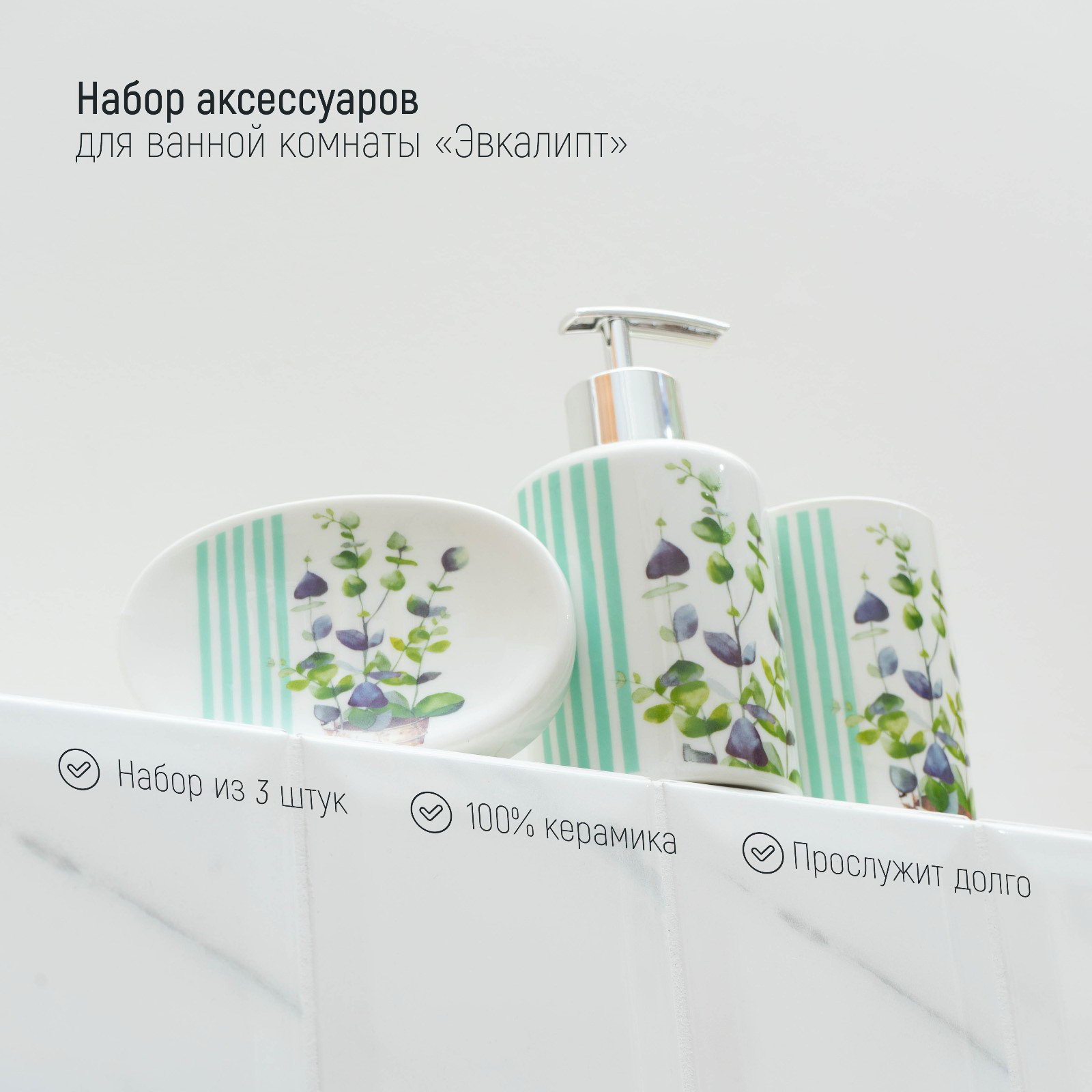 Набор аксессуаров для ванной комнаты Доляна "Эвкалипт", 3 предмета, мыльница, дозатор для мыла, стакан, 11x15x10 см., Доляна, Китай