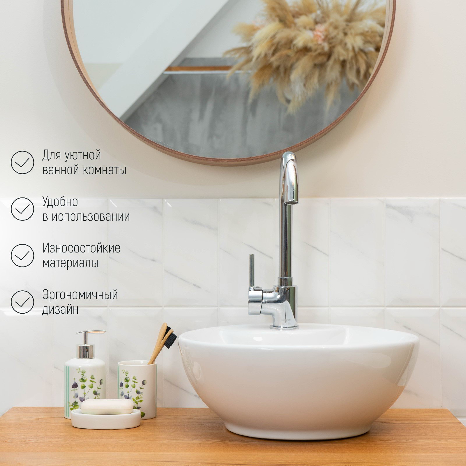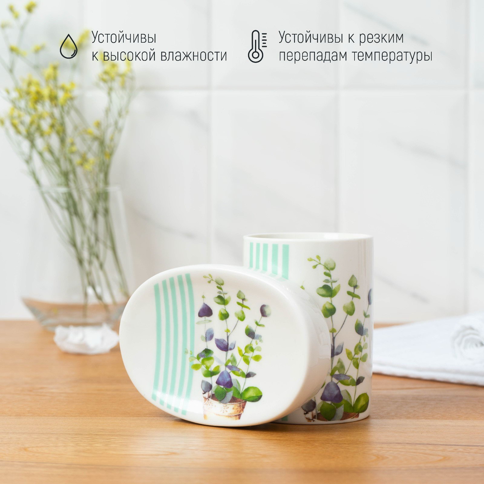 Цвет: Белый, Зелёный Размер упаковки: 8.5 x 16.5 x 17.5 см. tnved: 6912008700 Рисунок: Да В наборе, шт.: 3 Набор: Да Тематика: Цветочно-растительная Запрет реализации по сегментам: 00000000485 Ванную комнату мы посещаем несколько раз в день. Поэтому хочется, чтобы она была уютной, стильной и заряжала по утрам бодростью и хорошим настроением. Секрет её удачного оформления яркие аксессуары! Набор аксессуаров организует пространство и станет стильным украшением Вашей ванной комнаты. За счет сдержанного дизайна данный керамический набор в ванную подойдет к любому дизайну ванной комнаты. Набор состоит из 3 предметов: дозатор, мыльница, стакан. Преимущества: