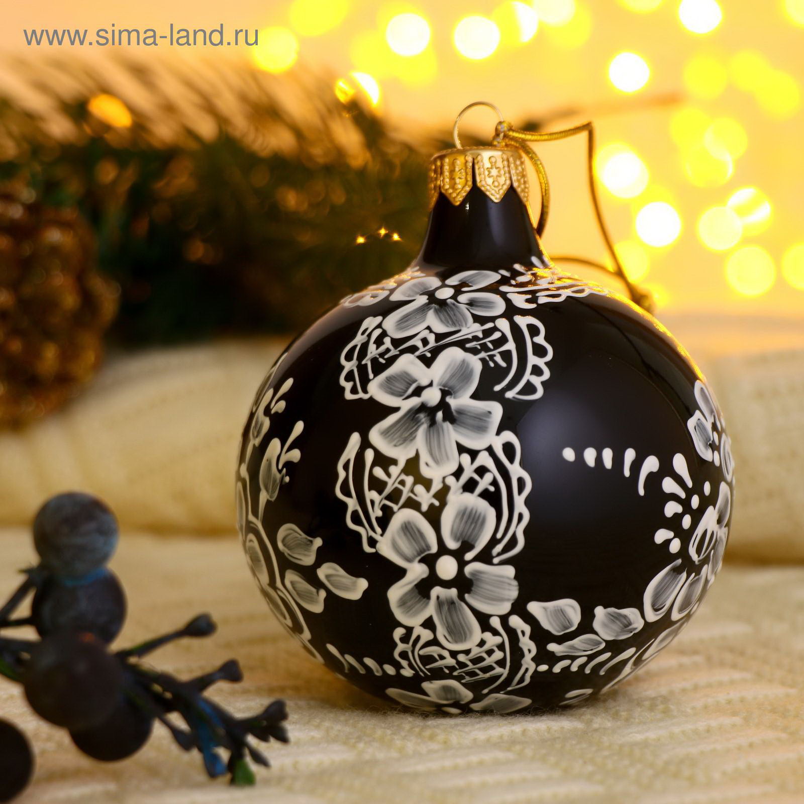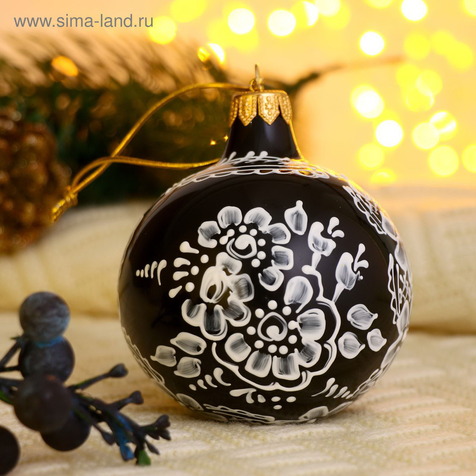 Ёлочный шар d-8 см "Белые цветочки" ручная роспись, 8 см., Россия