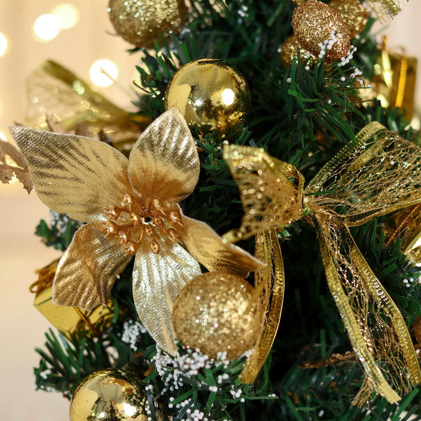 Искусственная ёлка настольная "Зимнее волшебство. Праздничная" бантик цветок шары, 14x27 см, золото, 14x27 см., Зимнее волшебство, Китай