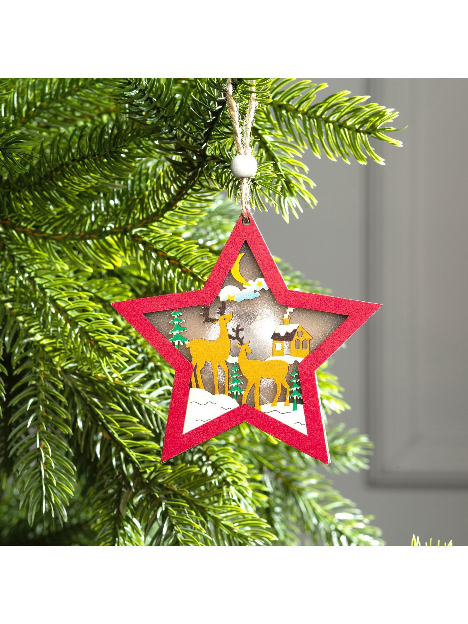 Ёлочная игрушка "Красная звезда с оленями", 10х10х1 см, 3 LED, от батареек, свечение тёплое белое, 1x10x10 см., Luazon Lighting, Китай