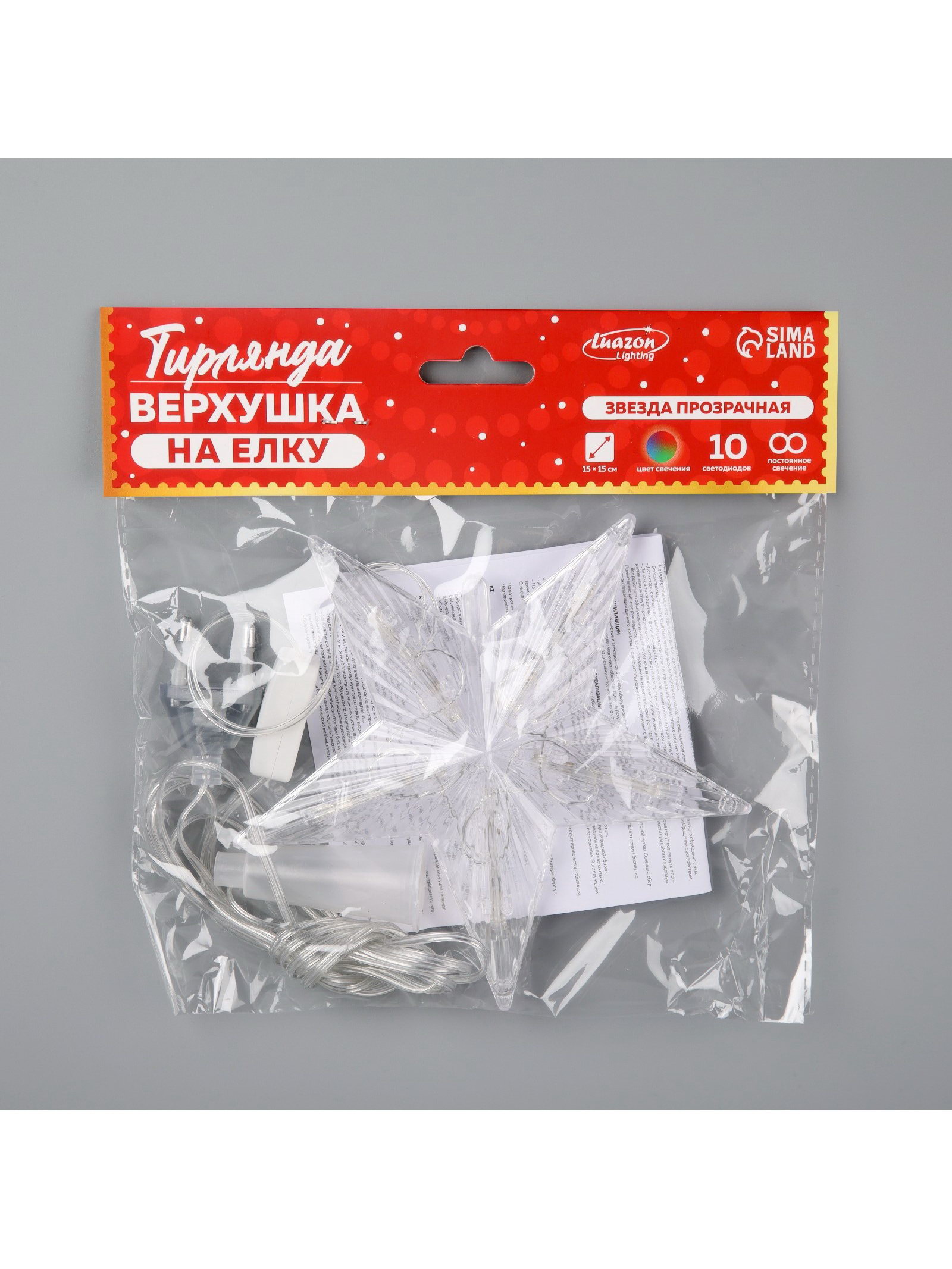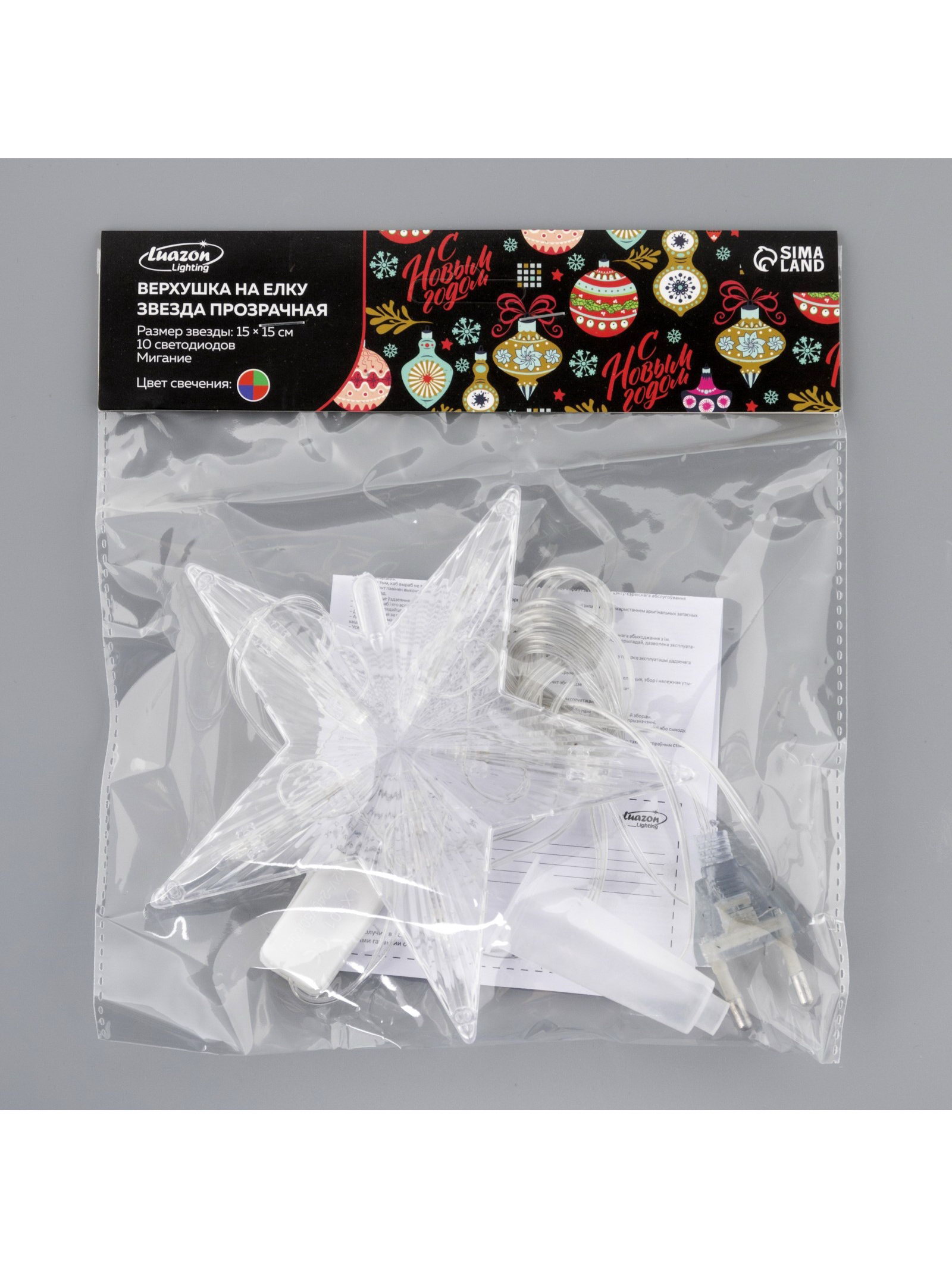 Светодиодная верхушка на ёлку "Звезда прозрачная", 15 см, 10 LED, 220 В, свечение RG/RB, 3x15x15 см., Luazon Lighting, Китай
