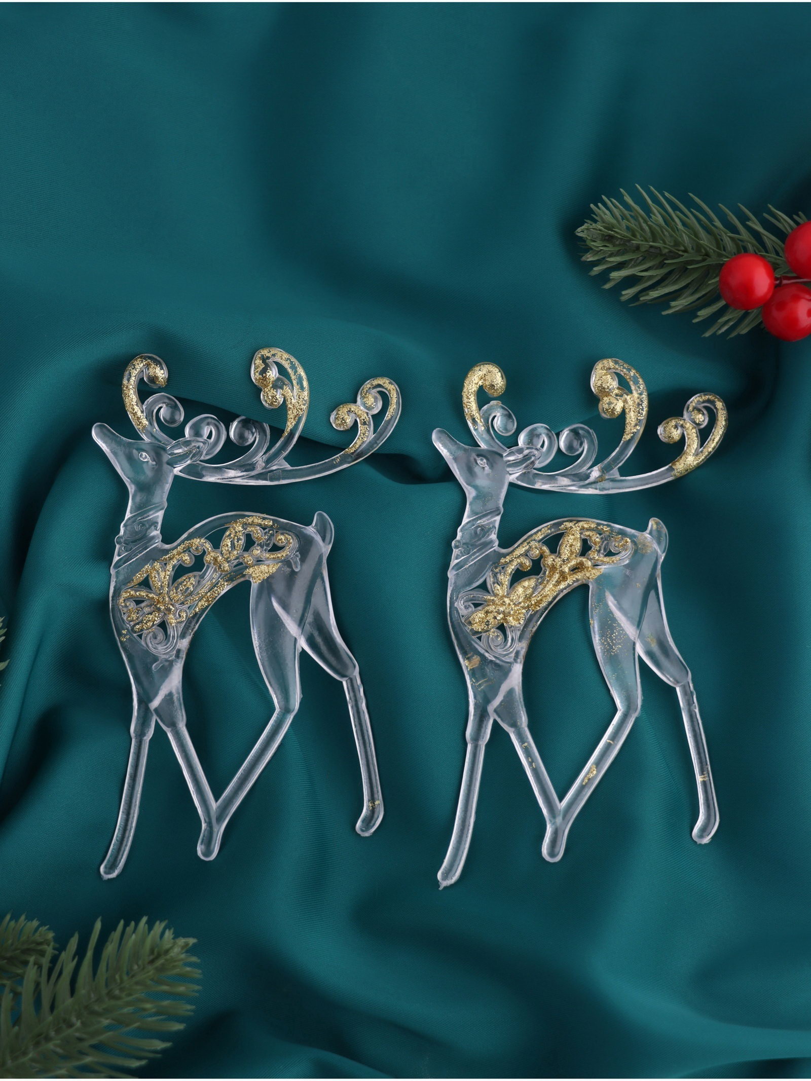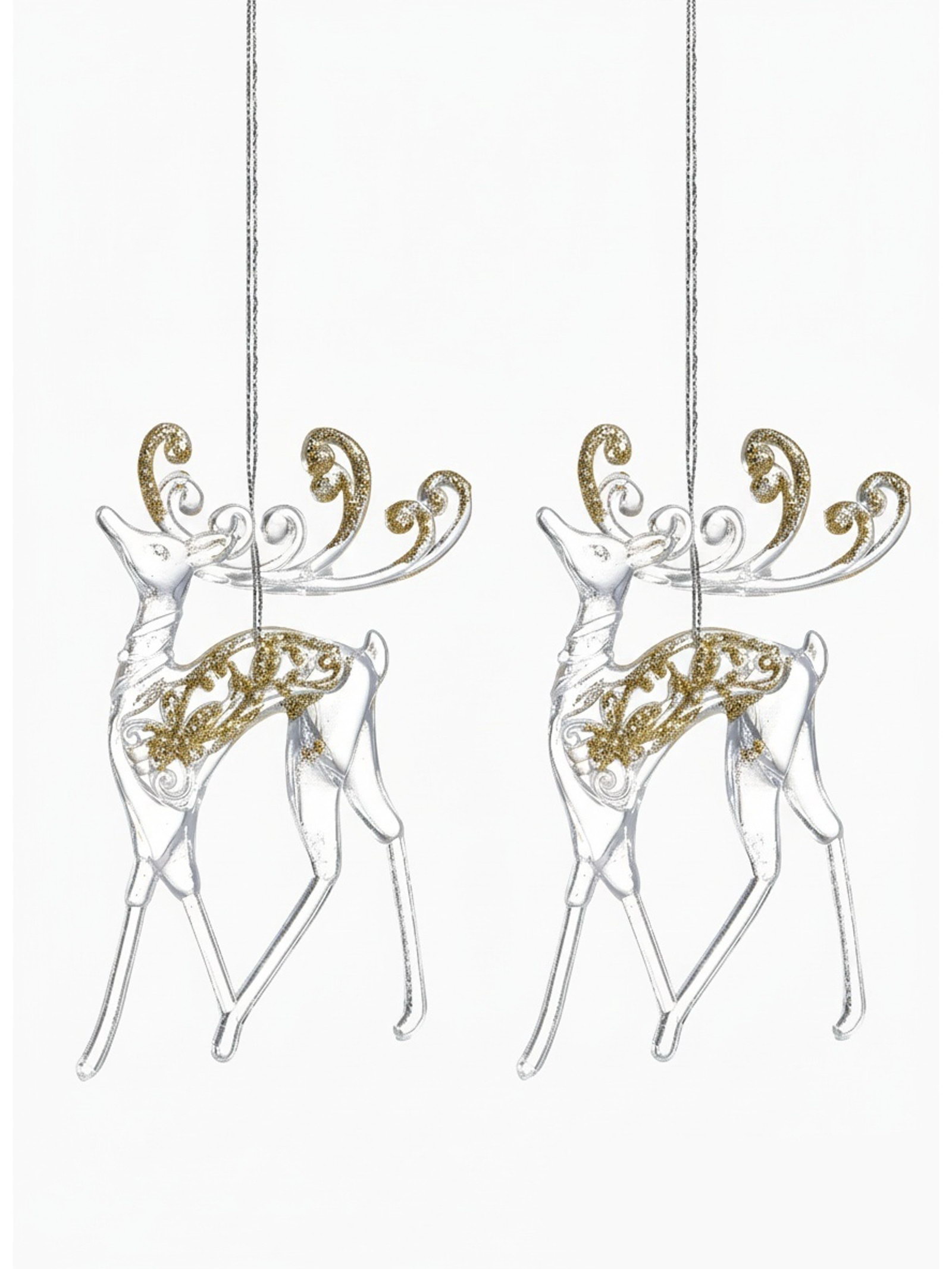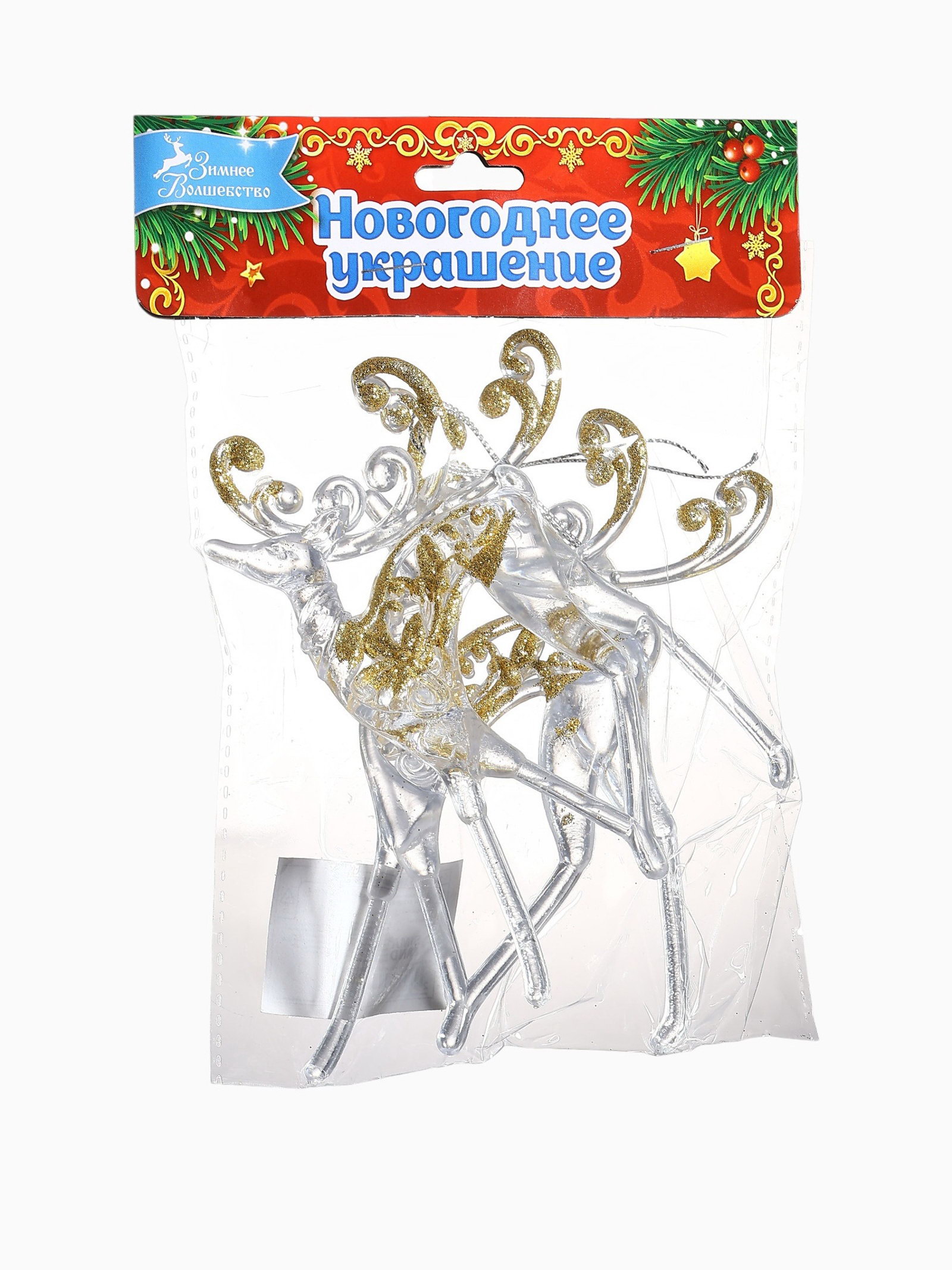 Ёлочные игрушки 2 шт. "Зимнее волшебство. Олень с блеском", 8x13 см, прозрачно-золотой, 8x13 см., Зимнее волшебство, Китай