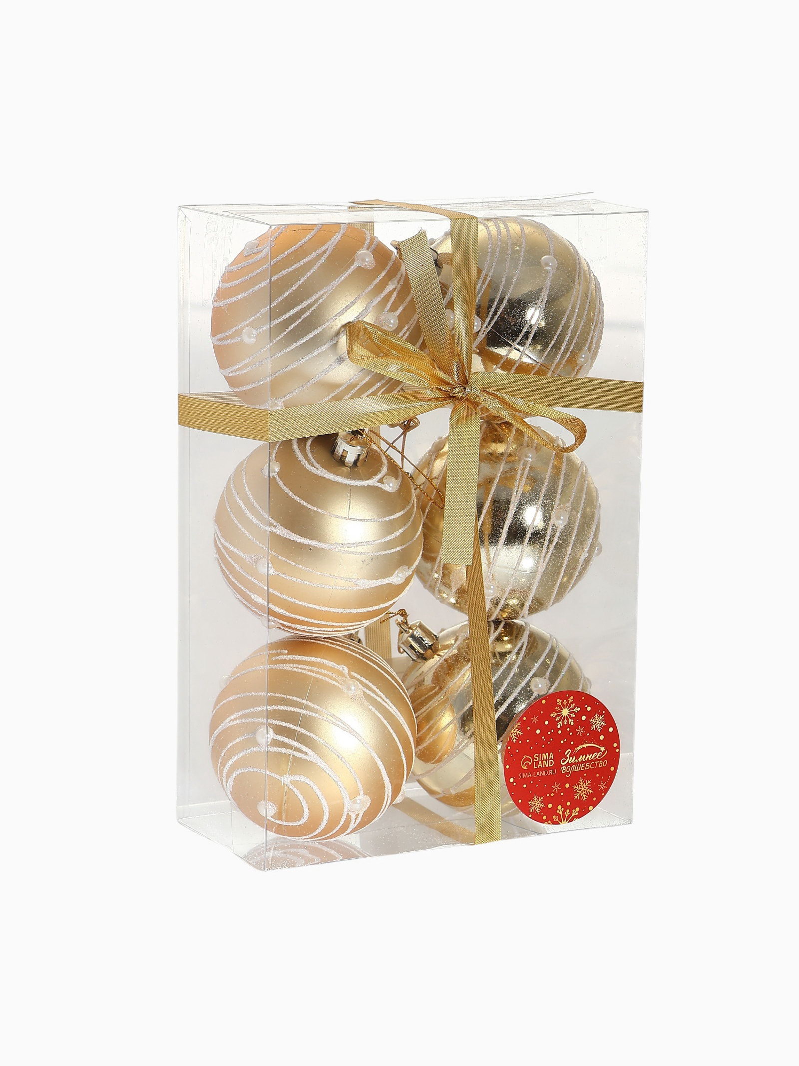 Стиль: Ар-деко, Классика, Новогоднее барокко Размер упаковки: 13.5 x 7 x 20.5 см. Рисунок: Да Цвет: Золотистый Символ года: Нет tnved: 9505109000 Форма игрушки: Шар В наборе, шт.: 6 Набор: Да Диаметр шара, см: 7 Тематика праздника: Новый год Особенности: С рисунком Пластиковые новогодние шары золотистого цвета с рисунком это изысканное дополнение к праздничному декору для тех, кто ценит умеренную роскошь и внимание к деталям. Игрушки диаметром 7 см выполнены в классической форме и украшены ненавязчивым орнаментом, что делает их универсальным решением для оформления ёлки в стиле ар-деко, барокко или строгой классики. Набор из 6 элементов подходит как для создания основного образа ёлки, так и для акцентного использования. Почему выбирают этот набор