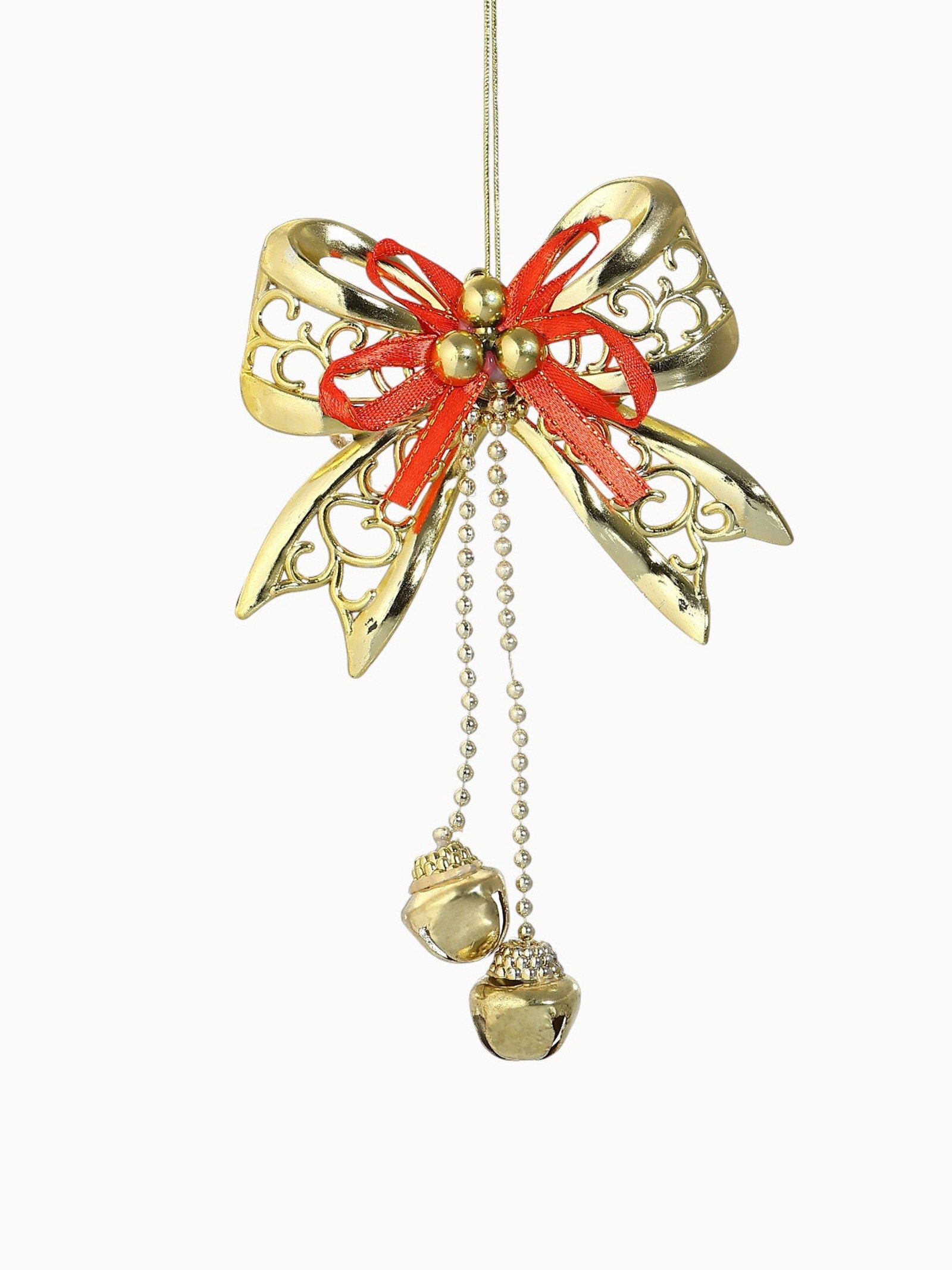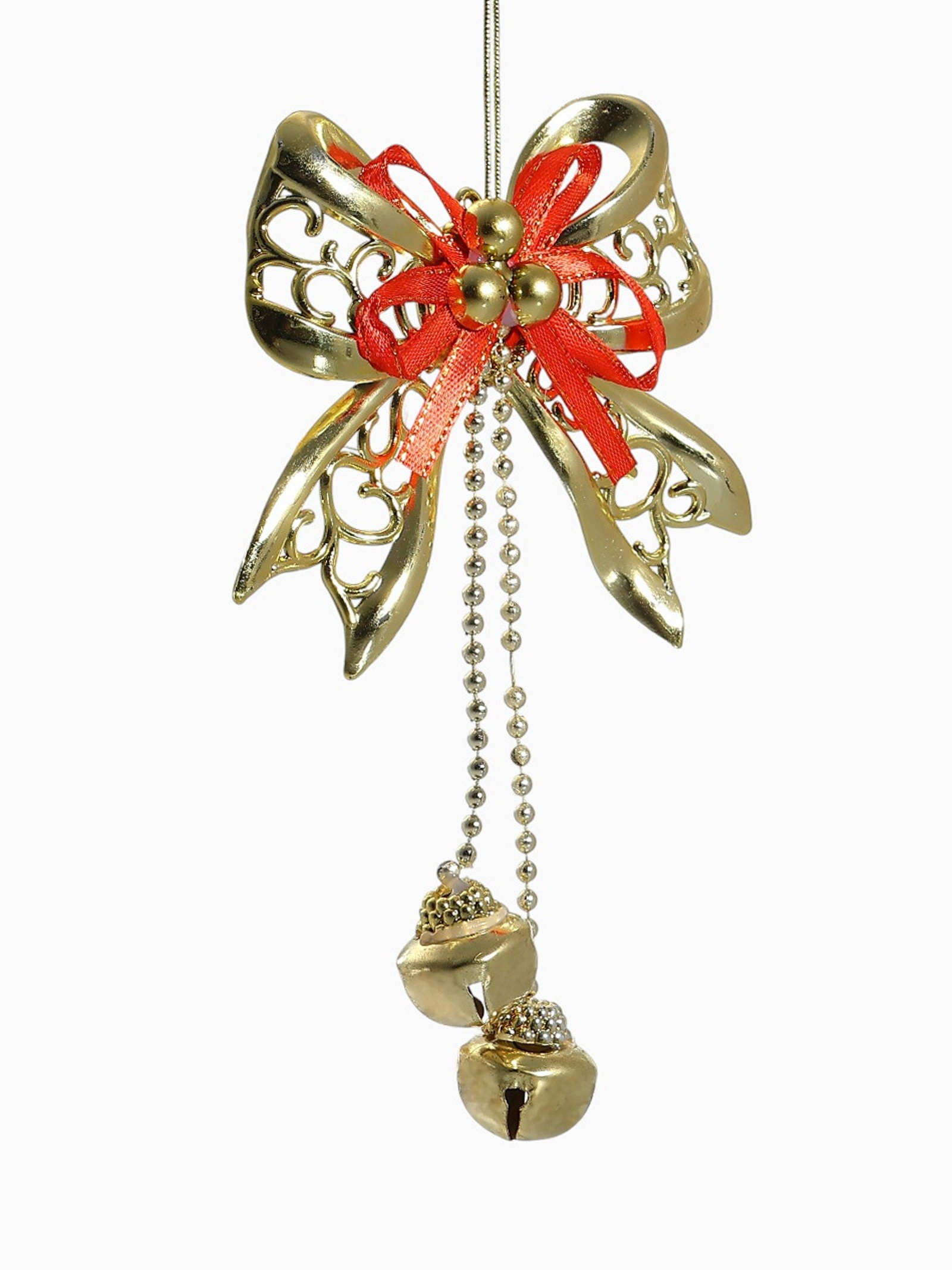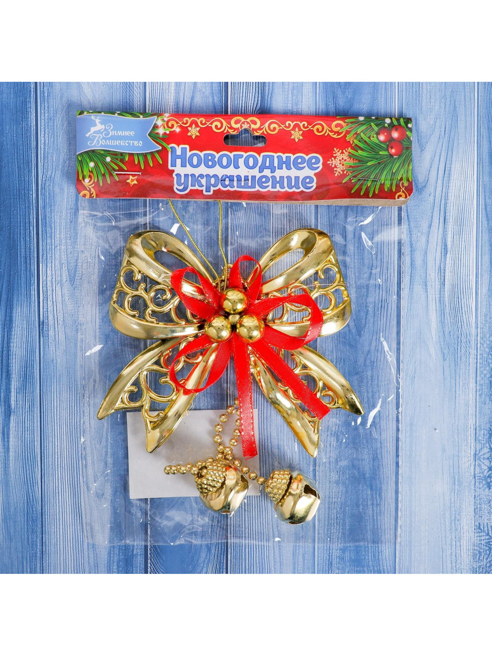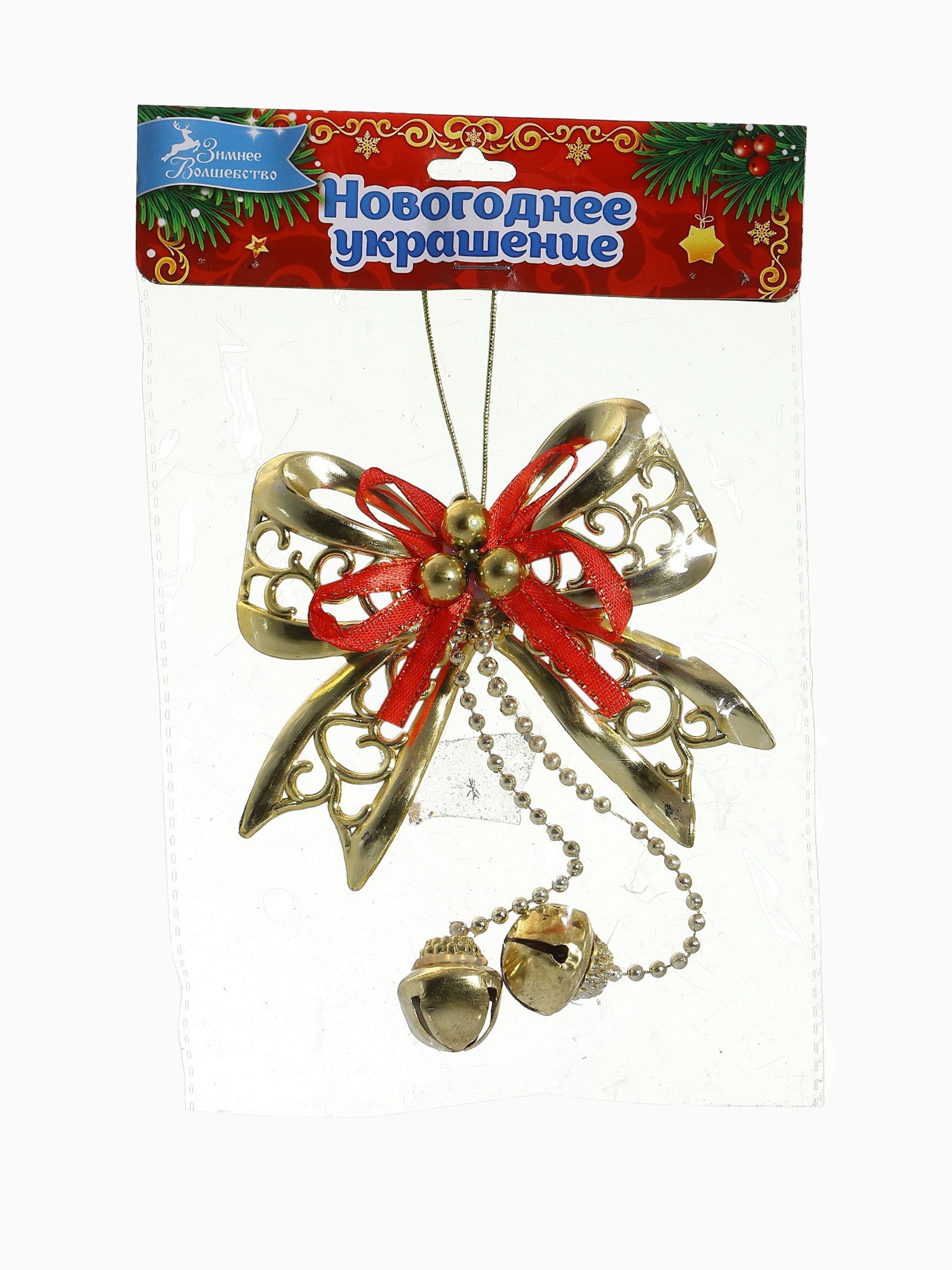 Ёлочная игрушка "Зимнее волшебство. Бантик с бубенчиками" пластик, 11.5x10 см, золотисто-красный, 11.5x10 см., Зимнее волшебство, Китай