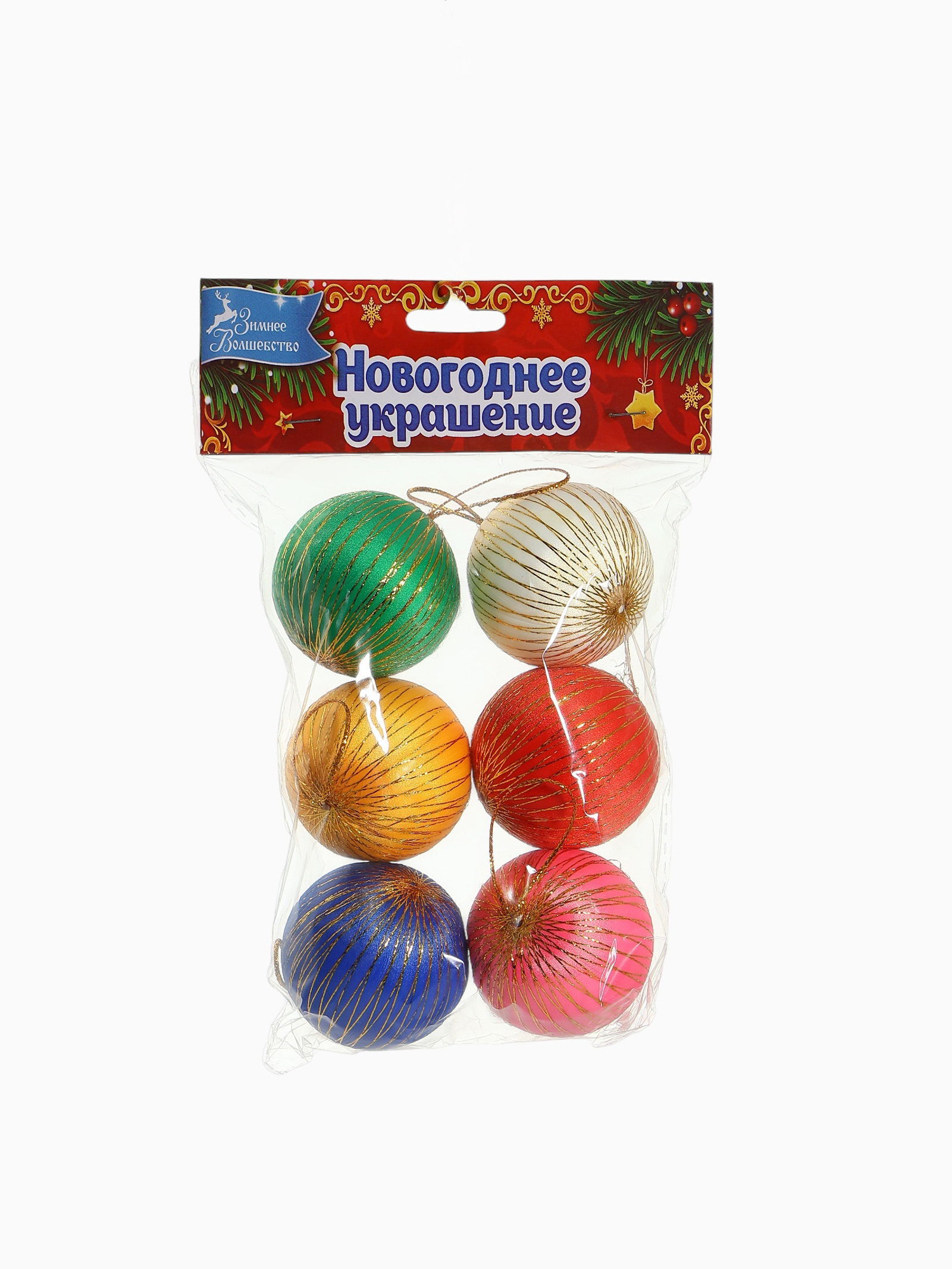 Ёлочные игрушки "Золотая нить", шары новогодние, d=5 см, набор 6 шт., МИКС, 5x5x5 см., Зимнее волшебство, Китай