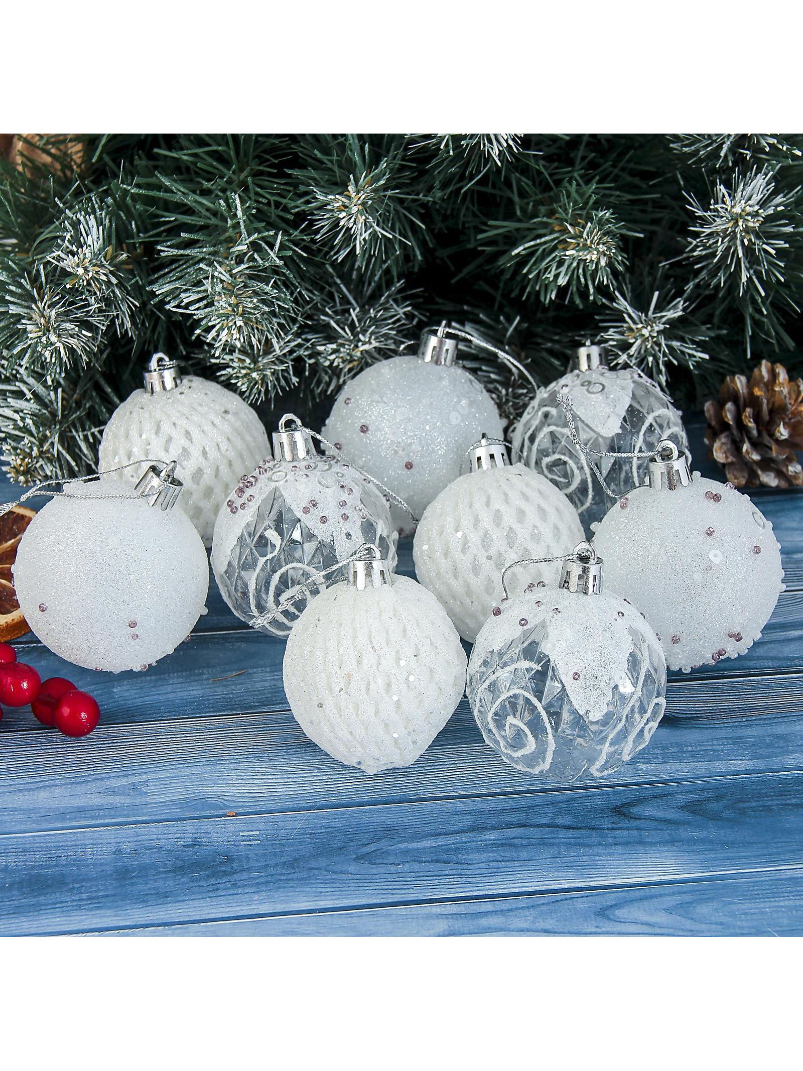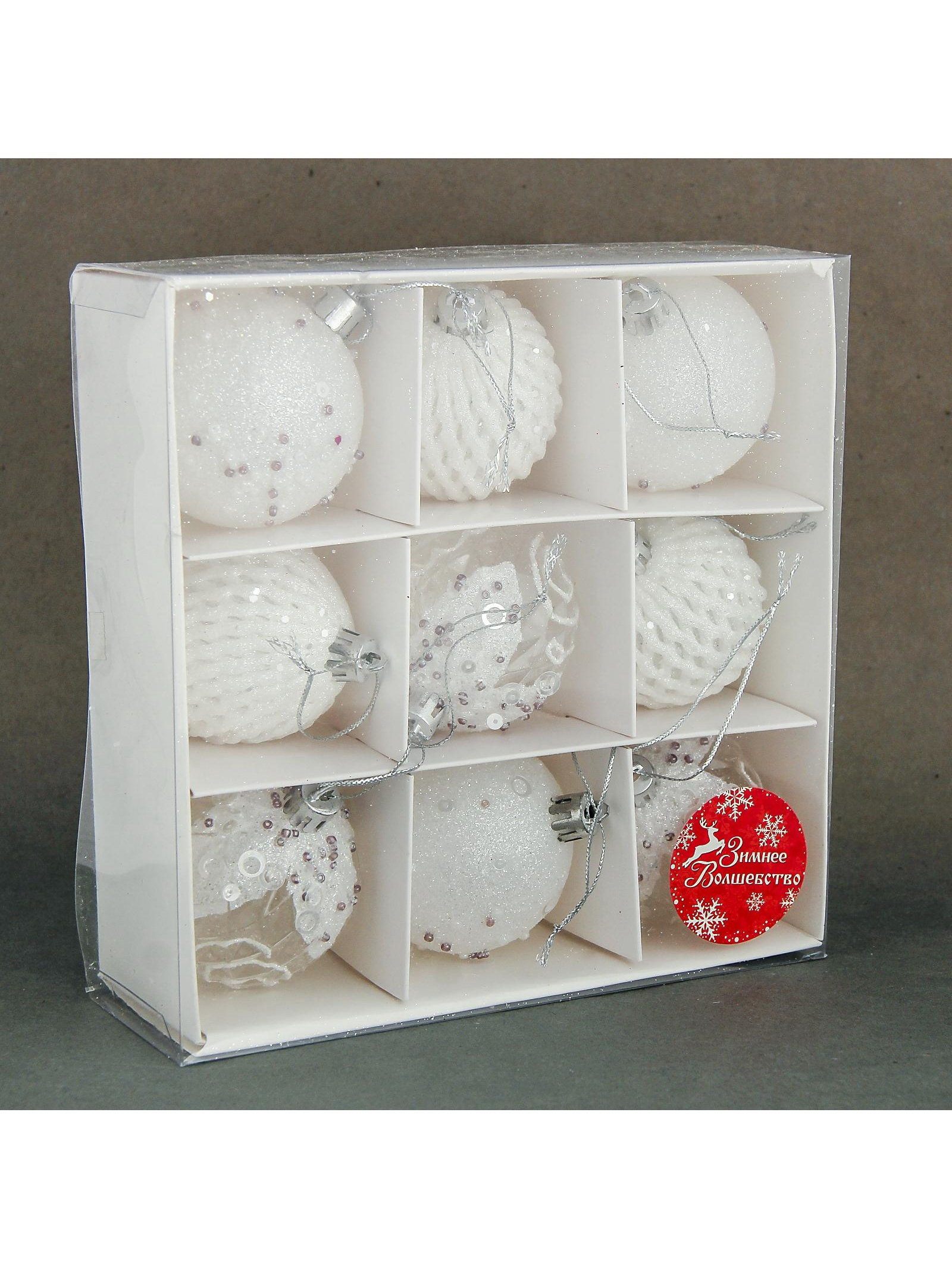 Ёлочные игрушки "Снежная изморозь", шары пластиковые, d=6 см, набор 9 шт., белый, 6x6 см., Зимнее волшебство, Китай