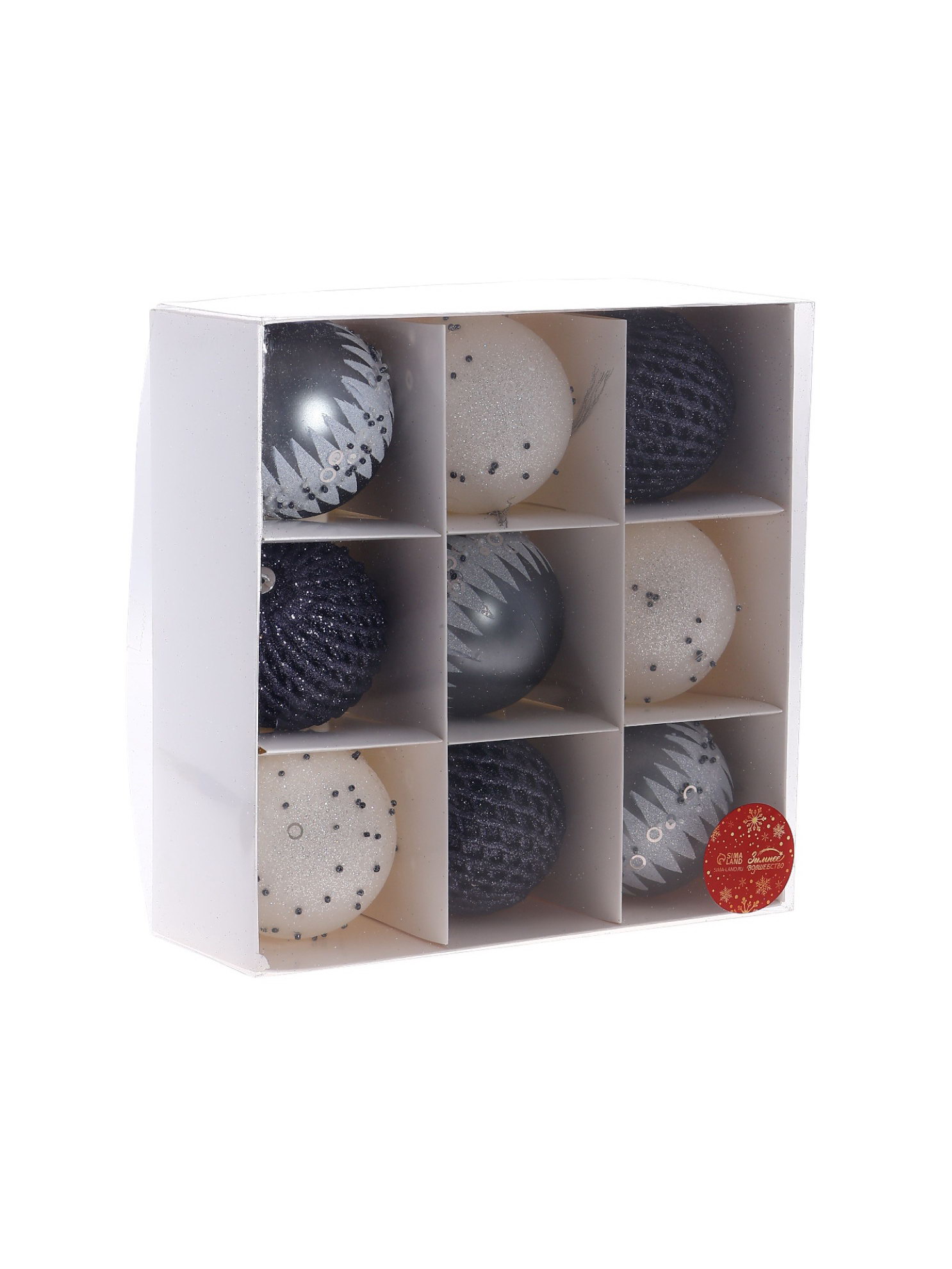 Особенности: Резная, С рисунком Цвет: Белый, МИКС, Серебристый Стиль: Ар-деко, Классика Размер упаковки: 8.5 x 8.5 x 24.5 см. Набор: Да Форма игрушки: Шар Символ года: Нет Тематика праздника: Новый год tnved: 9505109000 В наборе, шт.: 9 Диаметр шара, см: 8 Новогодние шары "Металлик" это стильный базис для праздничного декора. Набор из 9 пластиковых игрушек диаметром 8 см выполнен в бело-серебристой палитре с эффектом равномерного блеска. Такие украшения подходят под классический и ар-деко стиль, легко комбинируются и создают ощущение зимнего света без лишней вычурности. Что внутри