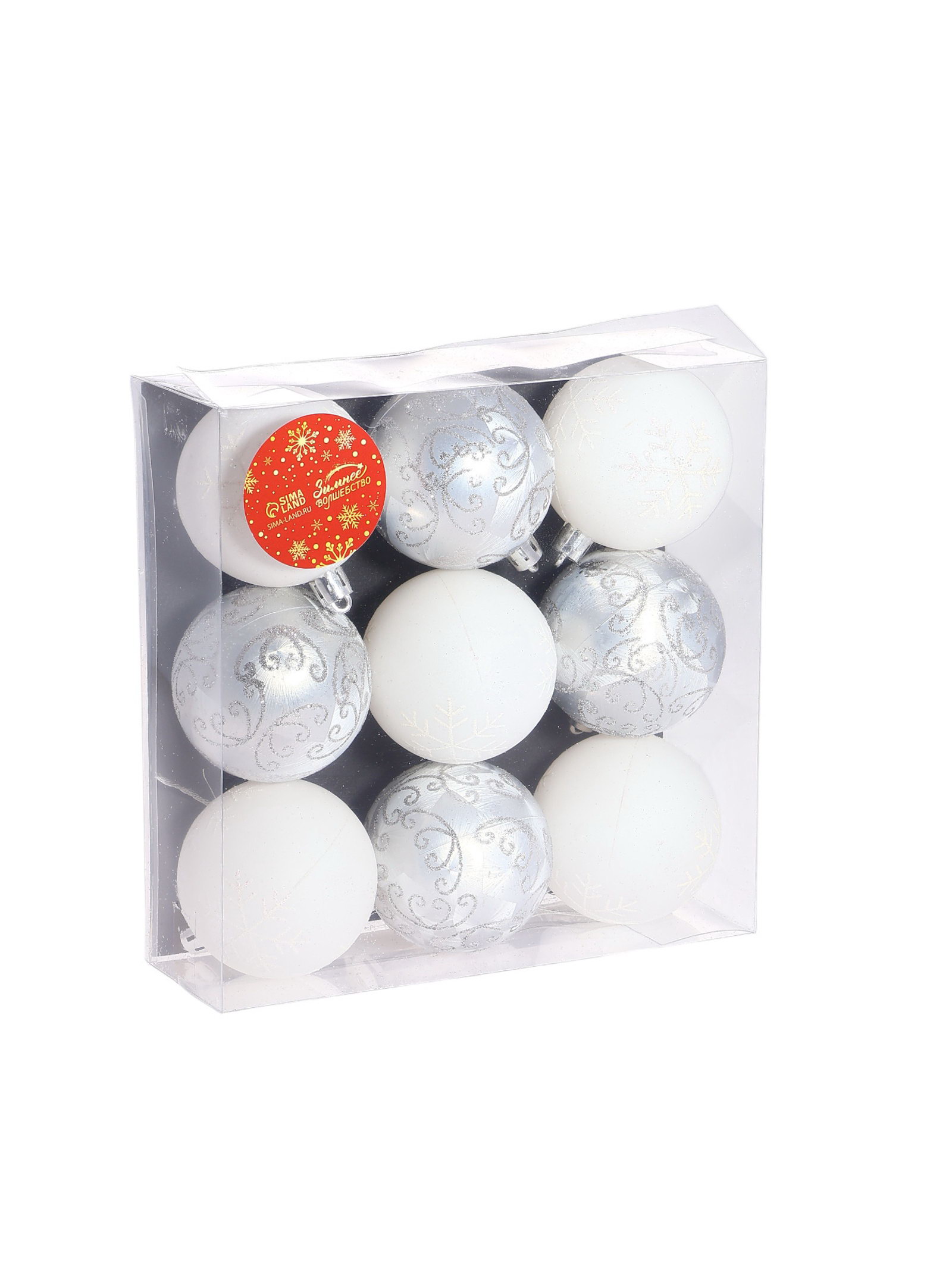 Ёлочные игрушки "Морозные узоры", шары новогодние, d=6 см, набор 9 шт., белый/серебро, 6x6 см., Зимнее волшебство, Китай