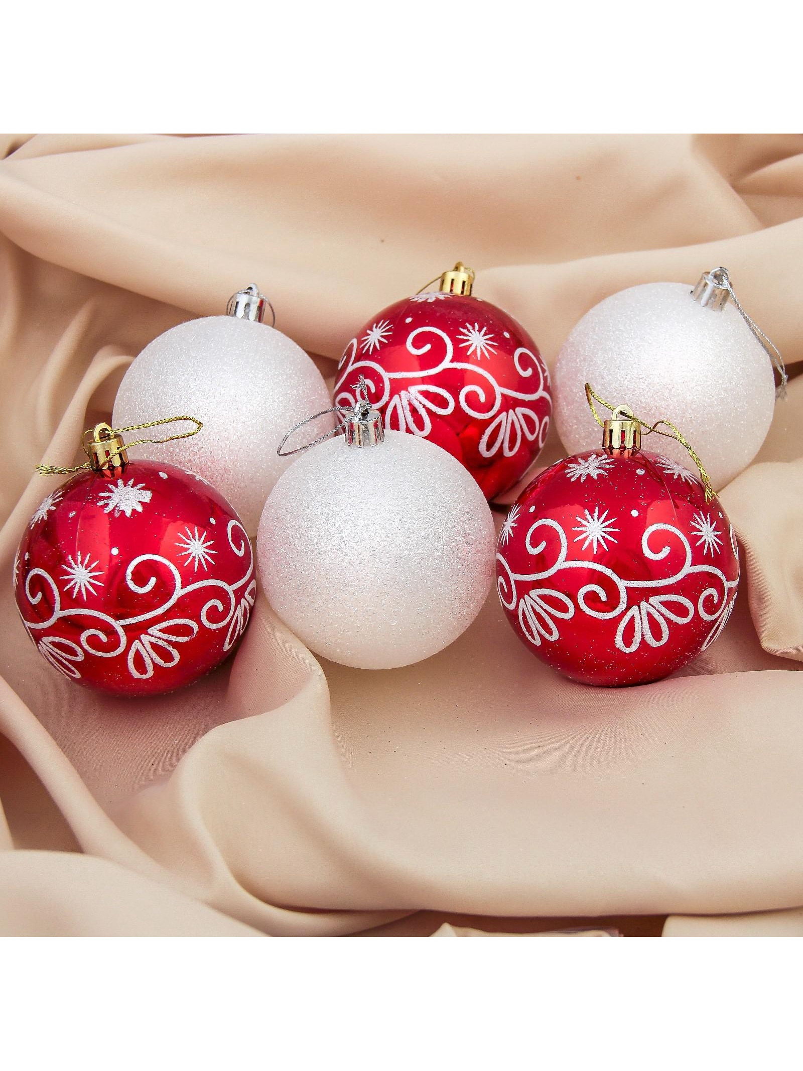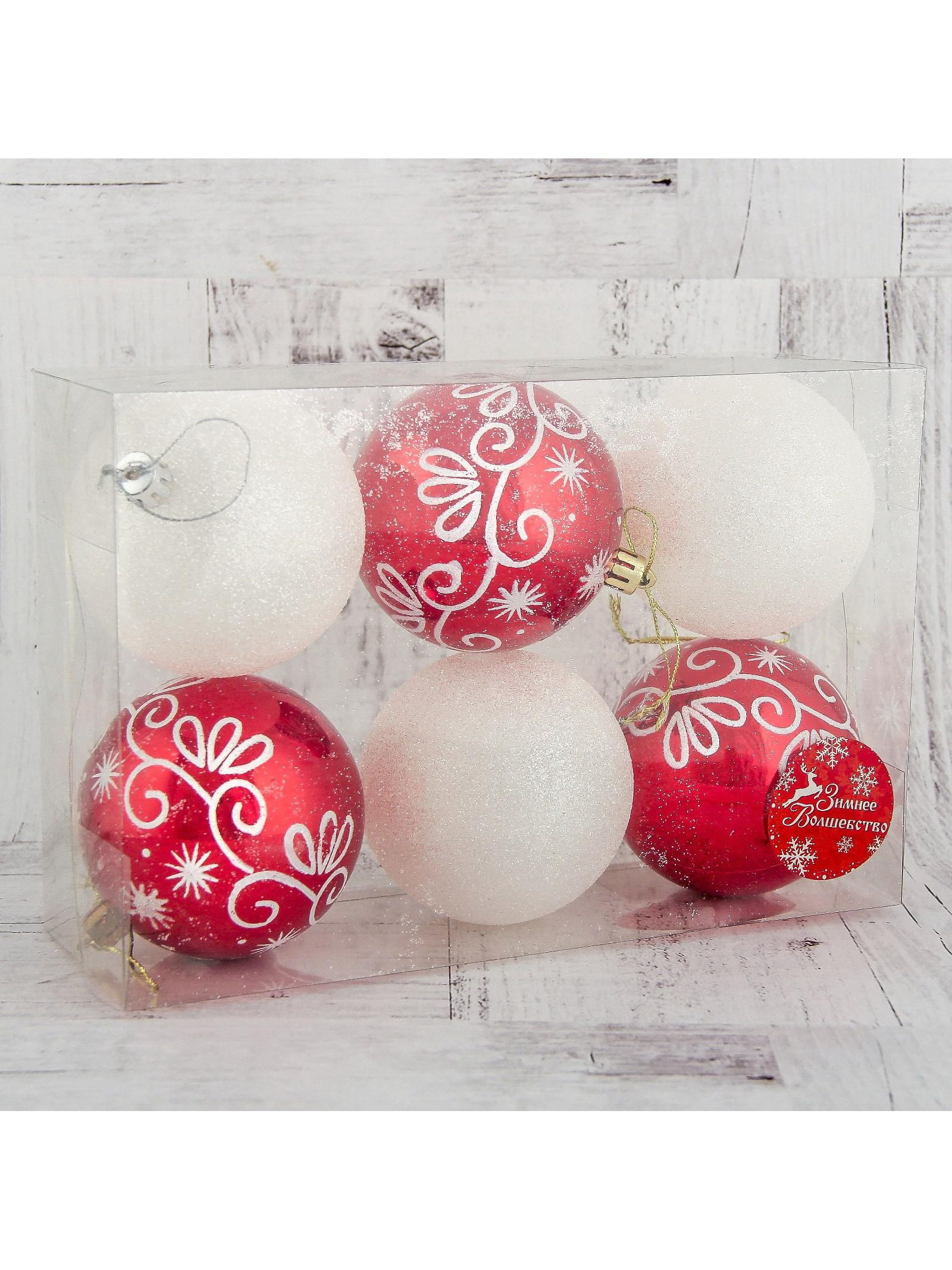 Ёлочные игрушки "Изящный узор", шары новогодние, d=8 см, 6 шт., красно-белый, 8x8 см., Зимнее волшебство, Китай