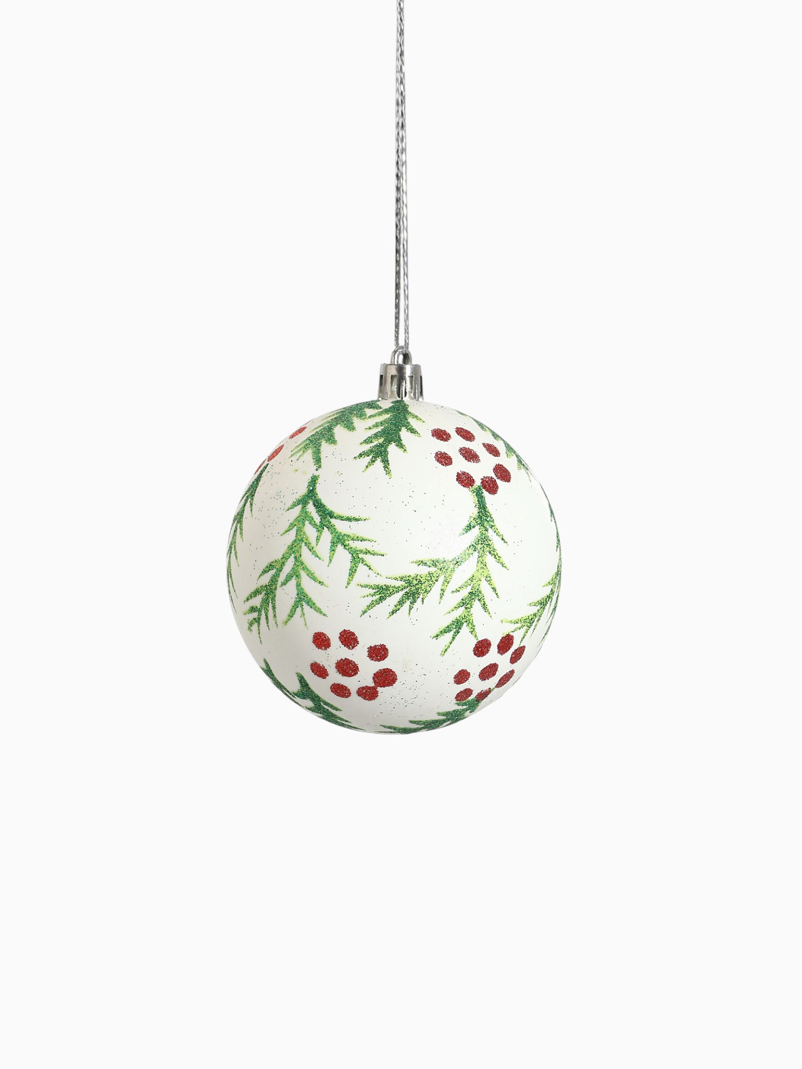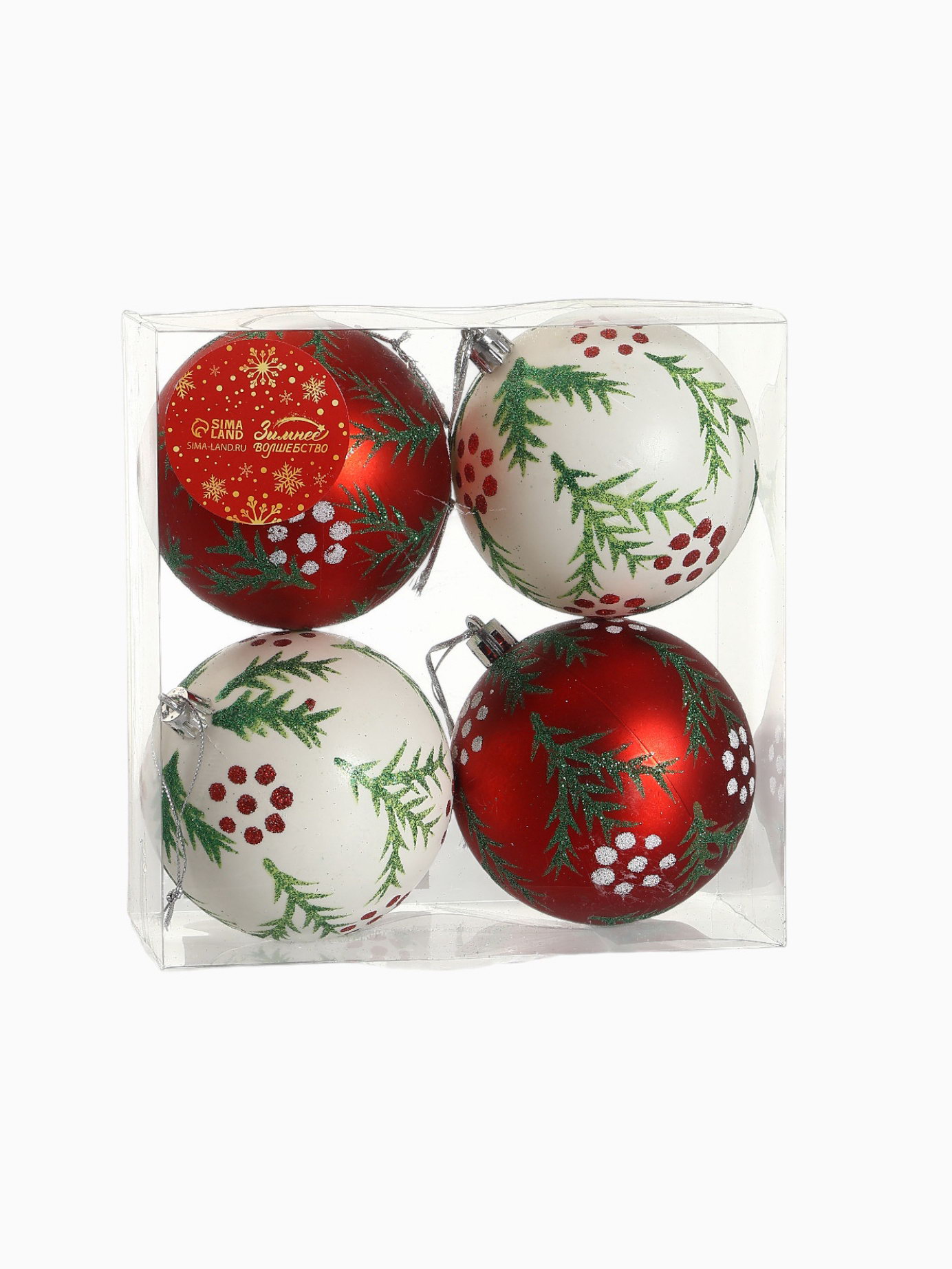 Ёлочные игрушки "Еловые веточки", шары новогодние, d=8 см, набор 4 шт., красный/белый, 8x8 см., Зимнее волшебство, Китай
