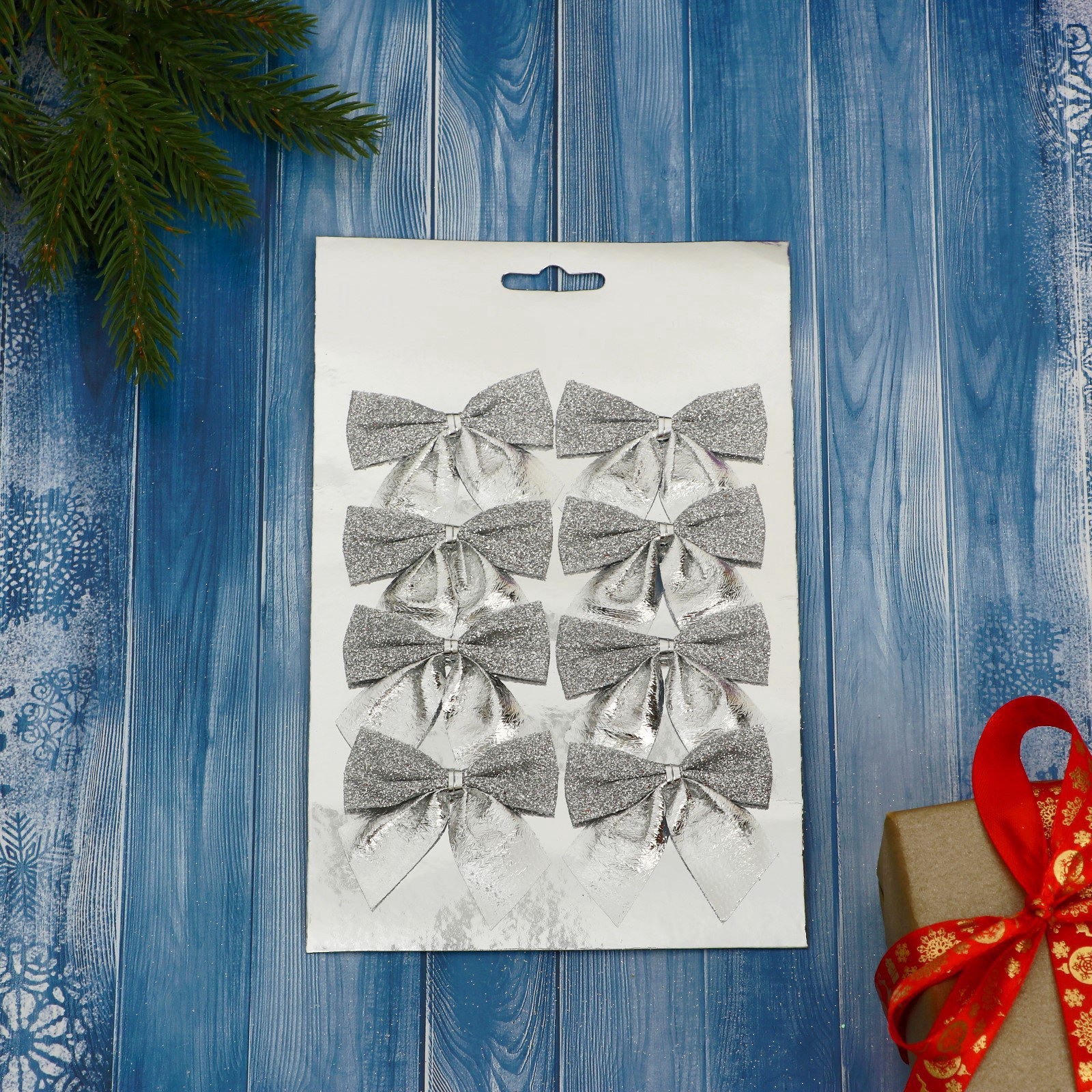 Стиль: Ар-деко, Датский, Скандинавский Размер упаковки: 12.5 x 22 x 0.4 см. Символ года: Нет Форма игрушки: Бант Набор: Да Цвет: Серебристый Высота, см: 4.5 Особенности: Однотонная tnved: 9505109000 В наборе, шт.: 8 Тематика праздника: Новый год Ёлочные игрушки "Бантик с блеском", 4,5x5,5 см, 8 шт., серебристые, текстиль это изящный и светлый акцент для новогоднего декора. Набор миниатюрных бантов с переливами подходит для ёлки в скандинавском стиле, гирлянды или подарочной композиции утончённое решение для тех, кто ценит порядок, лёгкость и атмосферу зимнего света без излишеств. Особенности