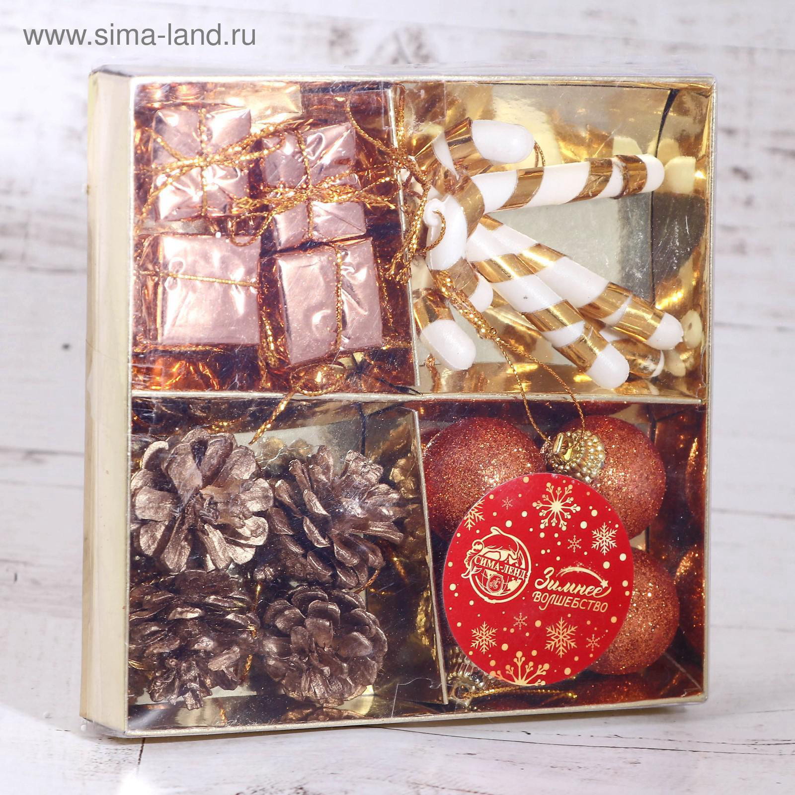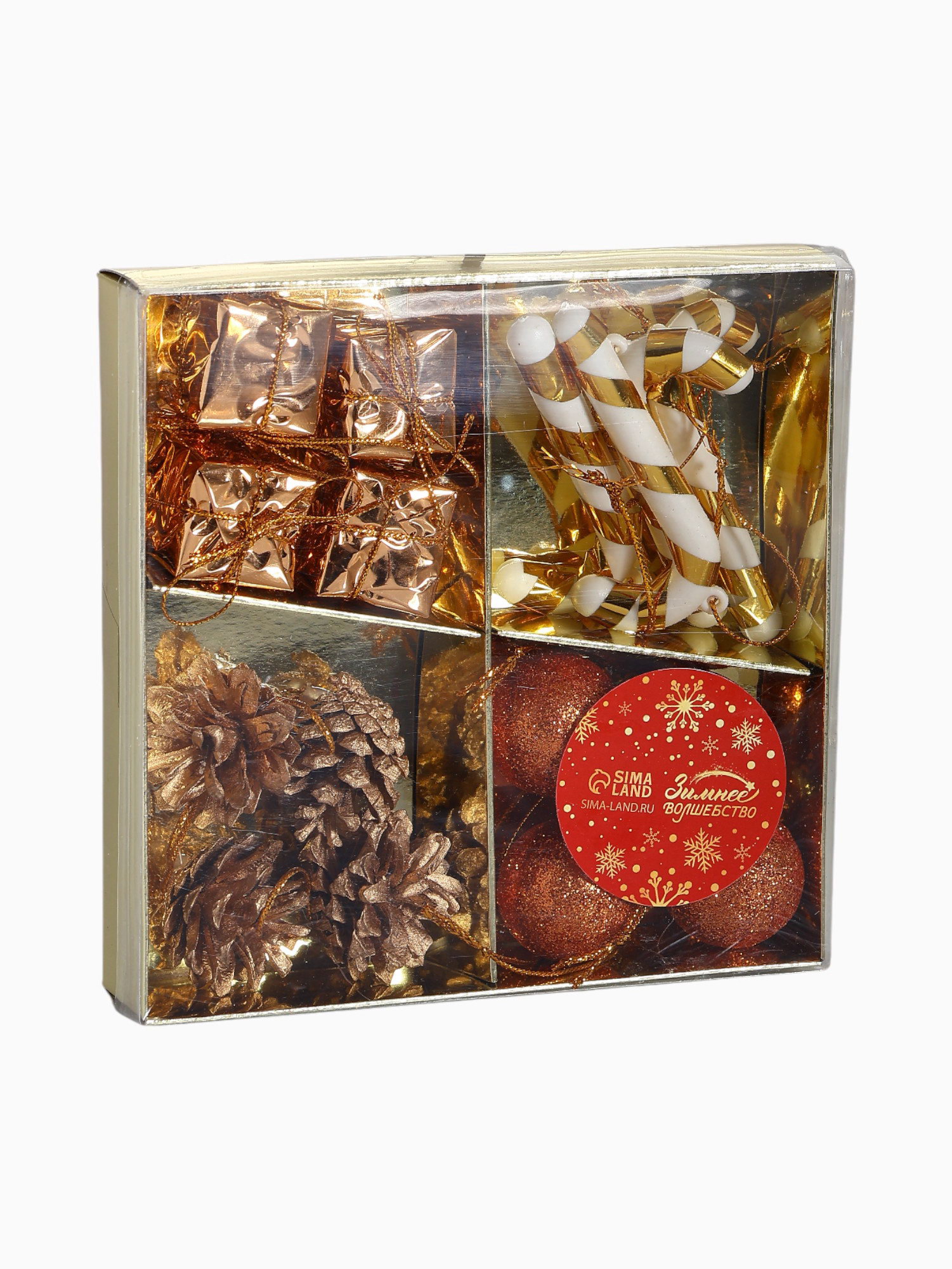Цвет: Золотистый, МИКС Стиль: Ар-деко, Датский Размер упаковки: 14 x 3 x 14 см. Набор: Да Форма игрушки: Набор Тематика праздника: Новый год Символ года: Нет tnved: 9505109000 tnved: 9505109000 Рисунок: Да В наборе, шт.: 16 Диаметр шара, см: 3 Особенности: Однотонная Новогодние игрушки "Сюрприз" это разнообразный и стильный набор для украшения ёлки в преддверии праздника. В комплекте 16 элементов: шары, шишки, палочки и мини-подарки диаметром 3 см, выполненные в золотистой и смешанной цветовой гамме. Украшения из пластика и дерева оформлены в стиле датского дизайна и ар-деко, что делает их универсальным решением для создания уютного и современного новогоднего интерьера. Особенности