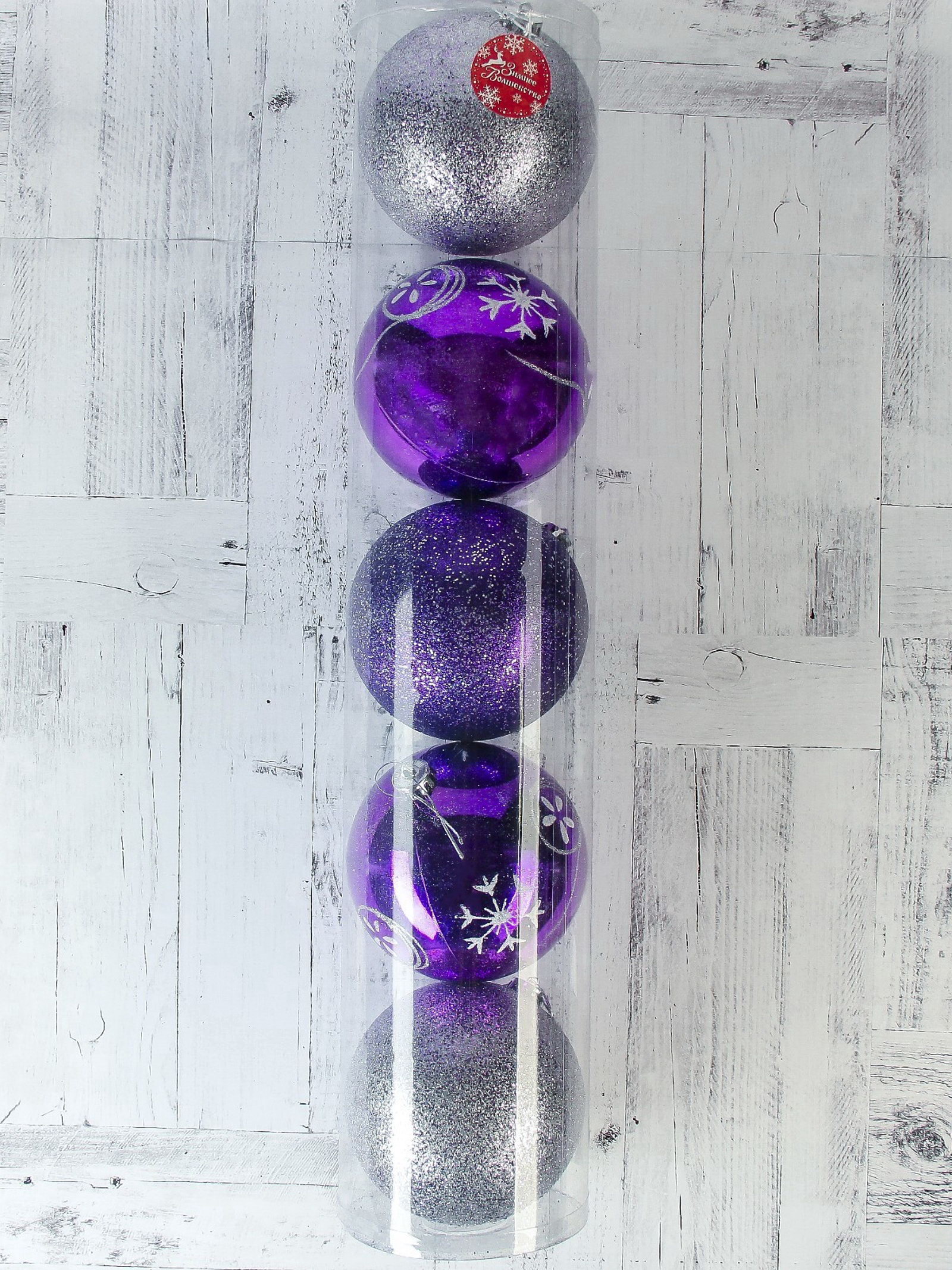 Цвет: Серебристый, Фиолетовый Особенности: Однотонная, С рисунком Размер упаковки: 14 x 14 x 69 см. Форма игрушки: Шар Тематика праздника: Новый год Символ года: Нет tnved: 9505109000 Рисунок: Да В наборе, шт.: 5 Диаметр шара, см: 14 Набор: Да Стиль: Фьюжн Эти шары напоминают о первом снеге, который мягко ложится на ветви вечернего леса, создавая ту самую атмосферу зимнего волшебства, которую мы так ждём каждый год. Их холодное серебро и глубокий фиолетовый переливаются в свете гирлянд, словно застывшие капли новогоднего чуда. Когда вешаешь их на ёлку, кажется, что украшаешь не просто дерево, а создаёшь собственный маленький мир, где возможны любые сказки. Особенности
