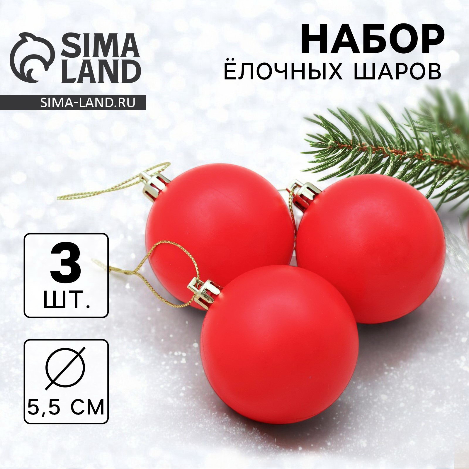 Ёлочные игрушки "Матовый", шары новогодние, d=5.5 см, набор 3 шт., красный, 10x5.5x11 см., Зимнее волшебство, Китай