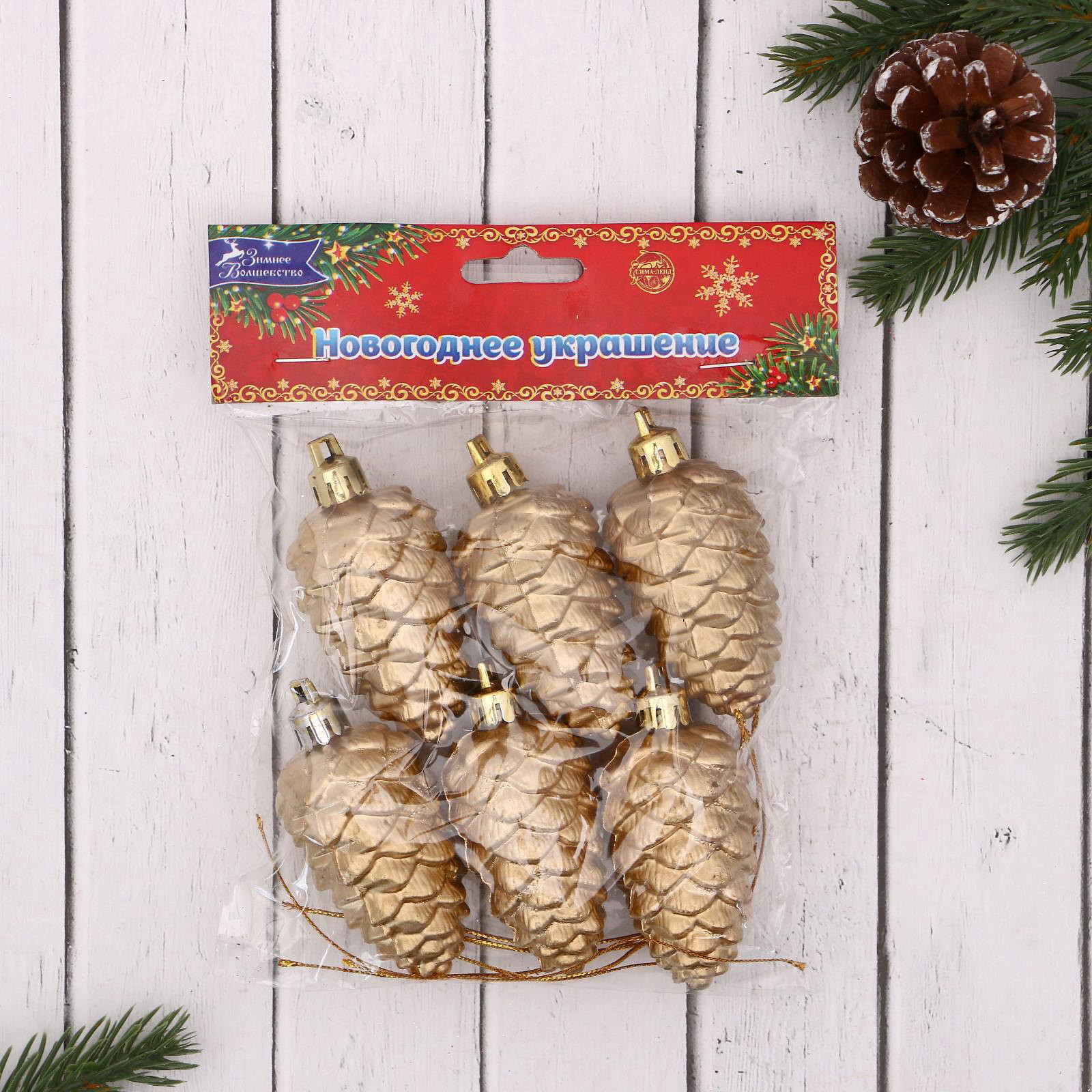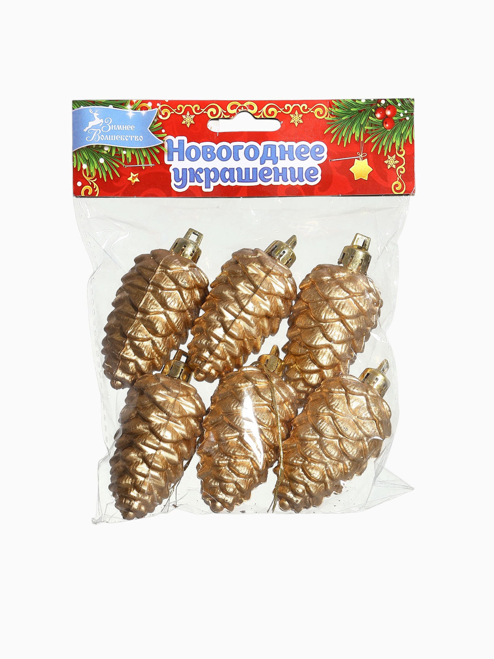 Ёлочные игрушки 6 шт. "Шишки" 3.5x6 см, золото, 3.5x6 см., Зимнее волшебство, Китай
