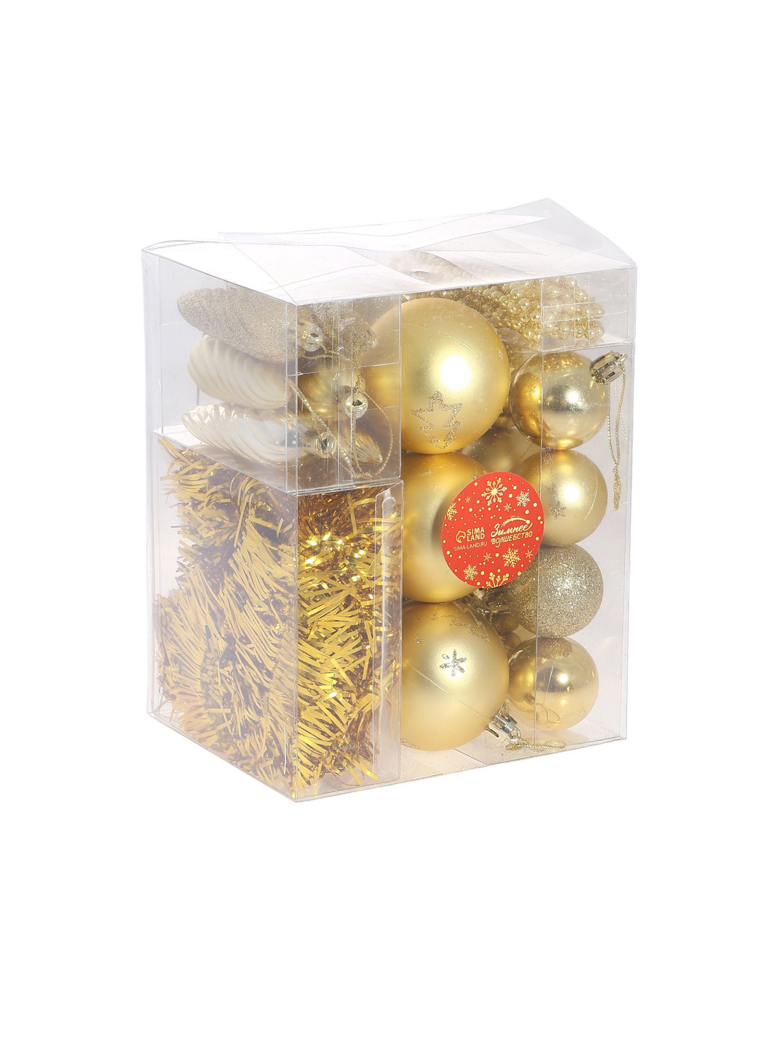 Ёлочные игрушки "Новогоднее веселье", набор 26 шт., с бусами и мишурой, золото, 14x12x18 см., Зимнее волшебство, Китай