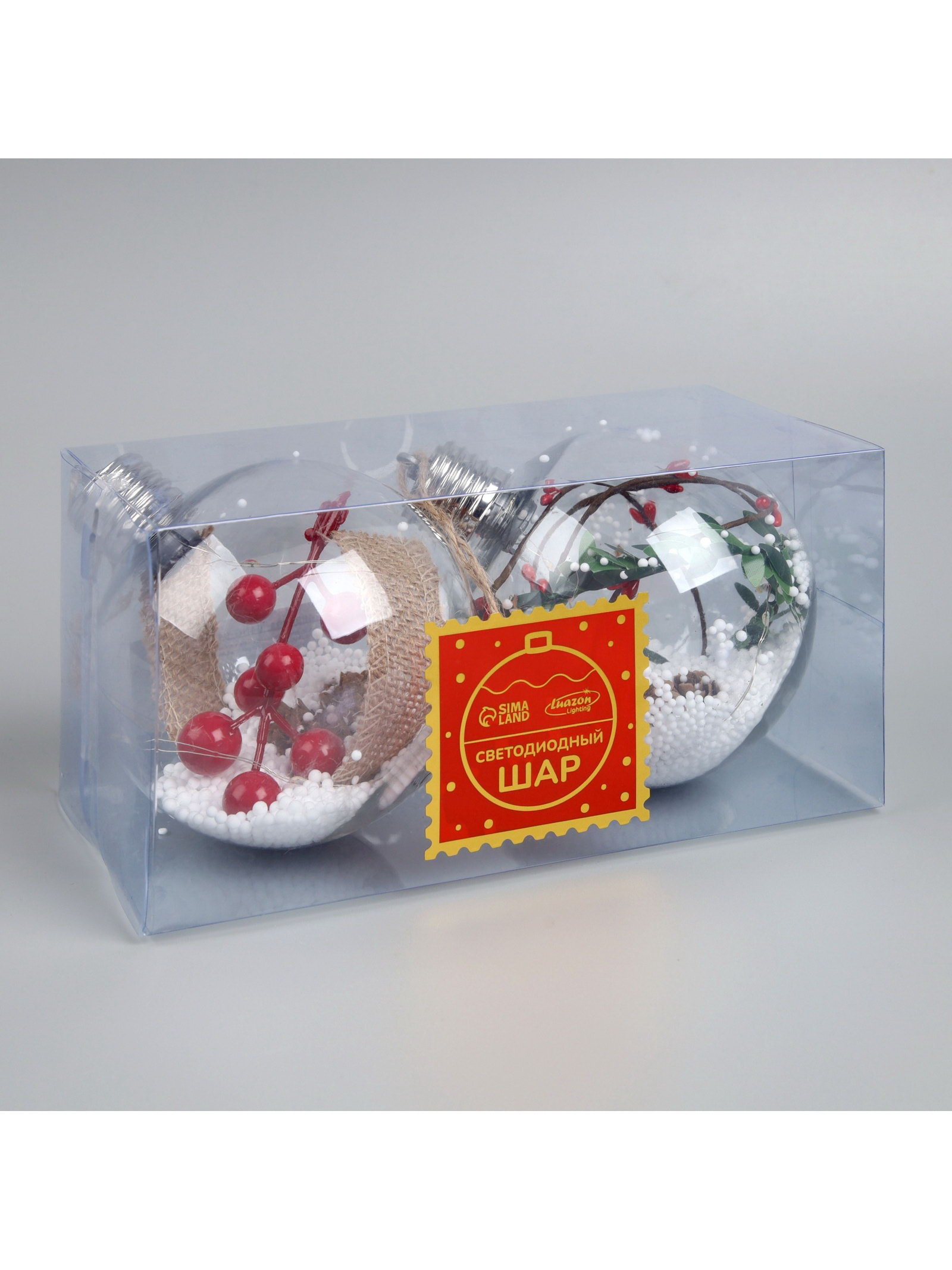 Набор ёлочных шаров "Ветка ели и ягоды", 2 шт, d=10 см, 5 LED, от батареек, свечение тёплое белое, 10x10x10 см., Luazon Lighting, Китай