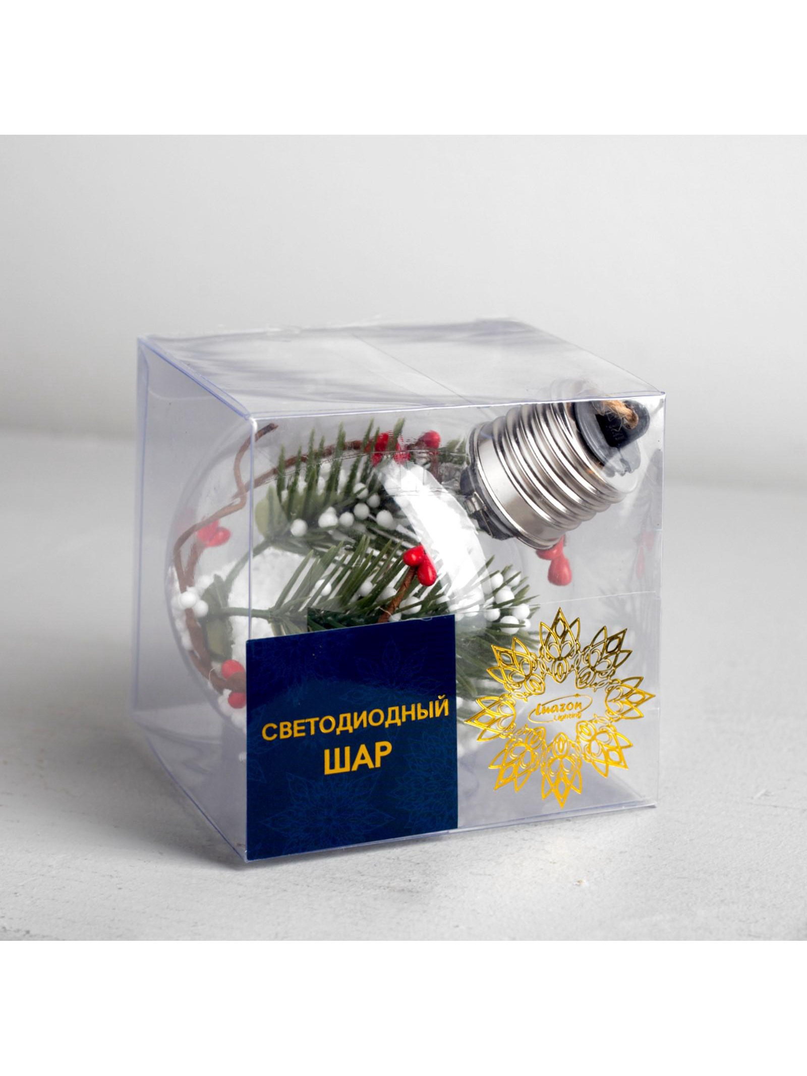 Ёлочный шар "Ветка ели", 1 LED, от батареек, свечение тёплое белое, 8x8x8 см., Luazon Lighting, Китай