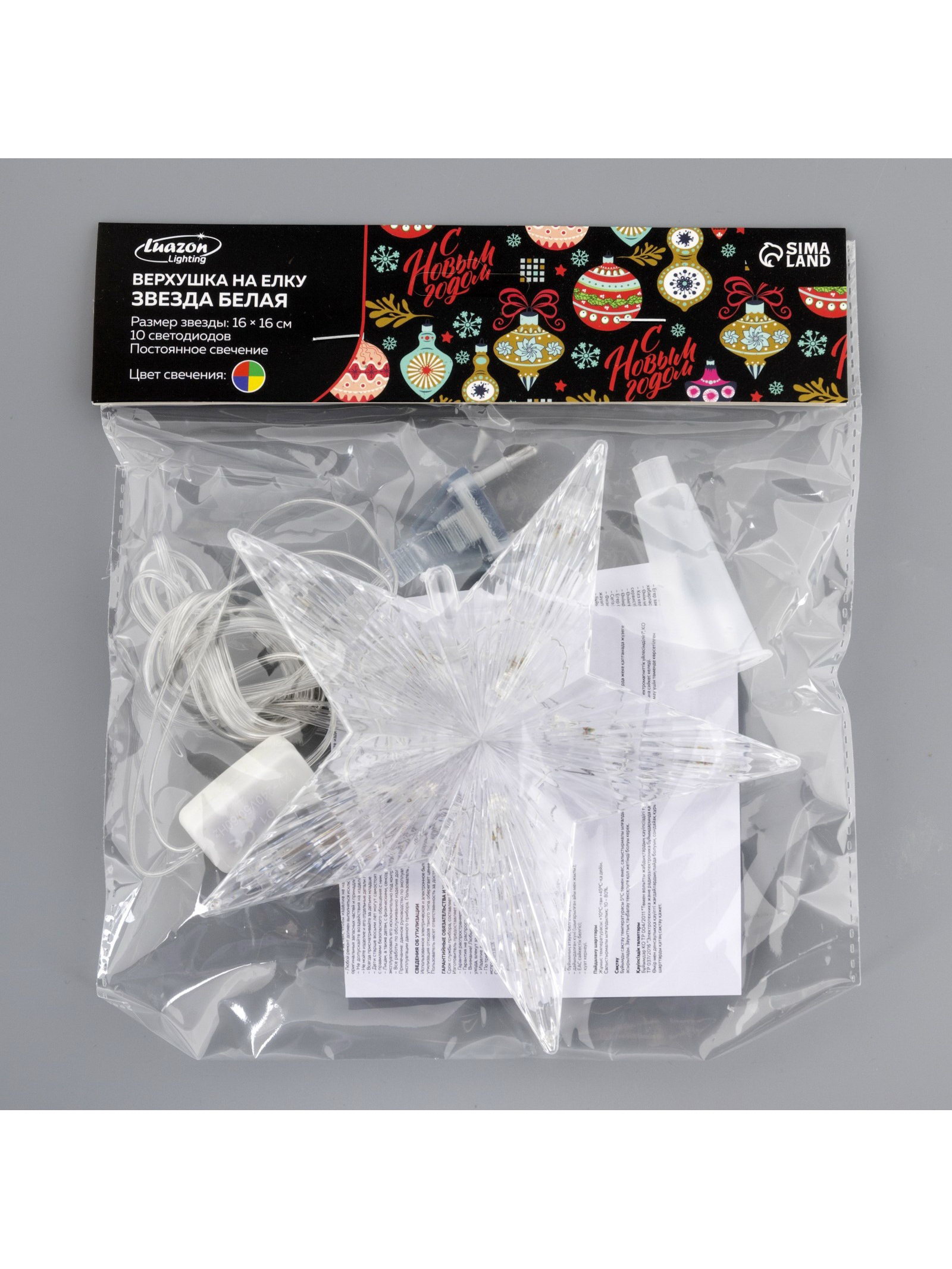 Светодиодная верхушка на ёлку "Звезда белая", 16 см, 10 LED, 220 В, свечение мульти, 3x15x15 см., Luazon Lighting, Китай