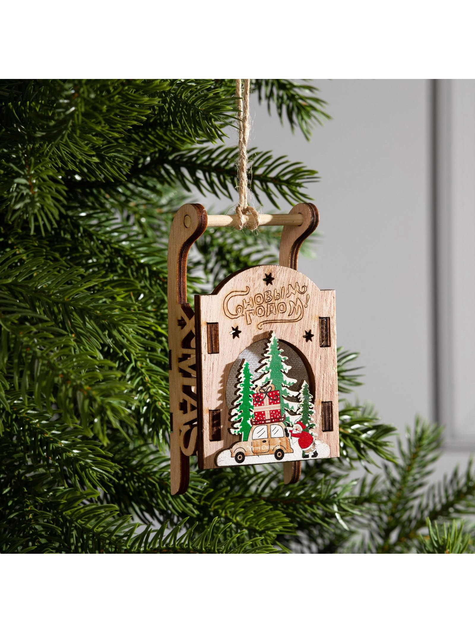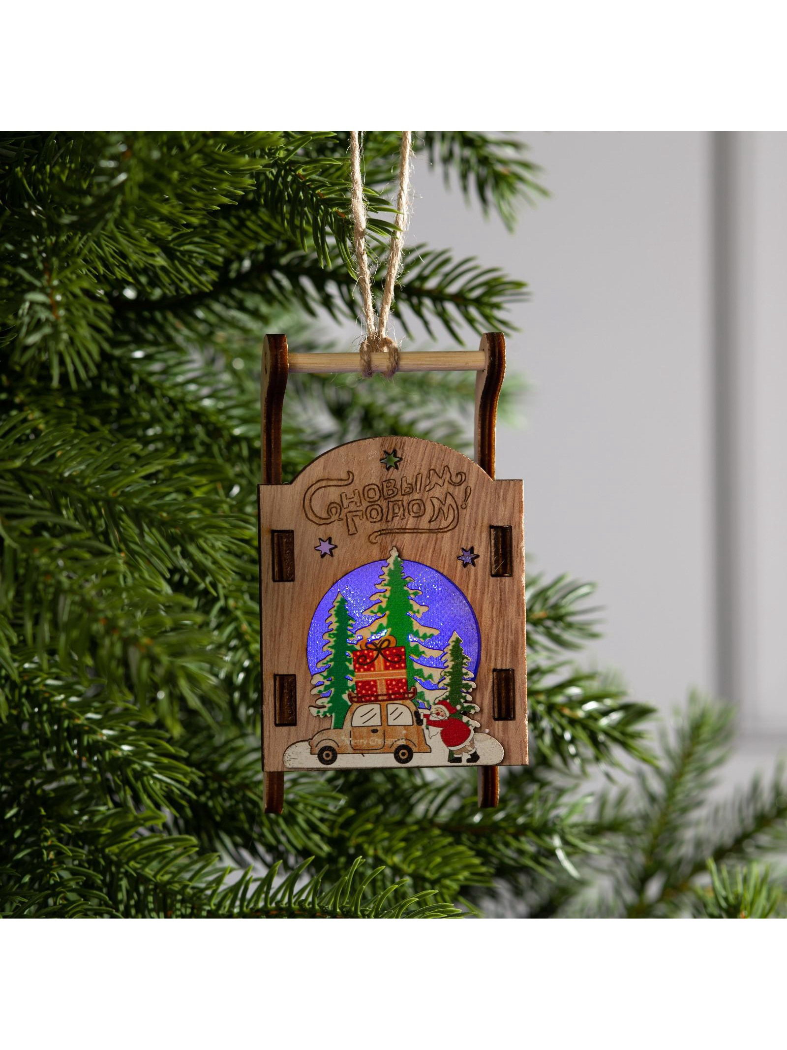 Ёлочная игрушка "Сани с Дедом Морозом и машиной", от батареек LR41x3, свечение RGB, 12x6x4 см., Luazon Lighting, Китай