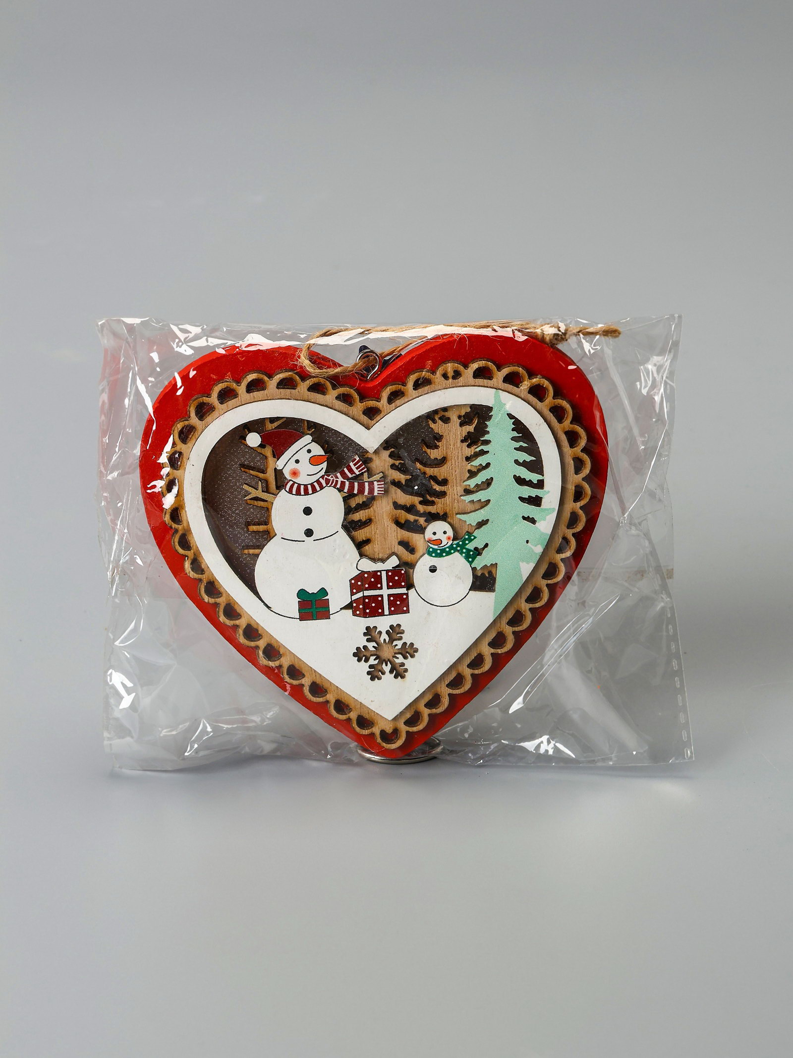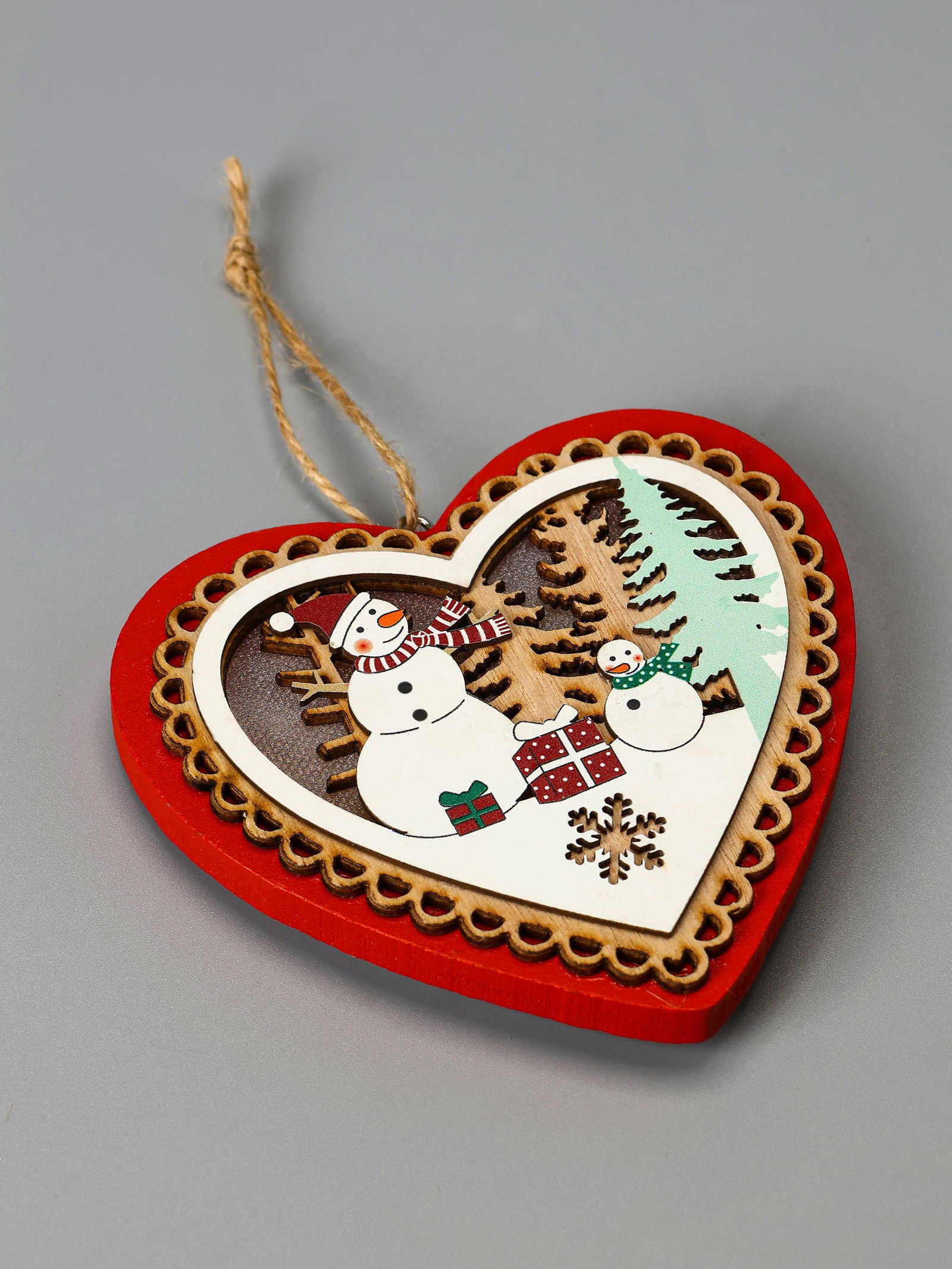 Ёлочная игрушка "Красное сердце со снеговиком", 11.5x10.5x1.5 см, от батареек, свечение тёплое белое, 12x12x1.5 см., Luazon Lighting, Китай