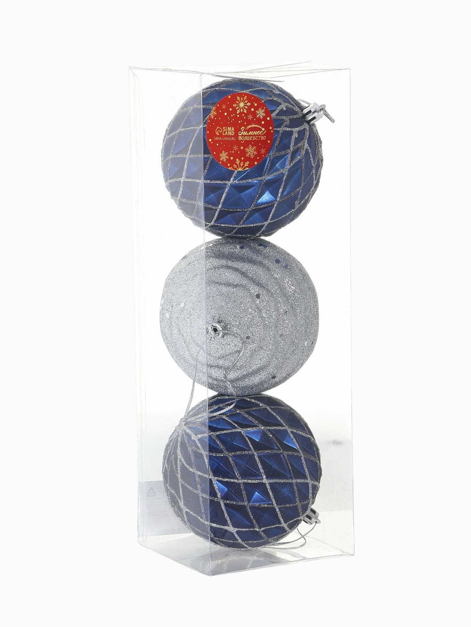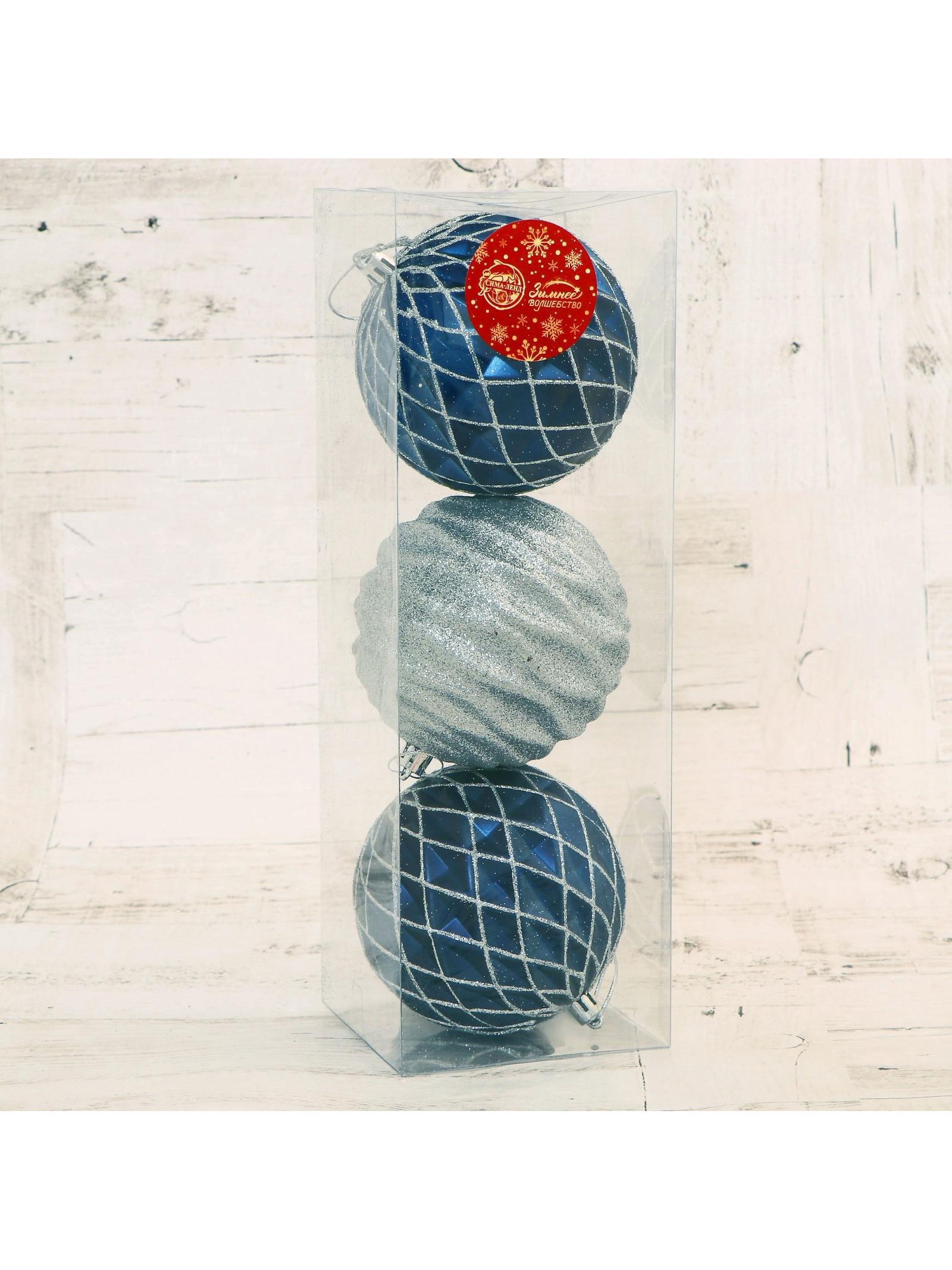 Ёлочные игрушки "Корнелия сеточка", шары новогодние, d=10 см, набор 3 шт., серебристо-синий, 10x10 см., Зимнее волшебство, Китай