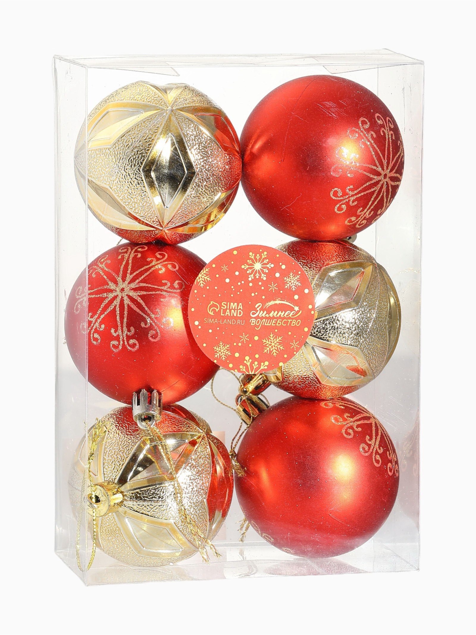 Ёлочные игрушки, шары новогодние, пластик, набор d=6 см, 6 шт. "Беата узоры" золотисто-красный, 6x6 см., Зимнее волшебство, Китай