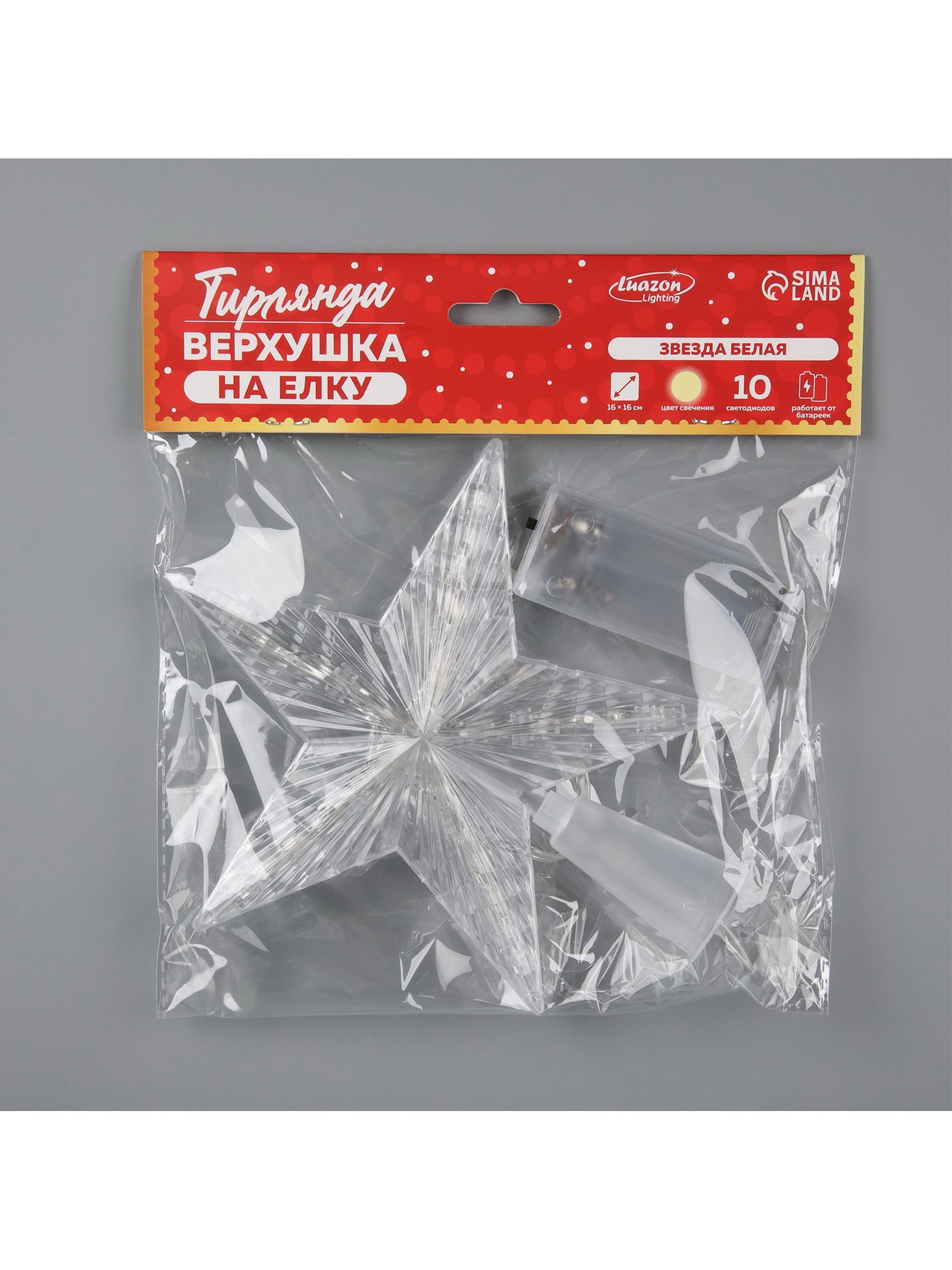 Светодиодная верхушка на ёлку "Звезда белая", 16 см, 10 LED, от батареек ААх2, фиксинг, свечение тёплое белое, 18x18x1.5 см., Luazon Lighting, Китай