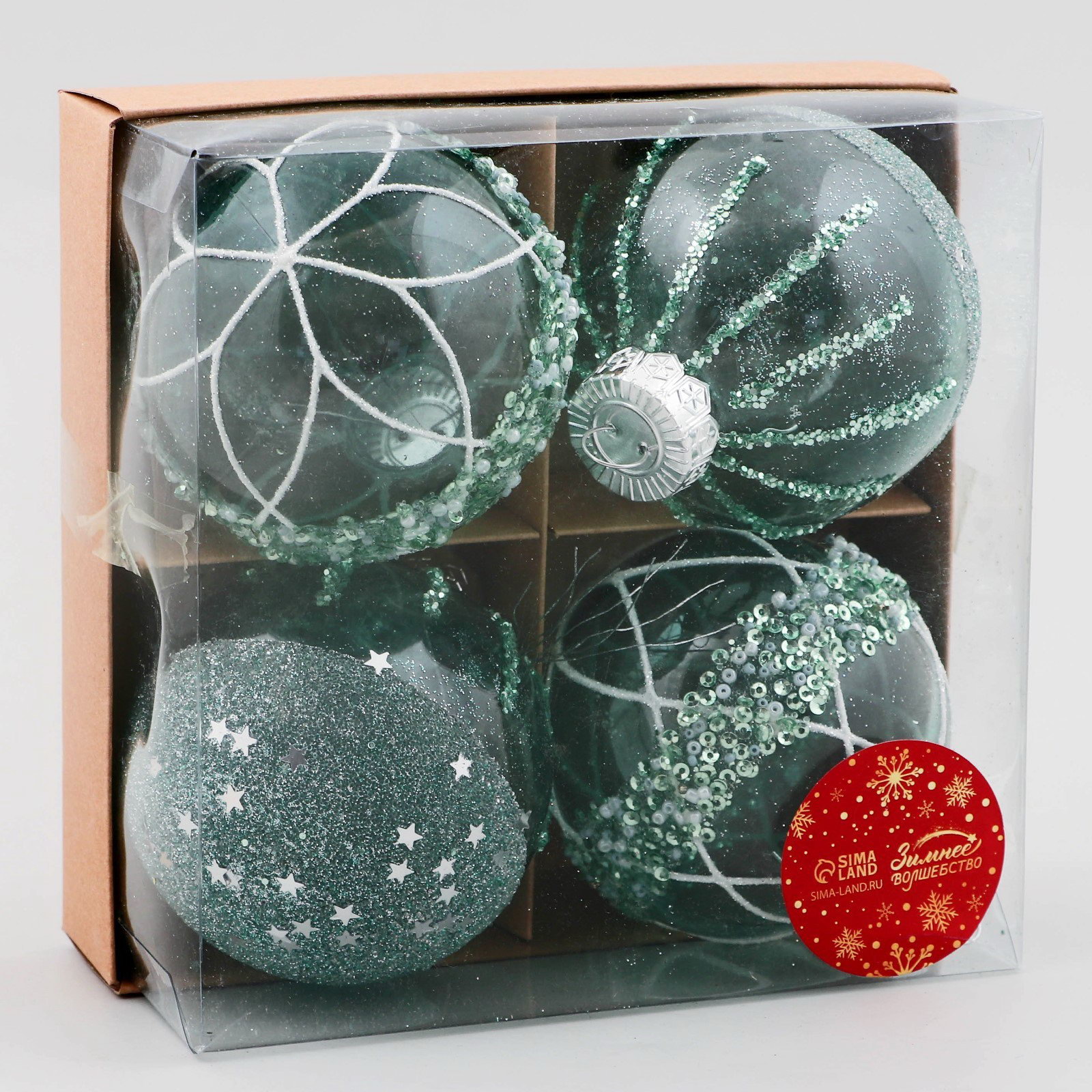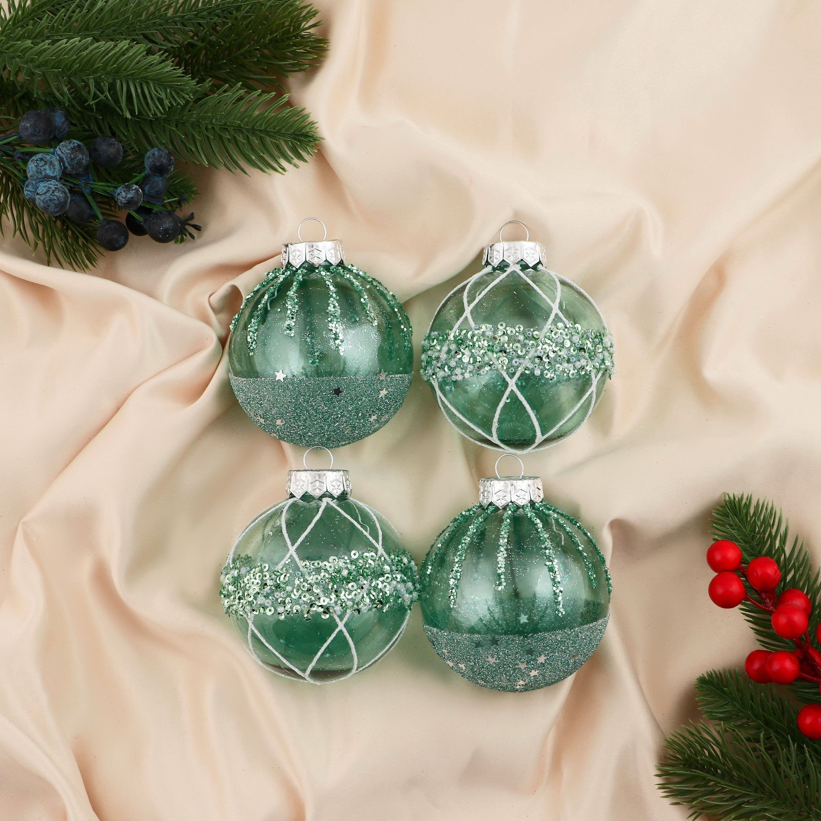 Набор ёлочных шаров 4 шт. "Жаклин", d=8 см, зелёный, 8x8 см., Зимнее волшебство, Китай