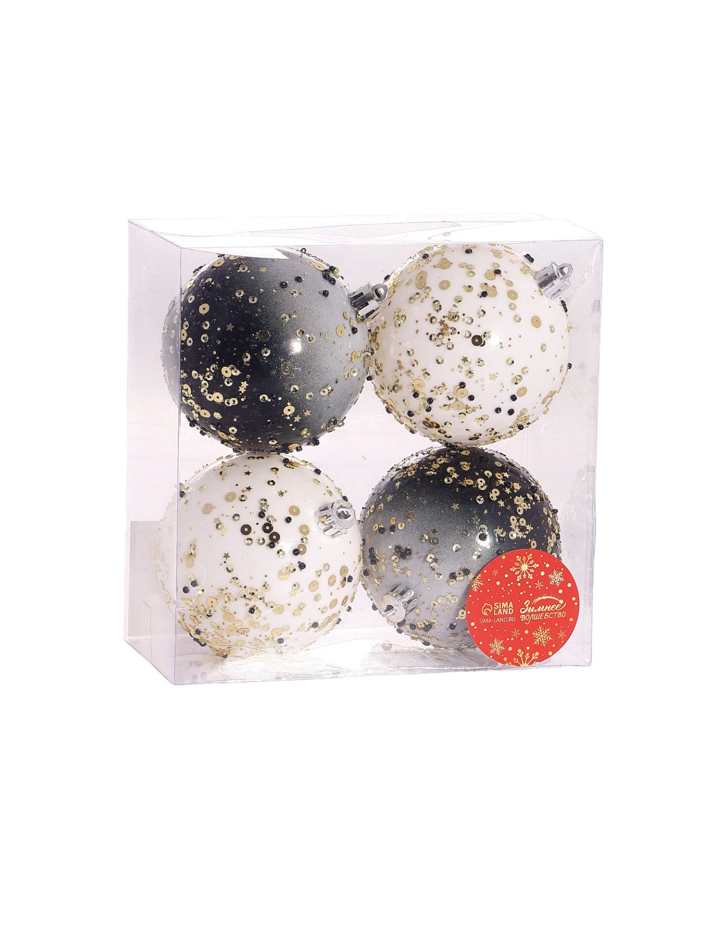 Ёлочные игрушки "Мюриель" блеск, шары новогодние, d=8 см, набор 4 шт., чёрный/белый, 8x8 см., Зимнее волшебство, Китай