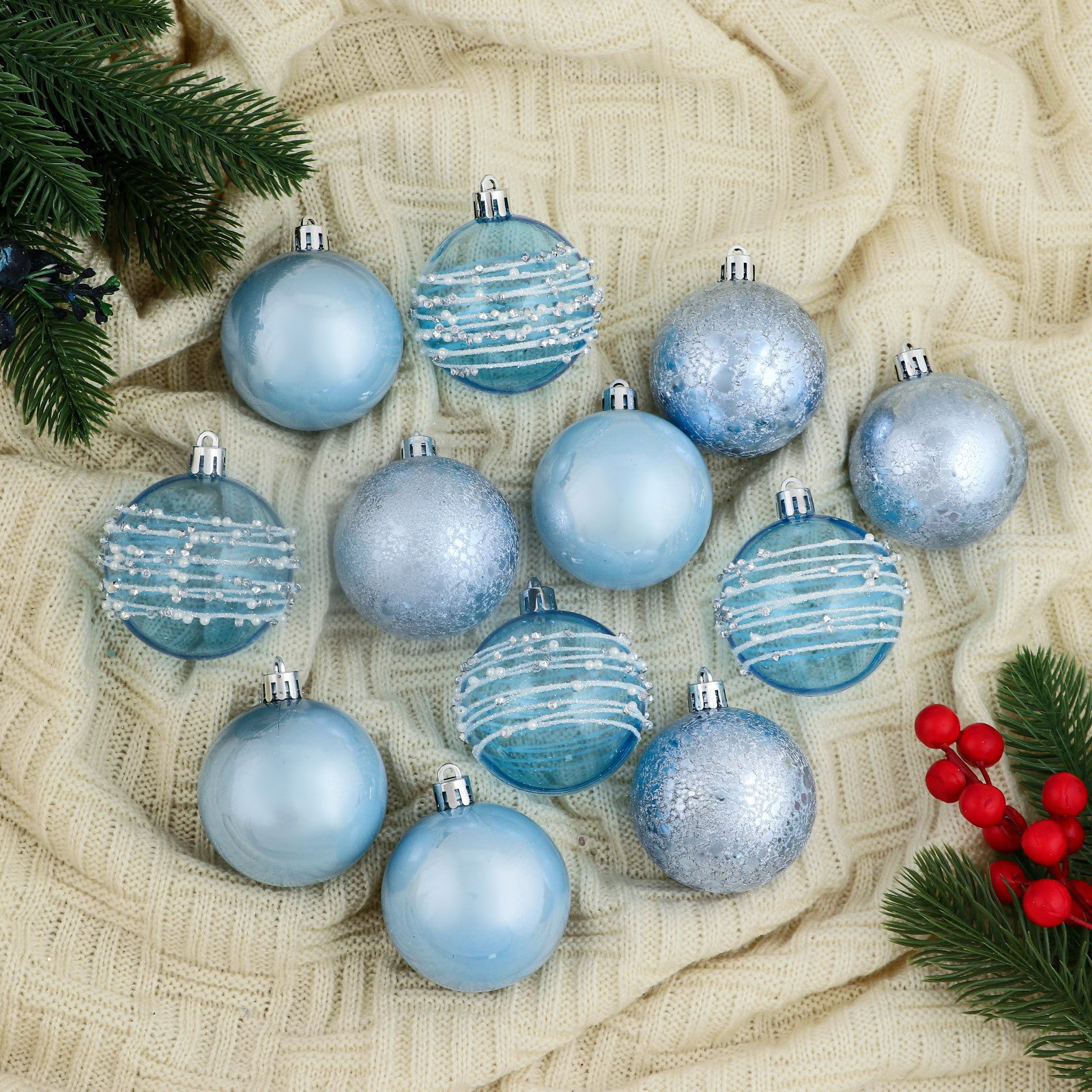 Создаём зимнее настроение Голубые прозрачные шары с орбитальными узорами напоминают о морозных узорах на окнах и лёгком снежном сиянии. Их оформление помогает сформировать атмосферу спокойствия и волшебства, делая праздничный декор лёгким и изящным. | ||