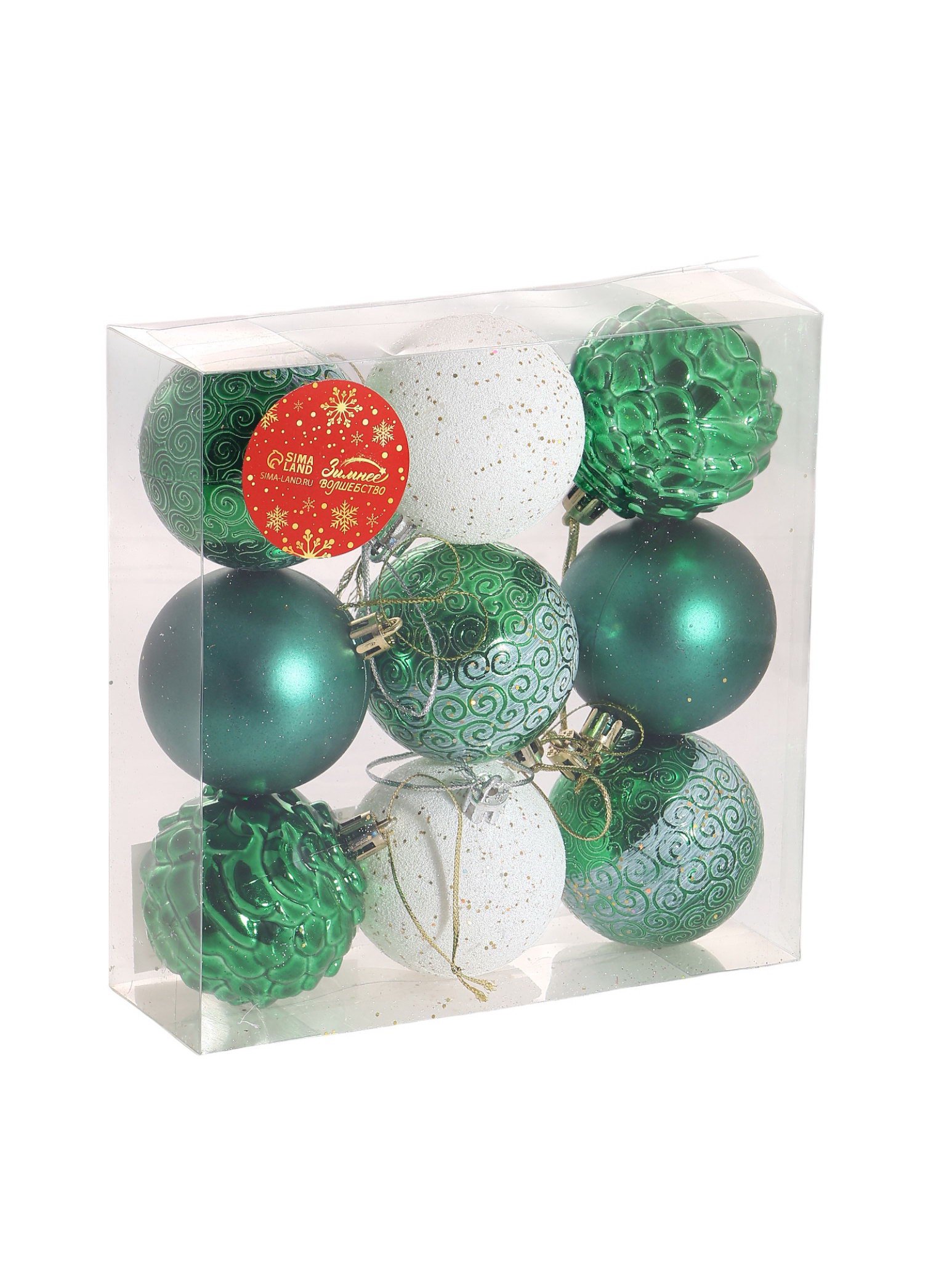Ёлочные игрушки "Гармония", шары новогодние, набор 9 шт., d=5.5 см, зелёный/белый, 5.5x5.5 см., Зимнее волшебство, Китай