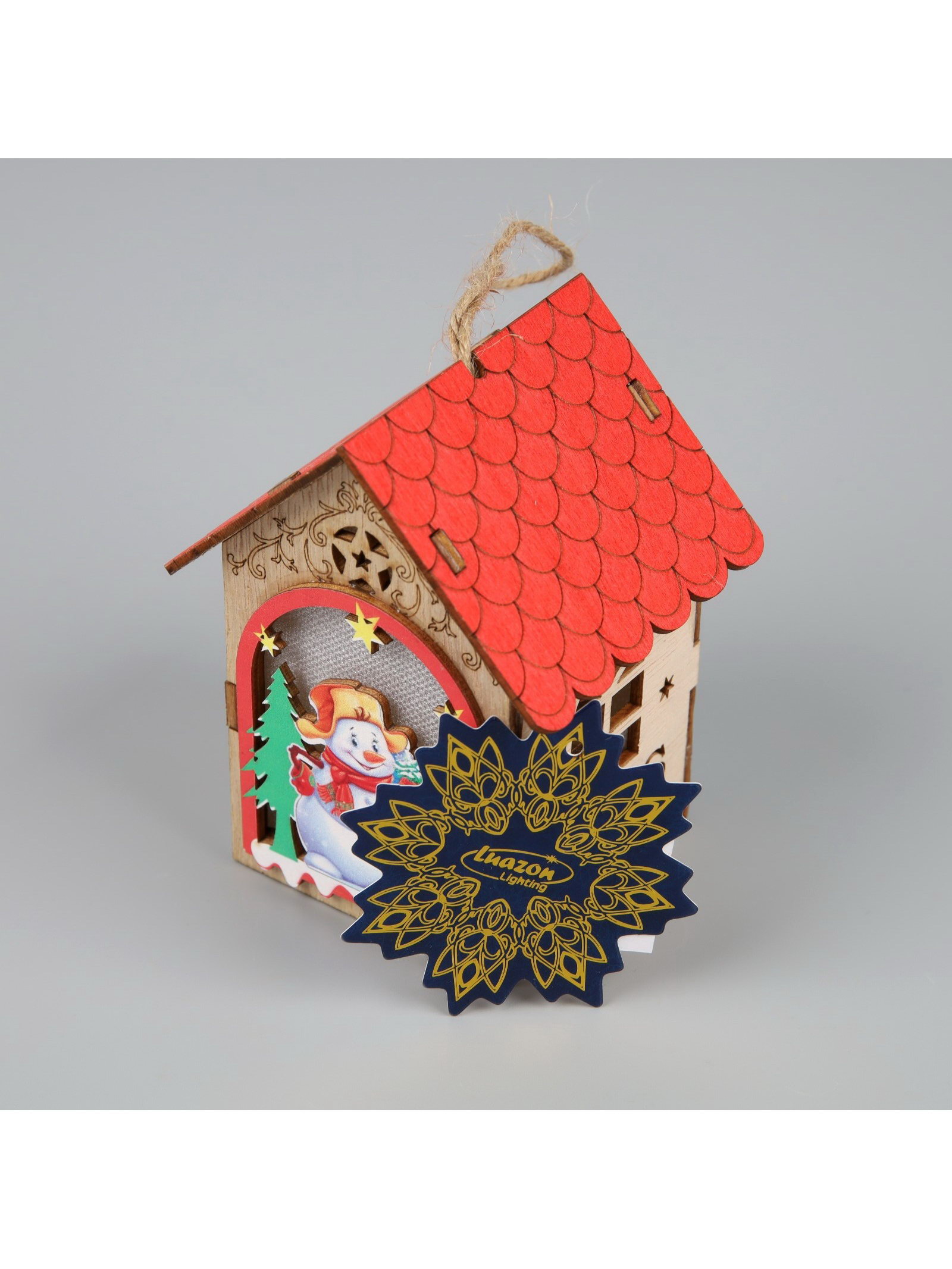 Ёлочная игрушка "Домик со снеговиком", 11х8.5х7.5 см, 1 LED, от батареек, свечение тёплое белое, 10x12x8 см., Luazon Lighting, Китай