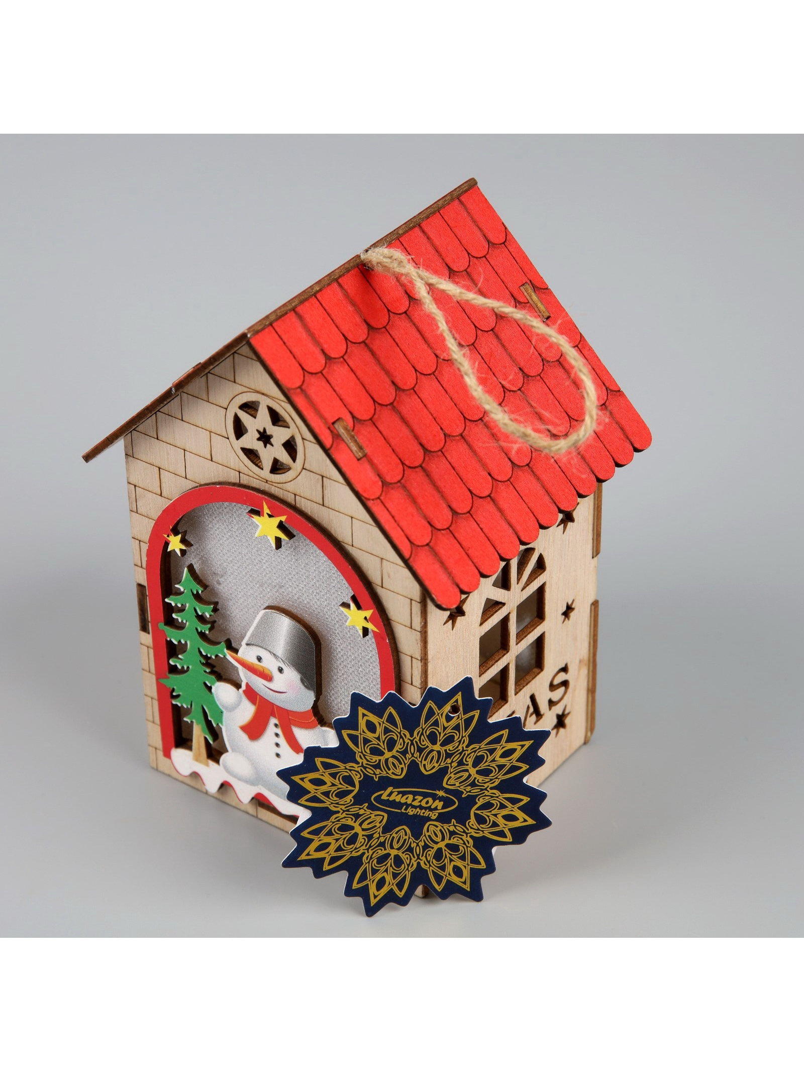 Ёлочная игрушка "Домик со снеговиком", 14.5х11х8.5 см, 1 LED, от батареек, свечение тёплое белое, 12x15x9 см., Luazon Lighting, Китай