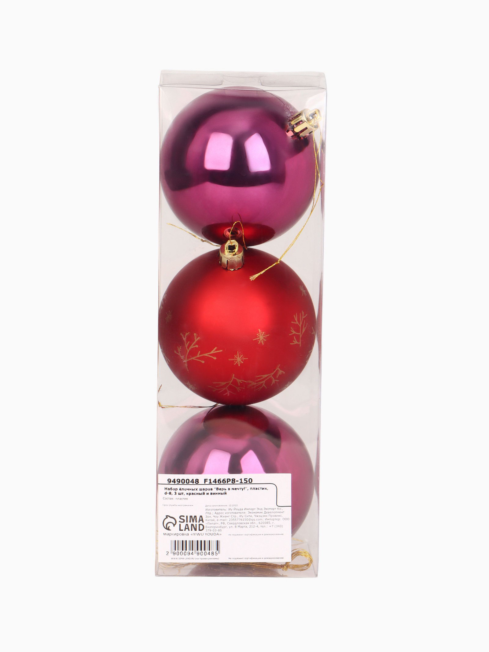 Шары ёлочные новогодние "Верь в мечту!", пластик, d=8, 3 шт., красные, винные, 8x8x24 см., Сима-ленд, Китай