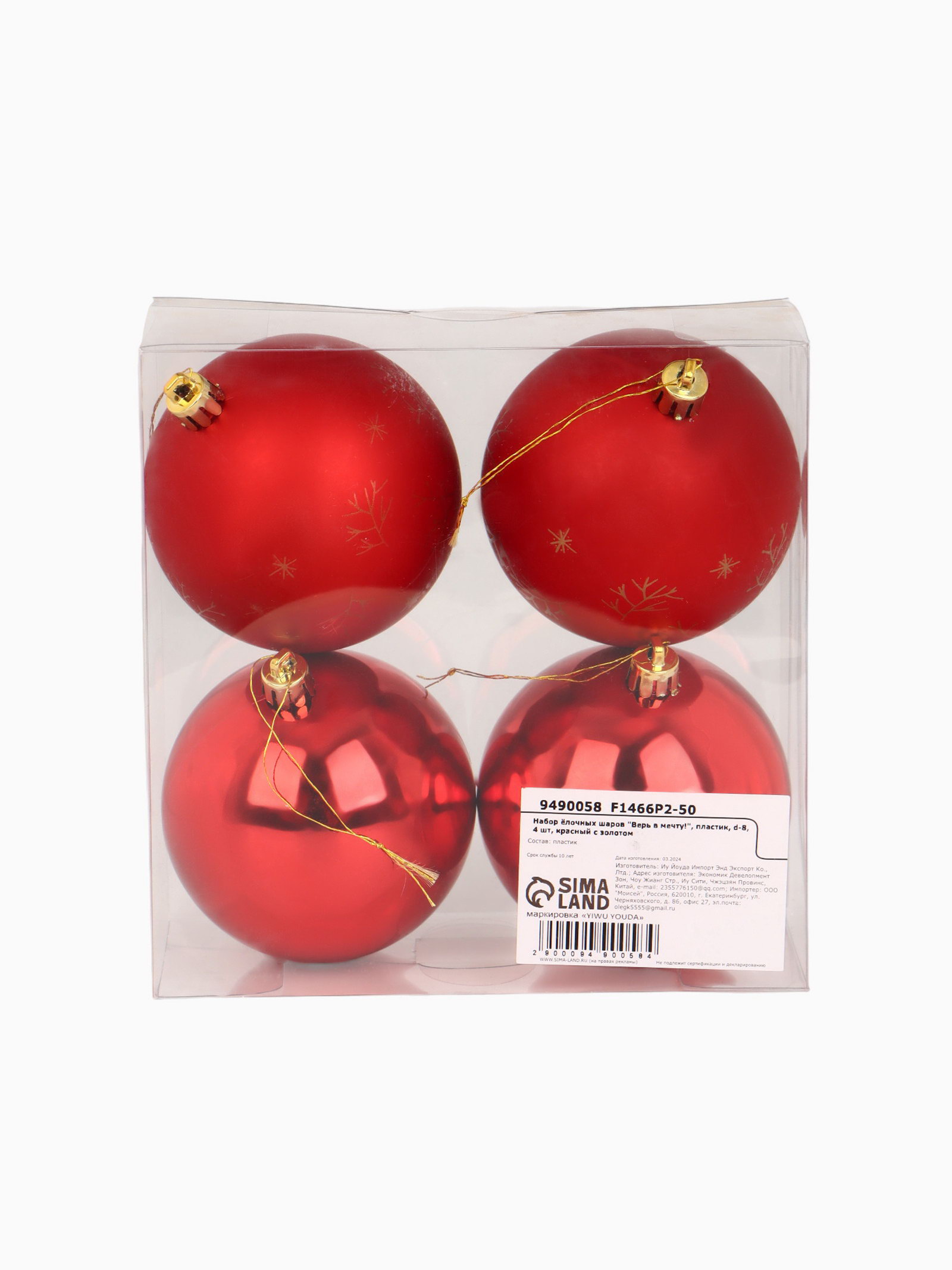Шары ёлочные новогодние "Верь в мечту!", пластик, d=8, 4 шт., красные, 8x16x16 см., Сима-ленд, Китай