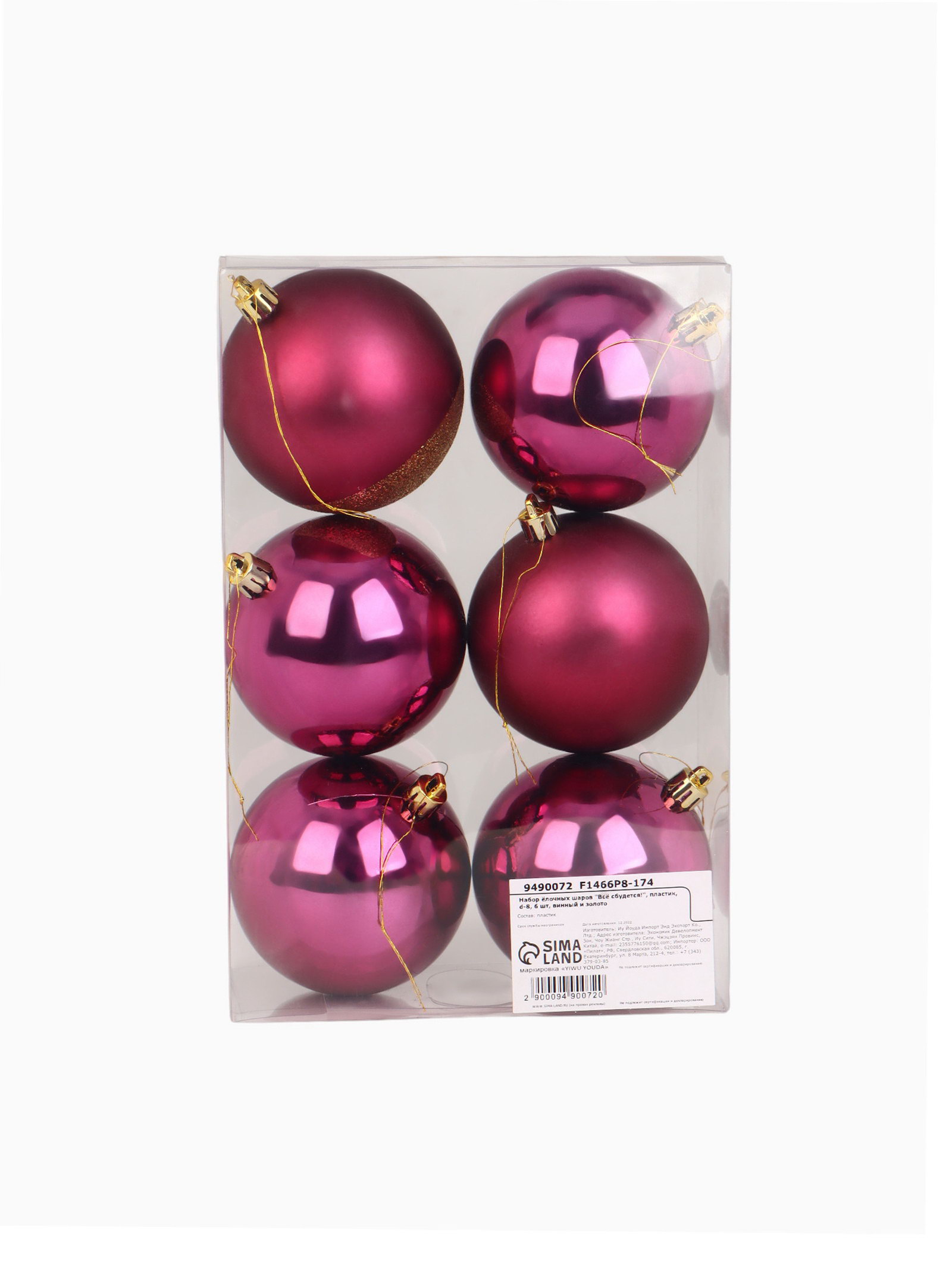 Шары ёлочные новогодние "Всё сбудется!", пластик, d=8, 6 шт., винный, 8x16x24 см., Сима-ленд, Китай